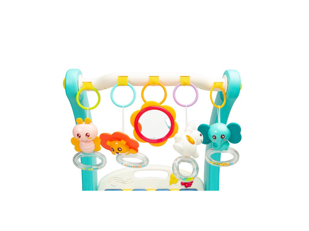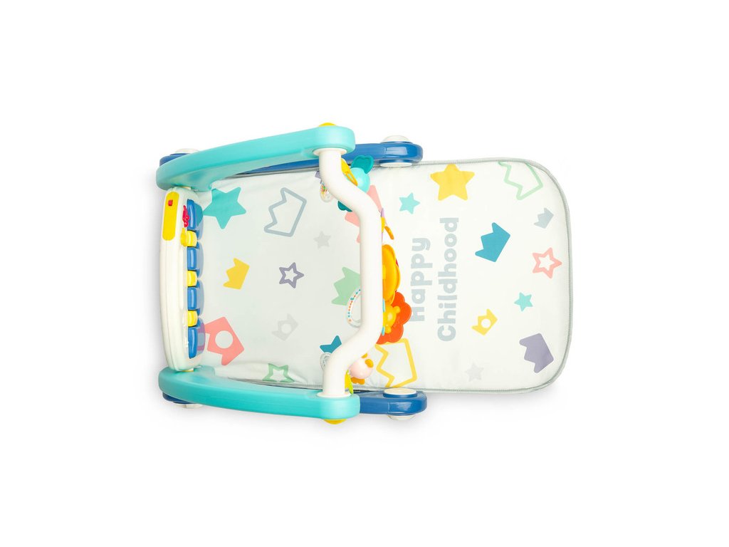 Walker s hudební podložkou 2v1 je barevná hračka pro děti, které dělají své první krůčky. Rohož je vybavena čelenkou s chrastítky zavěšenými na ní ve tvaru přátelských zvířat a zrcadlem, které potěší dítě. Po uvolnění předních kol a odpojení podložky může dítě bez problémů řídit svůj tlačný vozík. Multimediální panel s velkými tlačítky zpříjemní hru a smyslové hračky namontované po stranách pomohou při vývoji dítěte. Hračka je vhodná pro děti od prvních okamžiků života.