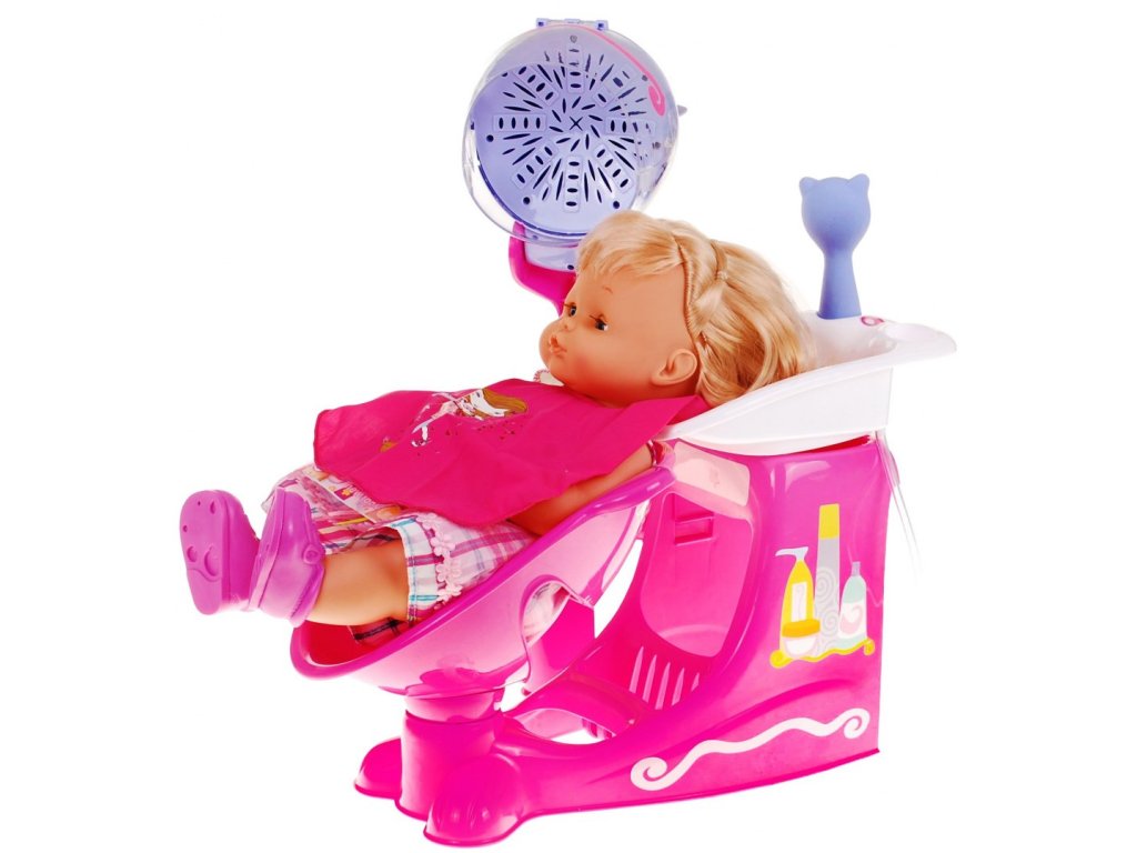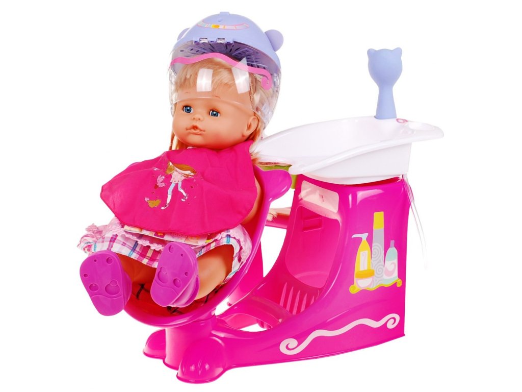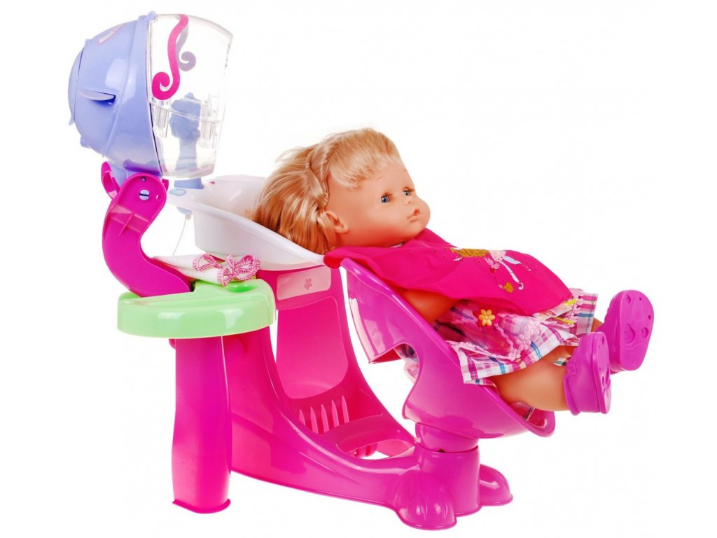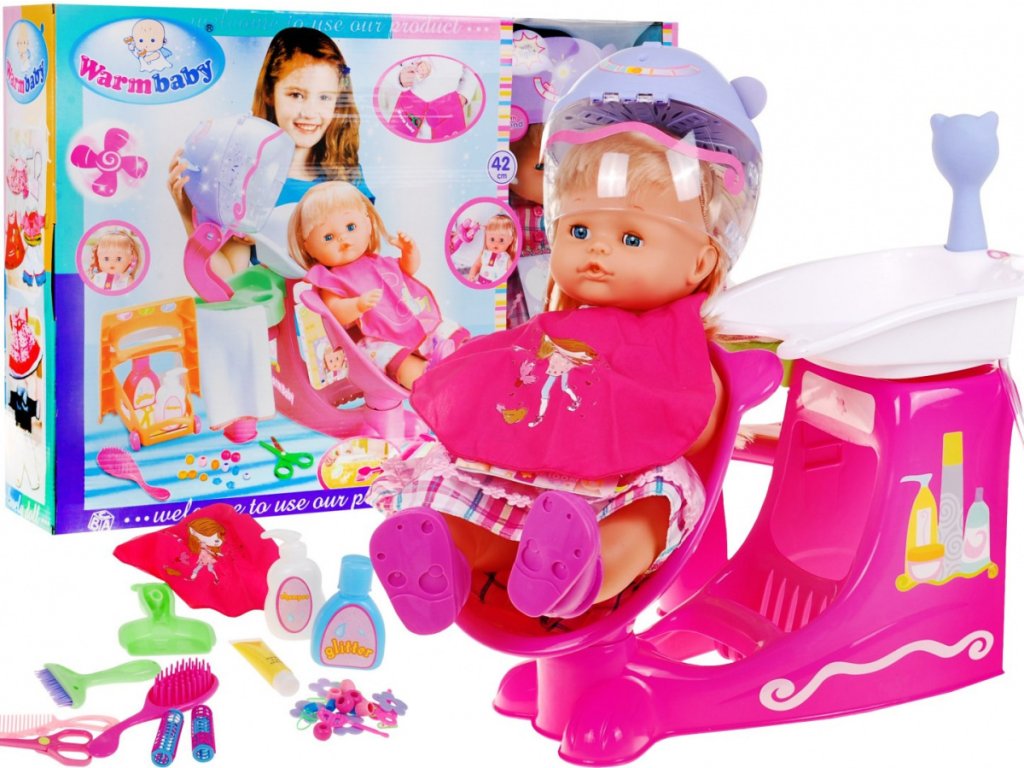 | A hairdresser's salon with a doll attached to it, which is a great imitation of a salon client. You can wear it and choose various accessories for styling your hair. The right set for a great idea for a unique gift for every girl An additional attraction are movable elements of the set: a swivel chair, a raised basin and an AA battery dryer (2 x 1.5V) - not included |