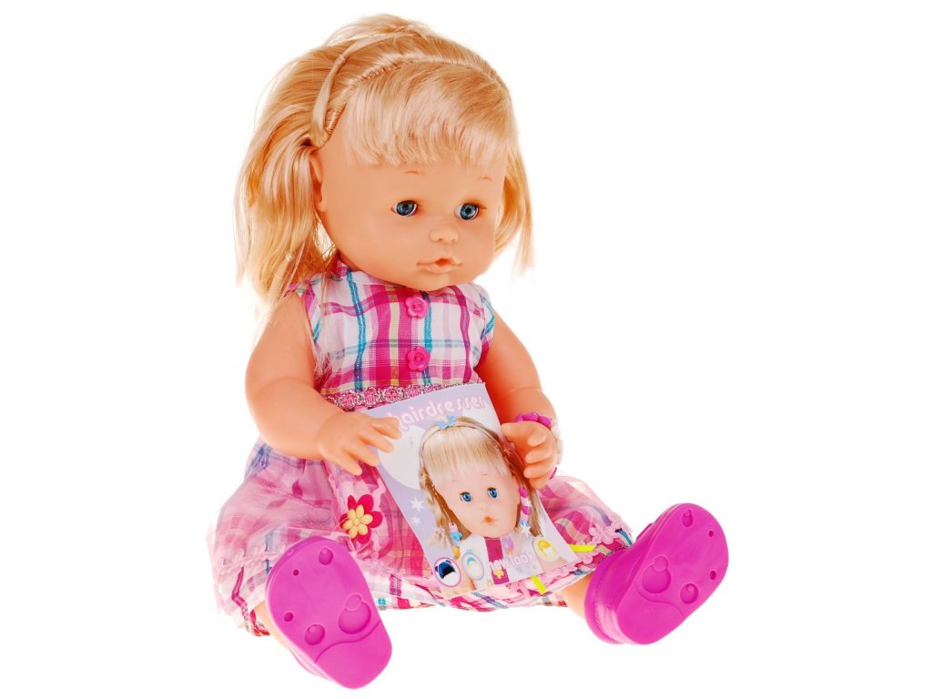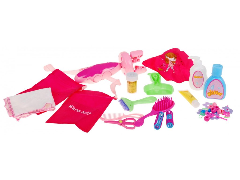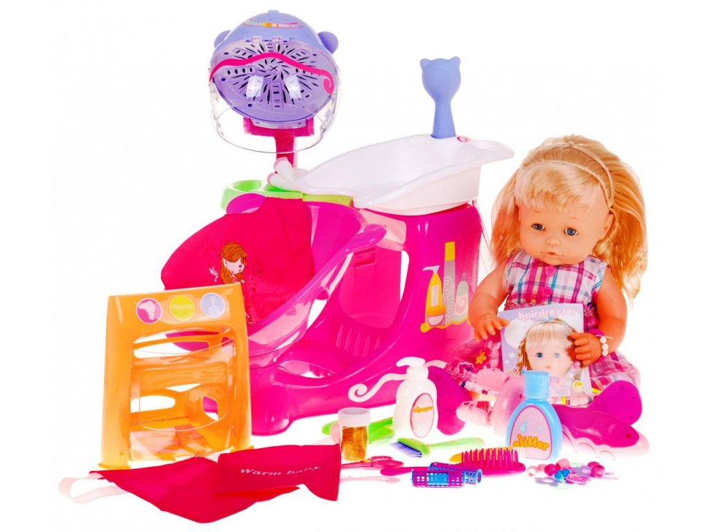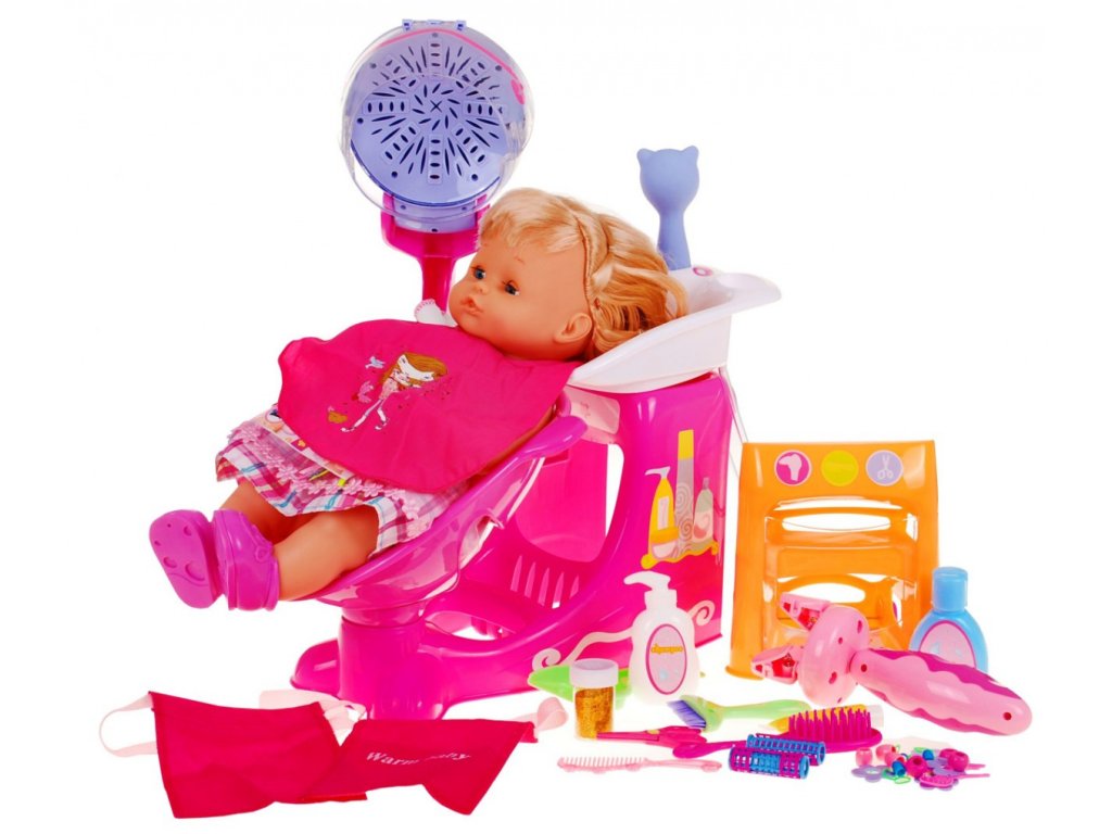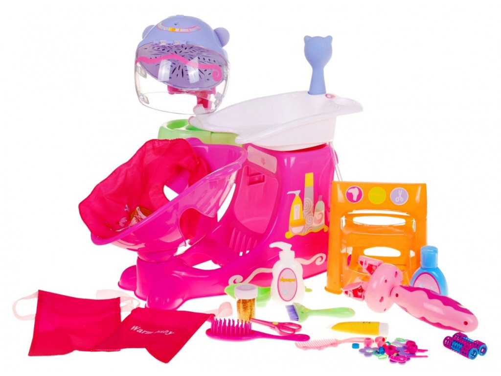 - plant - hairdressing salon (sink with shower, large dryer, movable chair, mirror, numerous shelves for various accessories), - doll - hair accessories (erasers, beads, hairpins, rollers, glitter, brightener with glitter), - trolley on wheels with an accessories shelf, - cape, - a towel - hairdresser's belt for tools, - hairdressing tools (braid plaiting machine, scissors, comb, brush, brush and scoop, shampoo, conditioner). |
