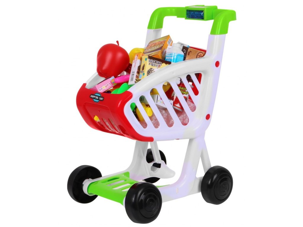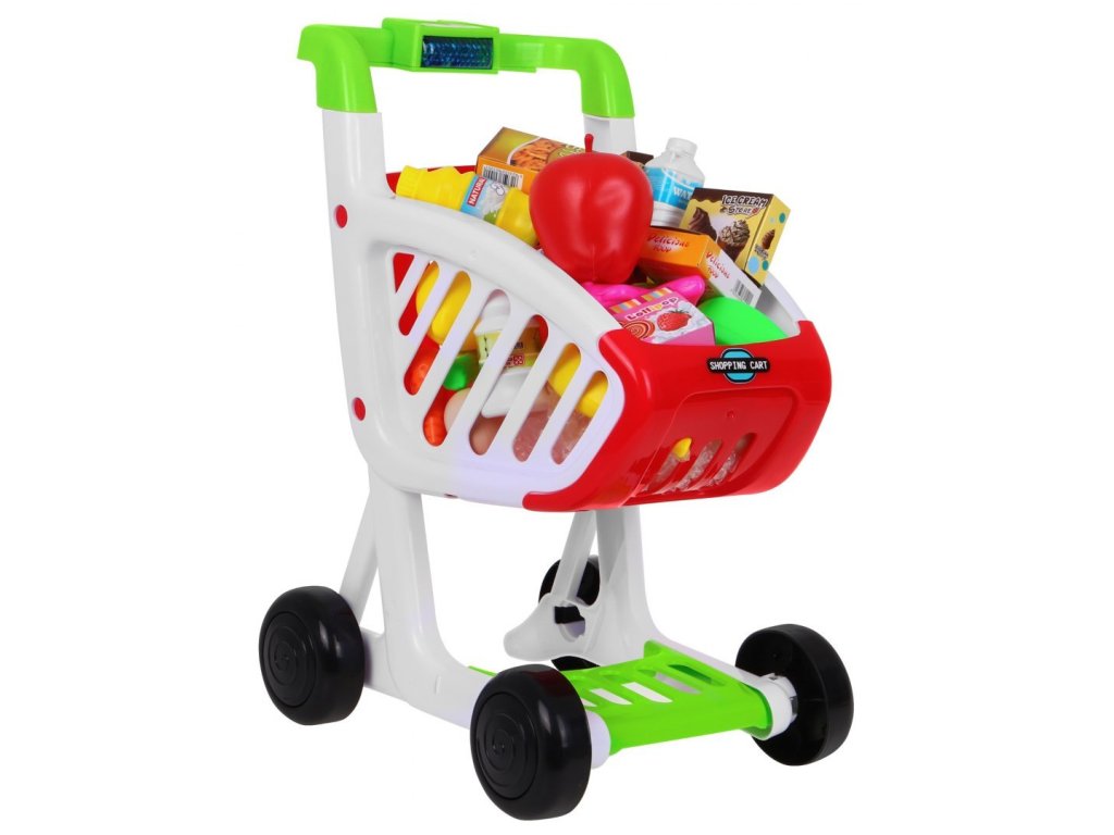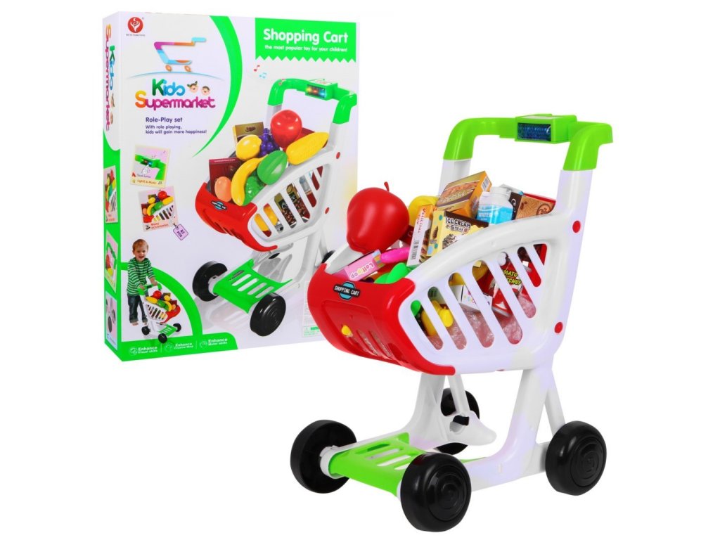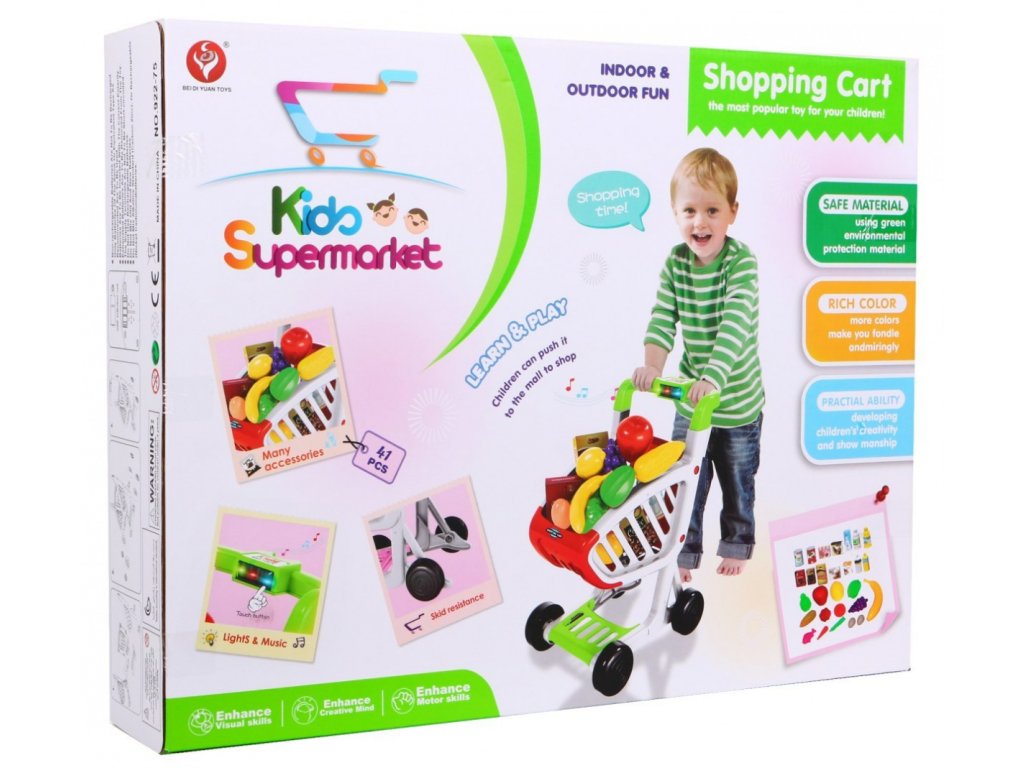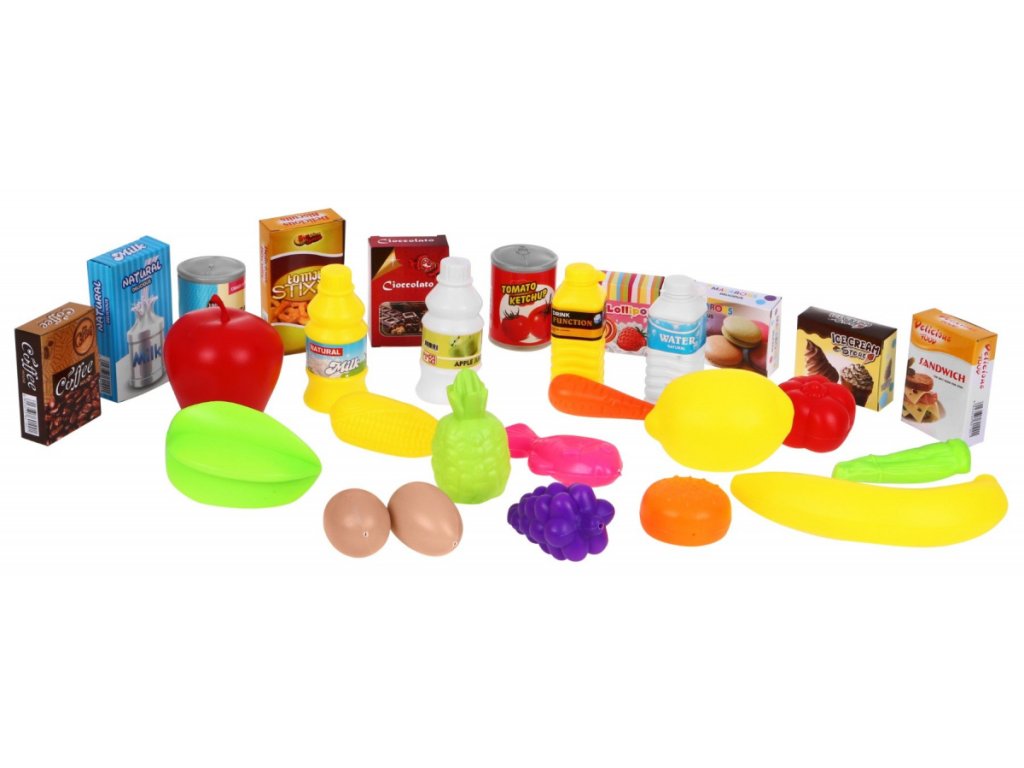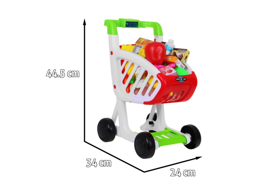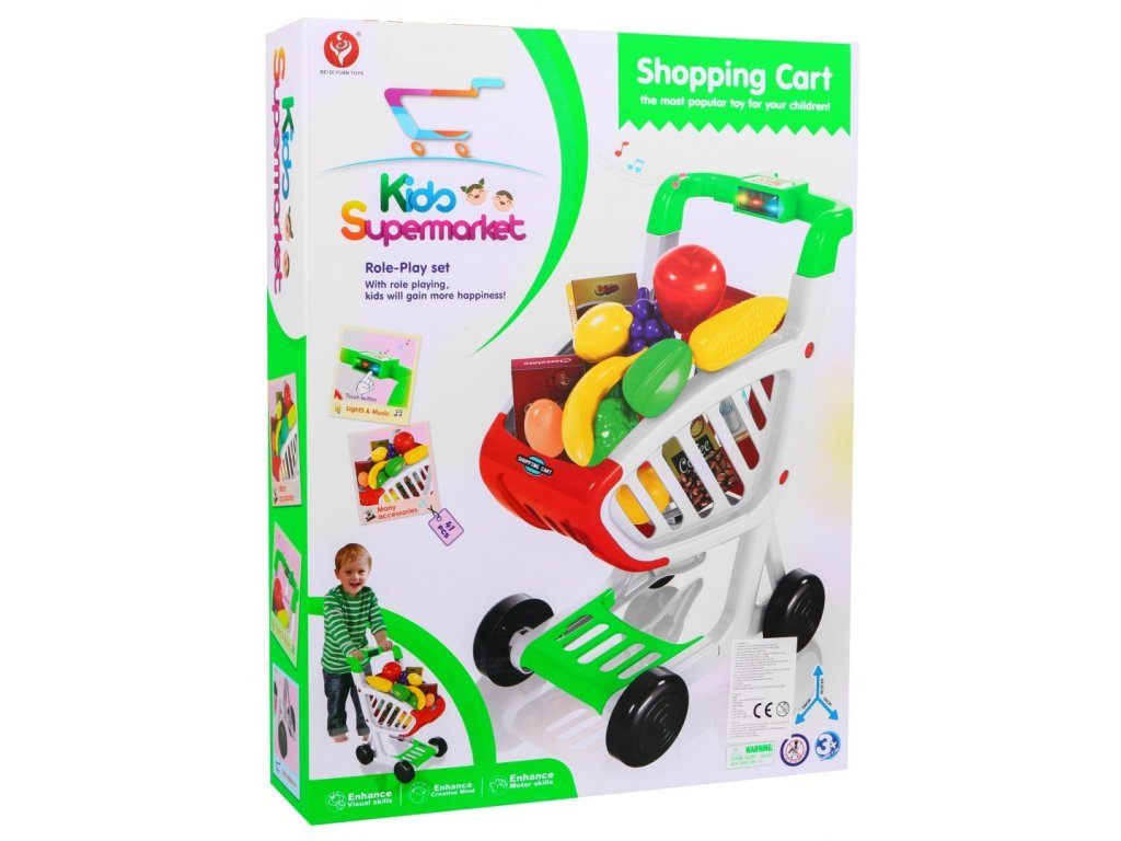 - self-assembly trolley, - large accessories in the amount of 41 pieces: - fruits min. lemon, banana, grape, apple, pineapple, - vegetables, min. maize, carrot, pumpkin, leek, - fish, - eggs, - canned dish, rice with chicken, - ketchup, - milk, - a drink, - water in a bottle, - apple juice, - cartons with milk, chocolate, coffee, ice cream, cookies, etc. - stickers. | |