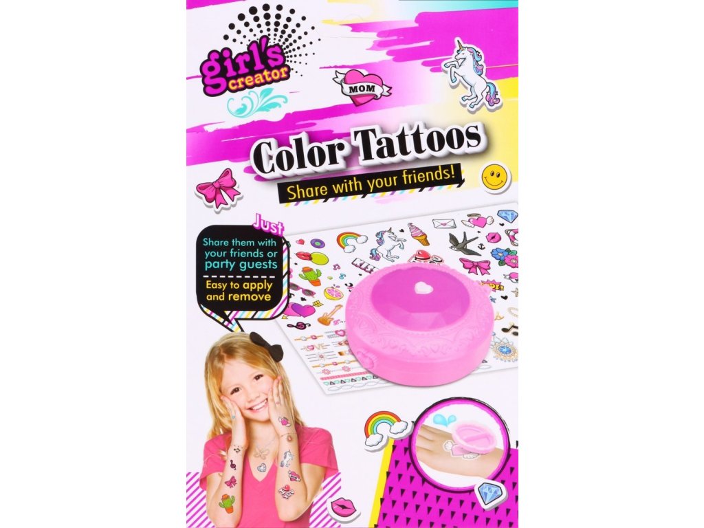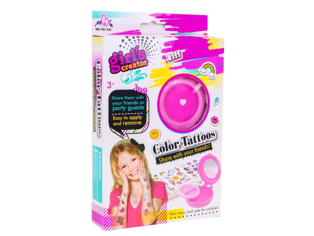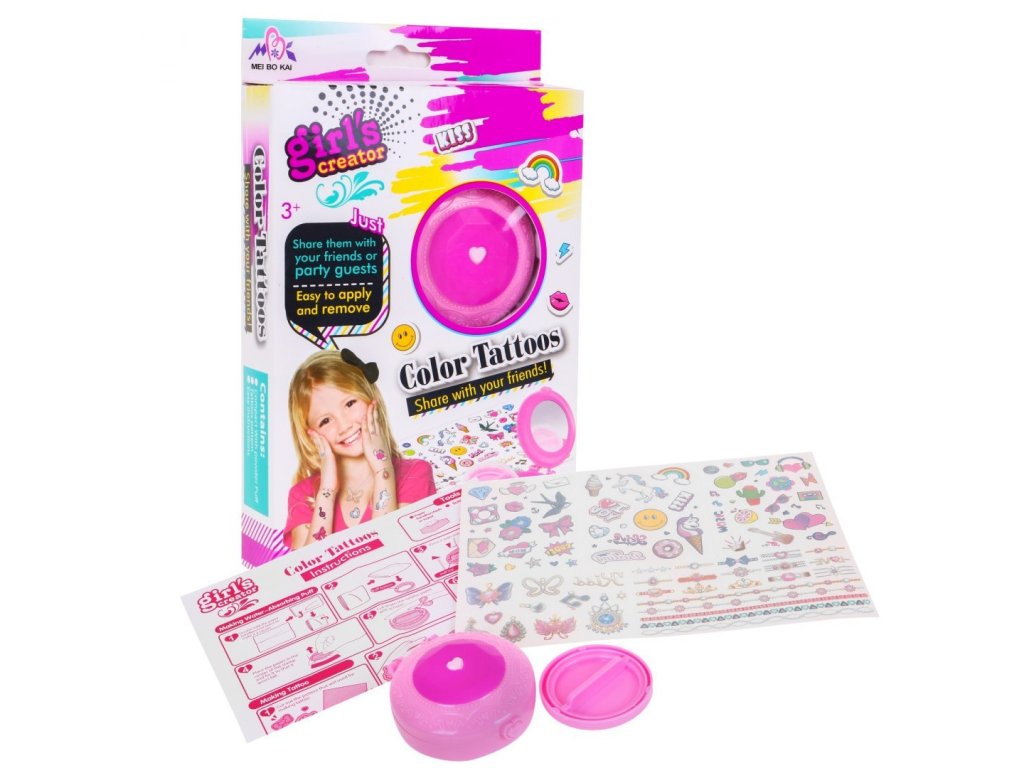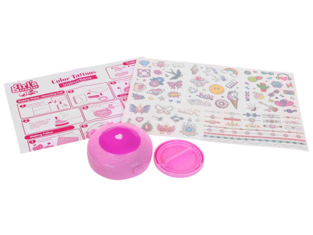 | We present a set for making tattoos. With this set, your child will be decorating his body in an easy and fast way. You will only need paper or tissues and scissors. Fold the handkerchief into a square and put it between the bottom and the lid of the set. The wipe must be moist. We cut out any tattoos from the tattoo card, we take off the transparent paper and apply it to the body. Then, press the small circle with a handkerchief. Moments of checks and we already have a beautiful tattoo. The set also includes a small casket with a mirror and a lid. The tattoo can be easily removed with water and soap or an adhesive plaster. The elements of the set are in pink, loved by little ladies. Intended for children over 3 years of age, the toy has a CE certificate. |