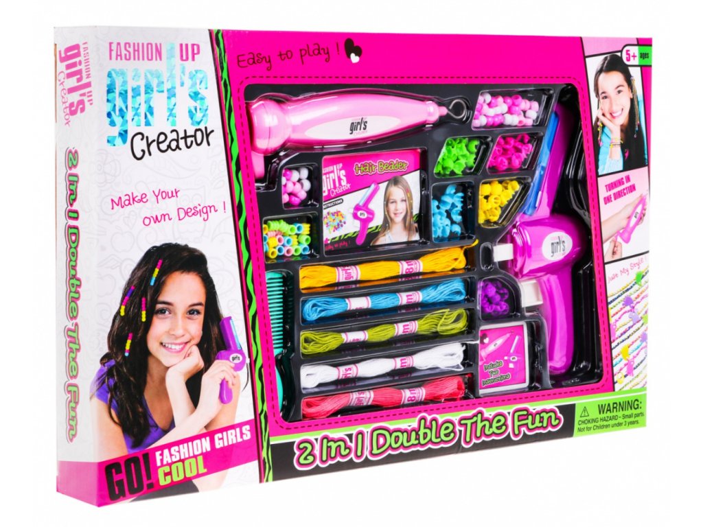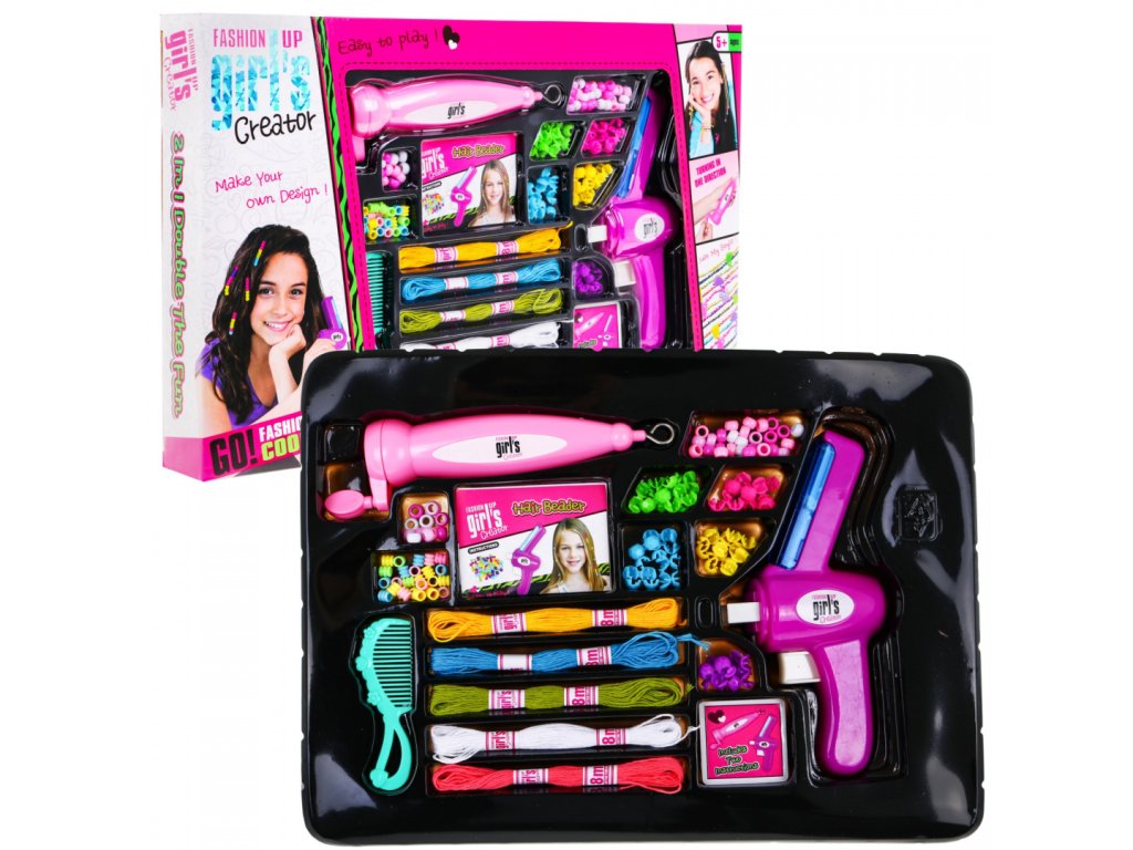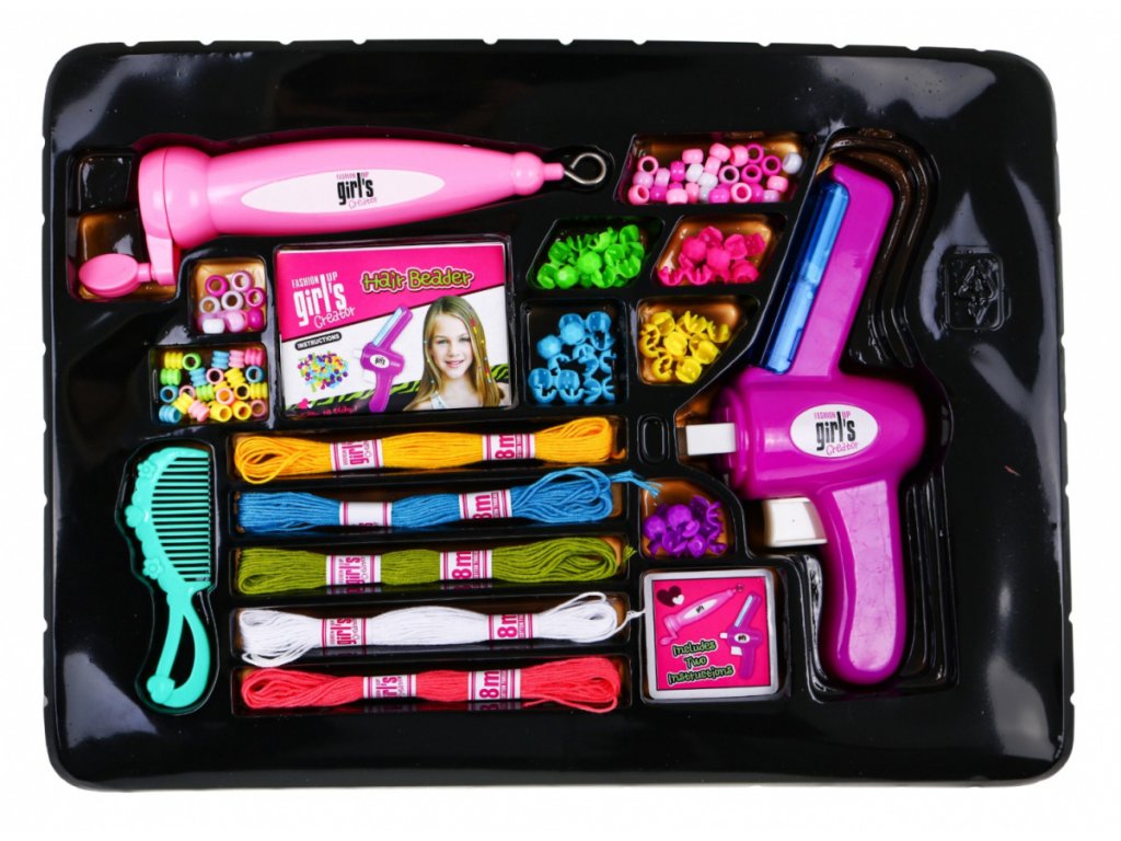 - comb, - a device for braiding the strings, - threading machine, - a set of 4 types of colored, cotton strings, - a set of zipped beads, - a set of traditional beads, - a set of beads for hair-pulling, - a set of hanging letters, - pictorial instruction. |