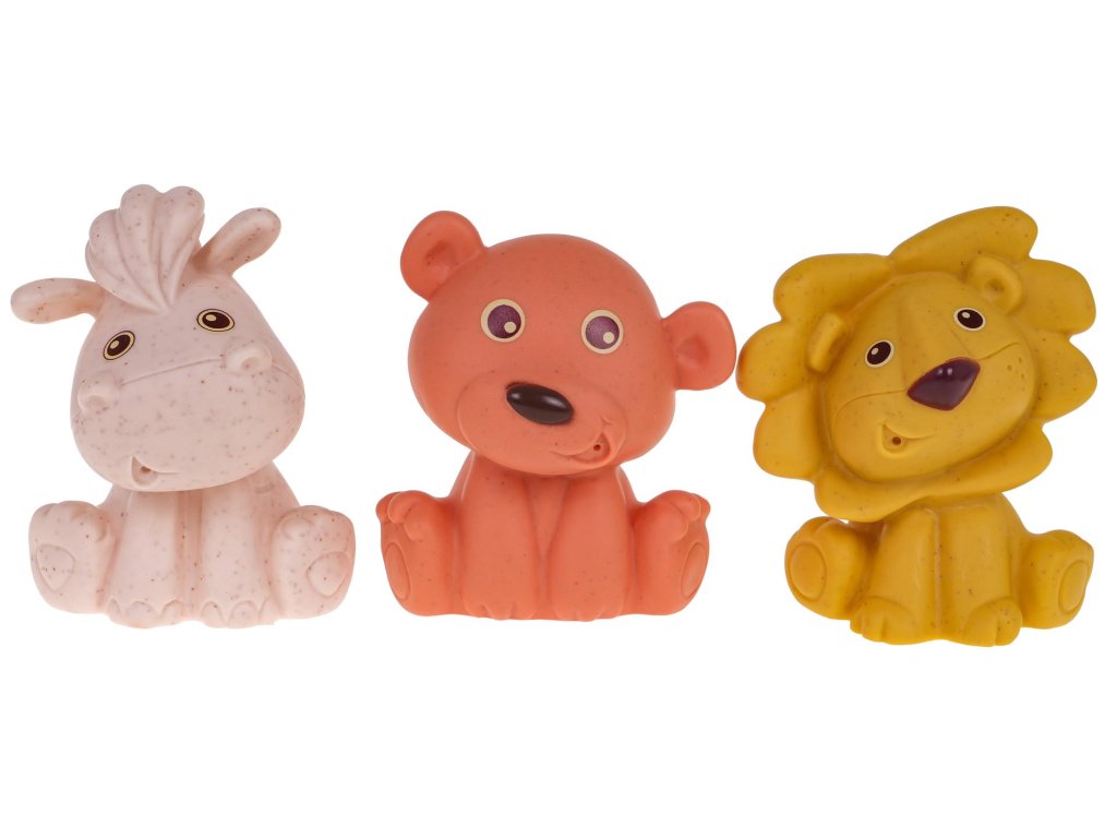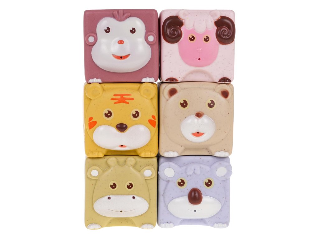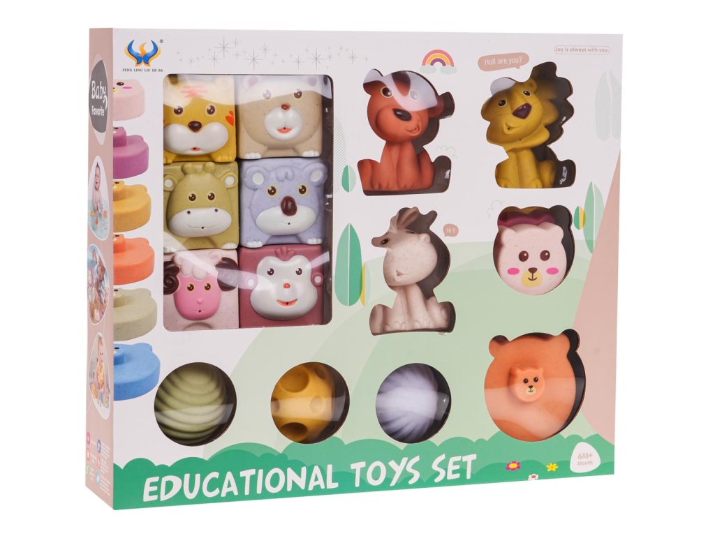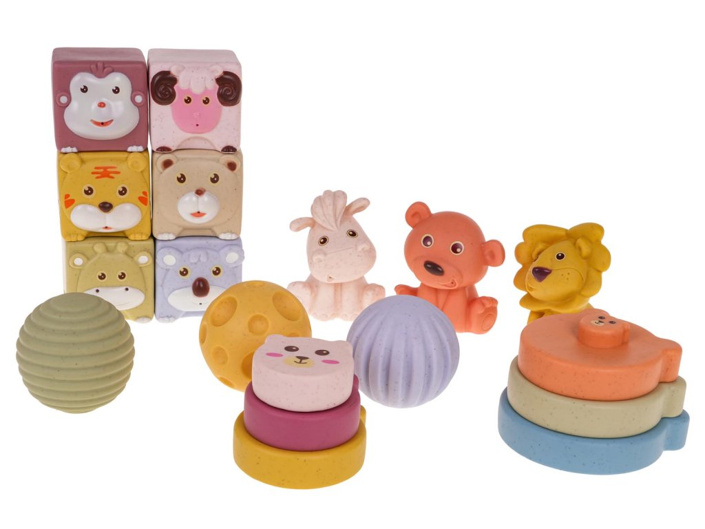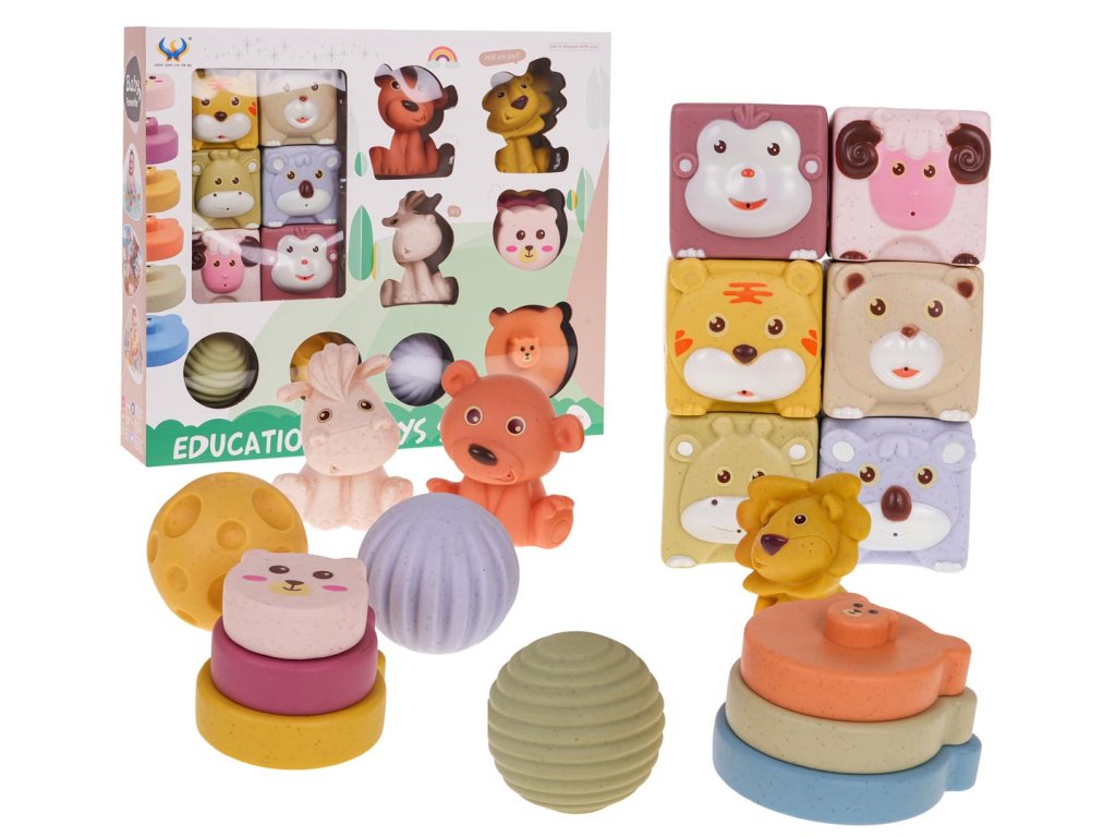 - 6 animal cubes with different textures and colors: monkey, sheep, tiger, bear, deer, koala - 3 sensory balls of different textures and colors with a whistle inside, - 3 animals: donkey, bear, lion, - 6 bear-shaped construction elements for building a tower. |