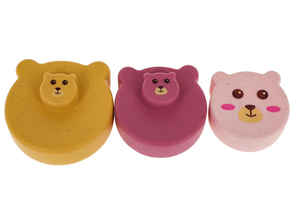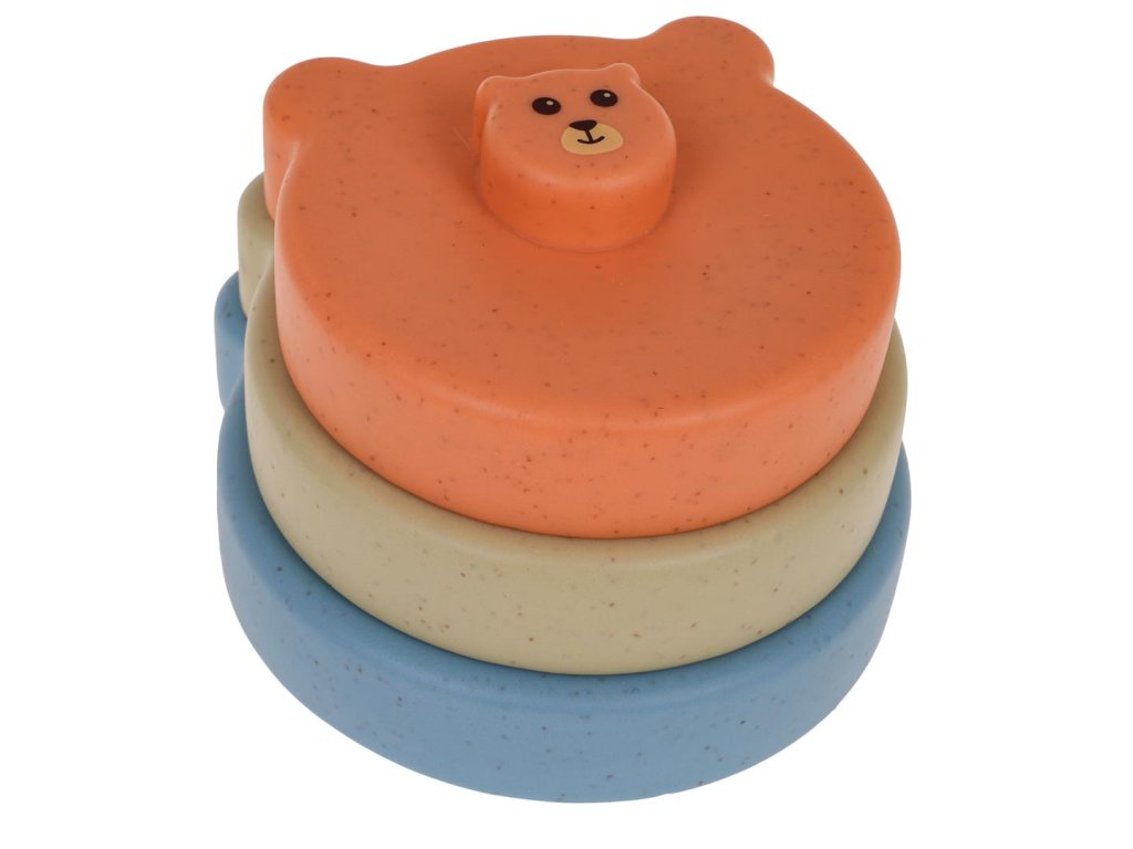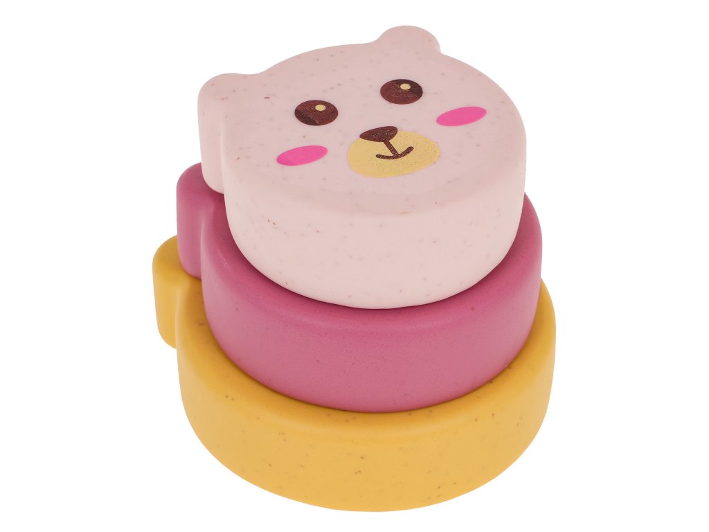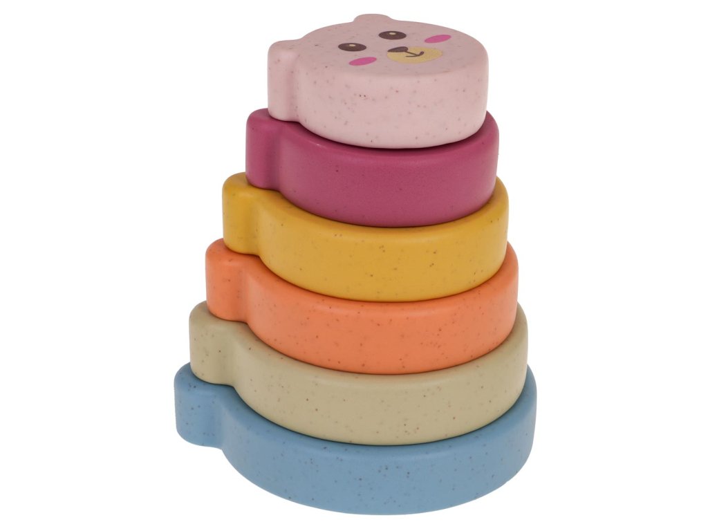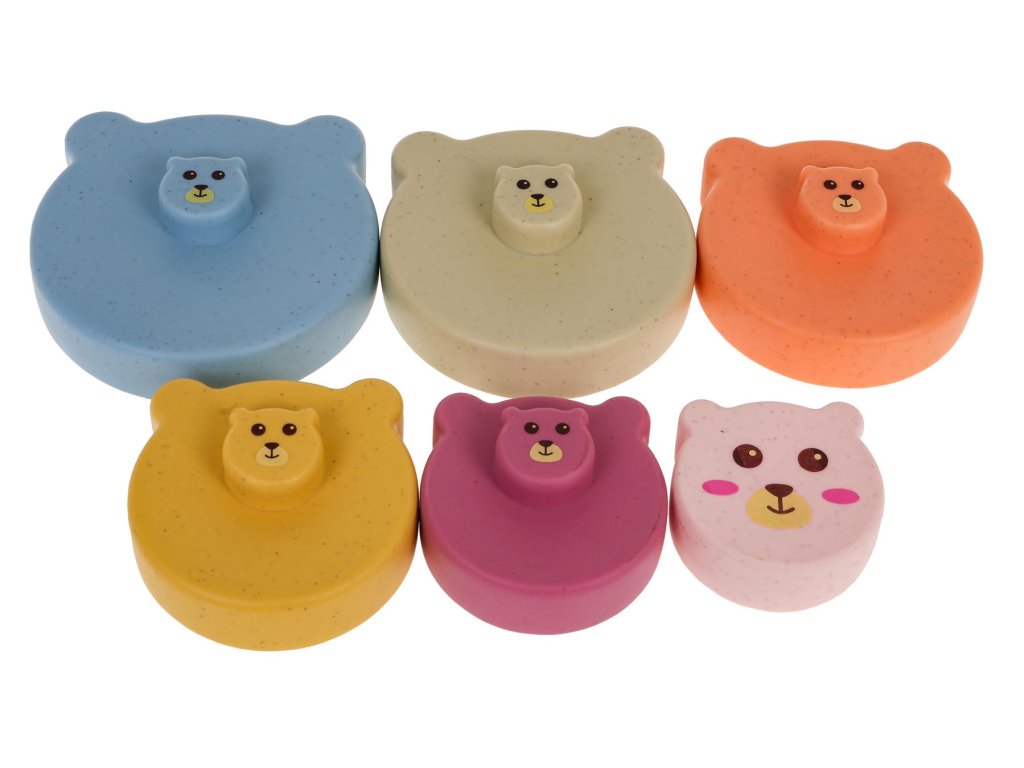 - 6 animal cubes with different textures and colors: monkey, sheep, tiger, bear, deer, koala - 3 sensory balls of different textures and colors with a whistle inside, - 3 animals: donkey, bear, lion, - 6 bear-shaped construction elements for building a tower. |