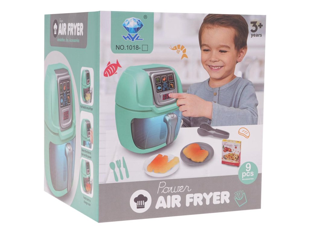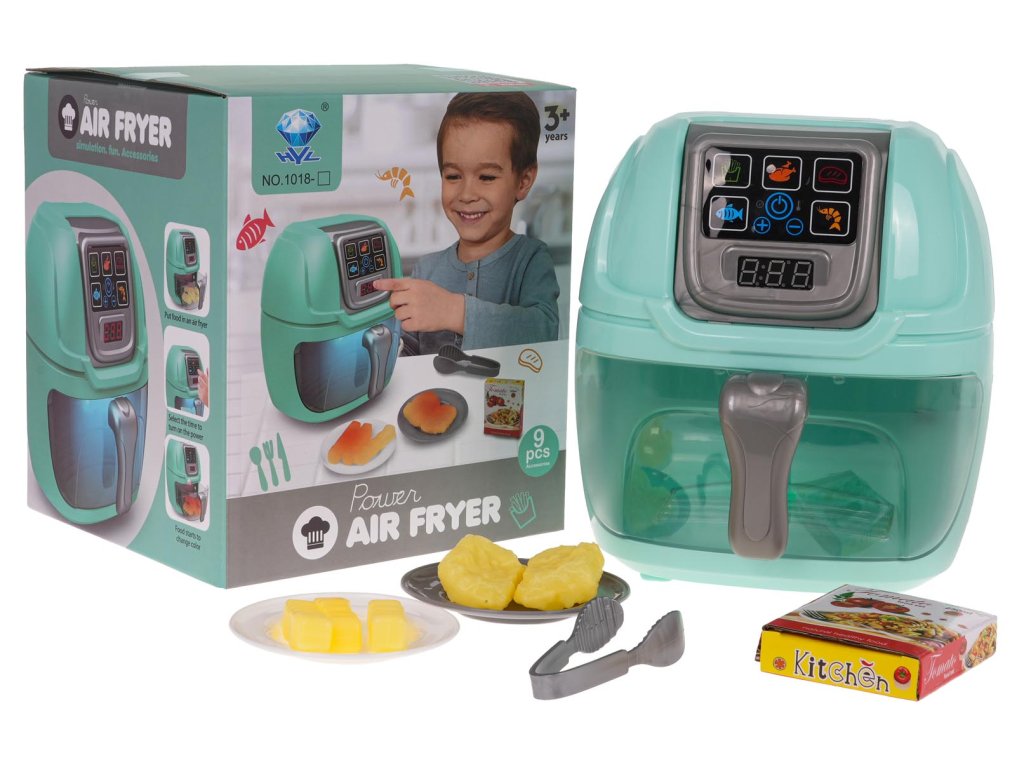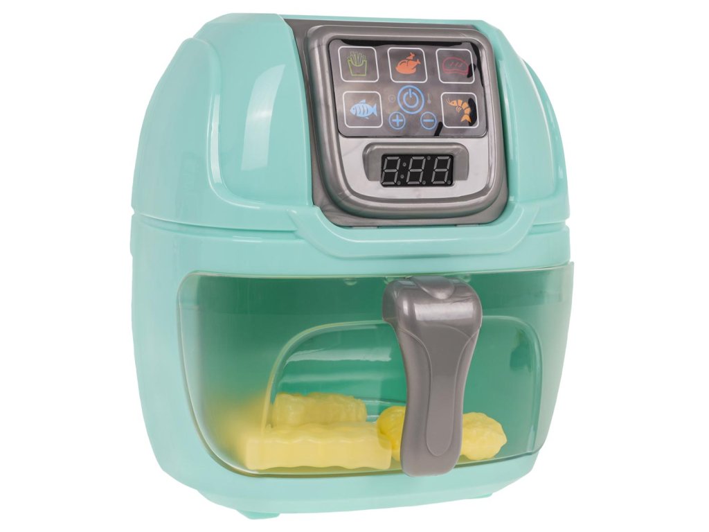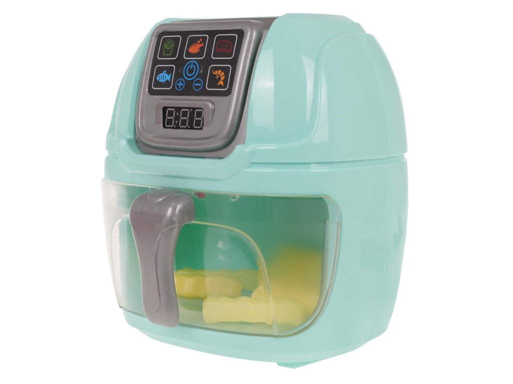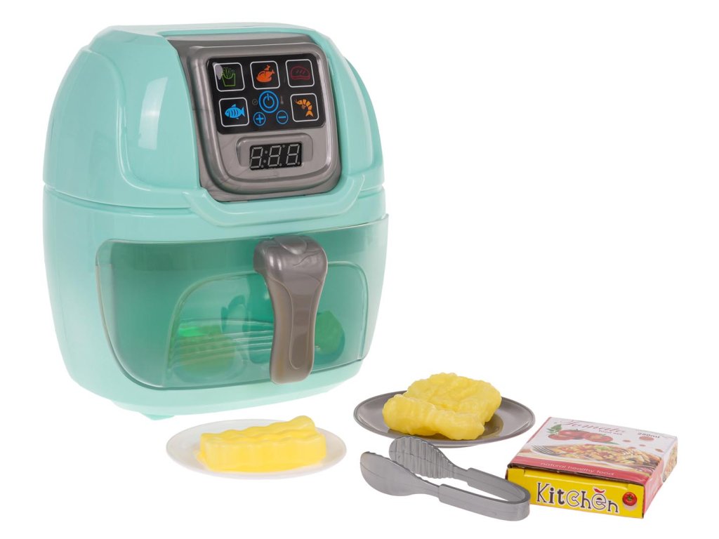 Interactive Airfryer with sound and light effects for children from 3 years of age. The toy is made of the best materials, with attention to detail. The display shows the preparation time of a given dish. An additional attraction of the toy is that the food imitations inserted into it change color thanks to the diode lights located in the upper part of the airfryer drawer . The set includes accessories such as tongs, fries, a cutlet, plates. The toy is powered by 3 x AA 1.5 V batteries (not included).
