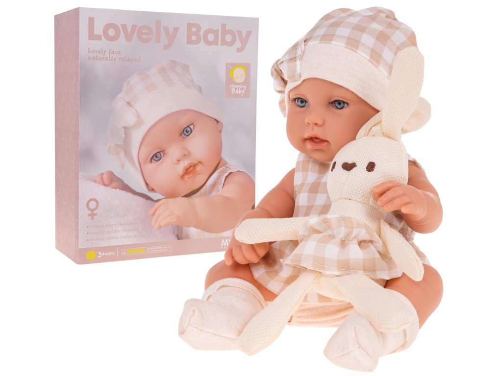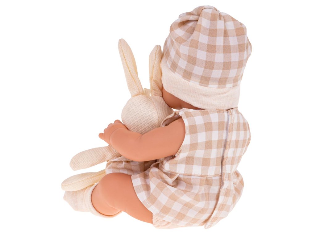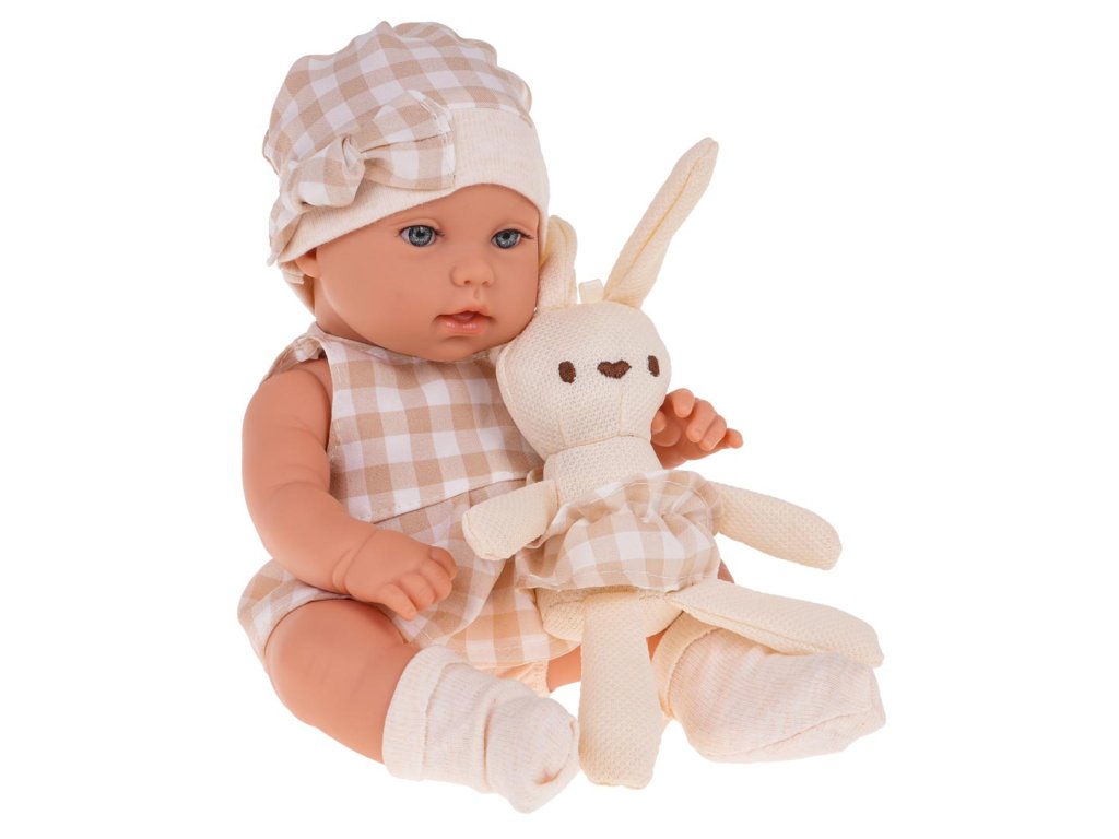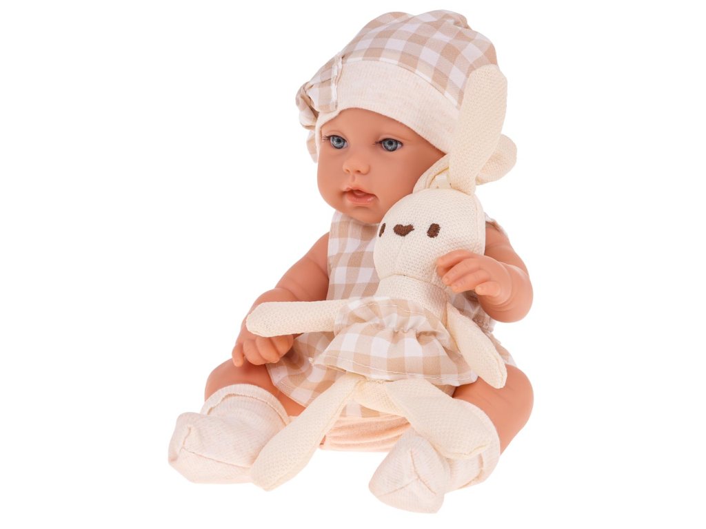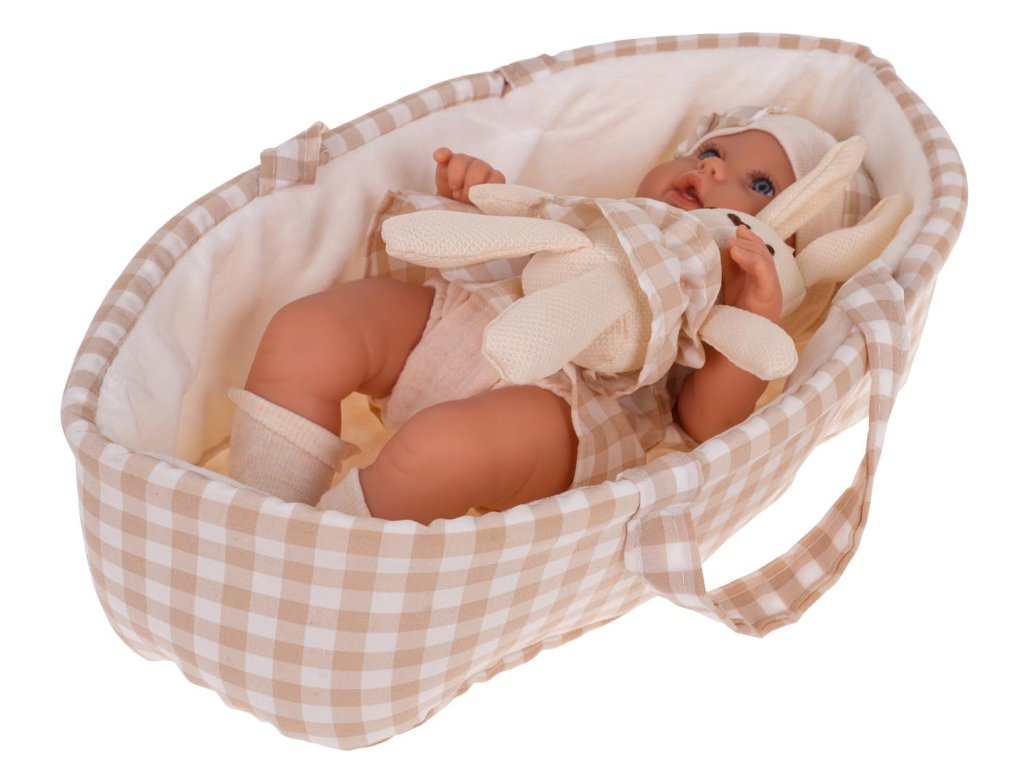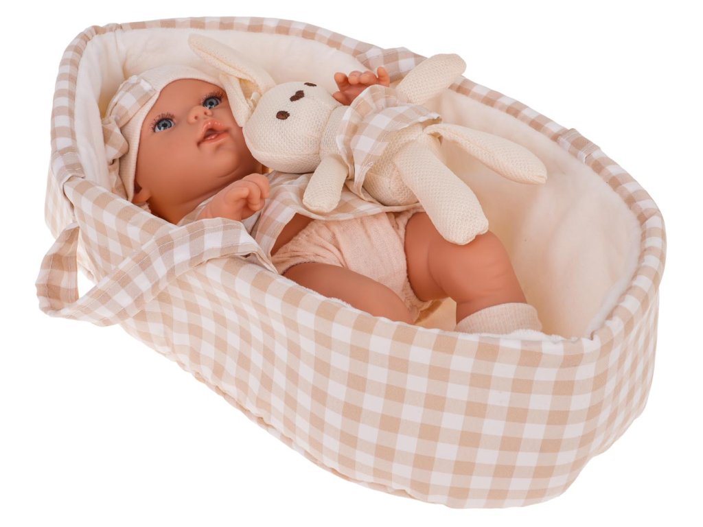 Baby doll set with accessories for children from 3 years of age. The set includes a beautiful baby in a dress with a cuddly bunny and a basket for carrying, so that your little one can take him everywhere with them. The baby doll is perfectly finished, with attention to every detail and completely safe for the child. It has a removable dress, hat, panties and socks. Movable legs and arms make changing easier. The toy stimulates the child's motor development.