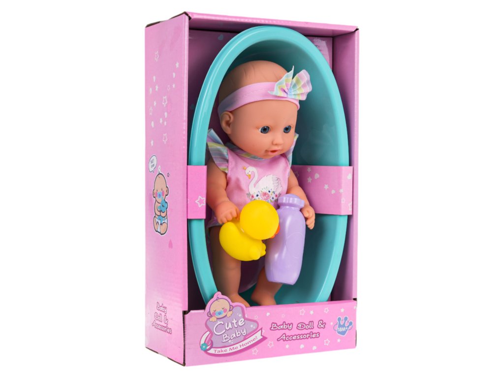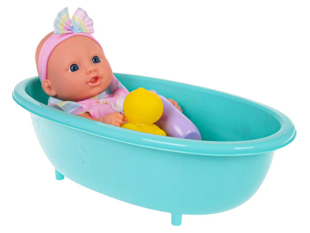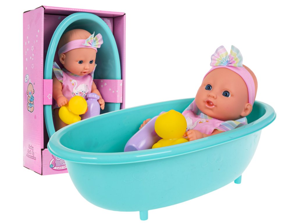 Doll, baby with a bathtub, bath liquid and duck for children from 18 months of age. Beautiful doll is dressed in a colorful bodysuit and has a headband. Your little one will be able to bathe her and take care of her. The doll has a movable head, arms and legs. It is made of soft, pleasant to the touch material.