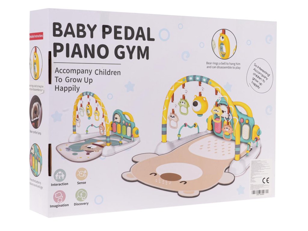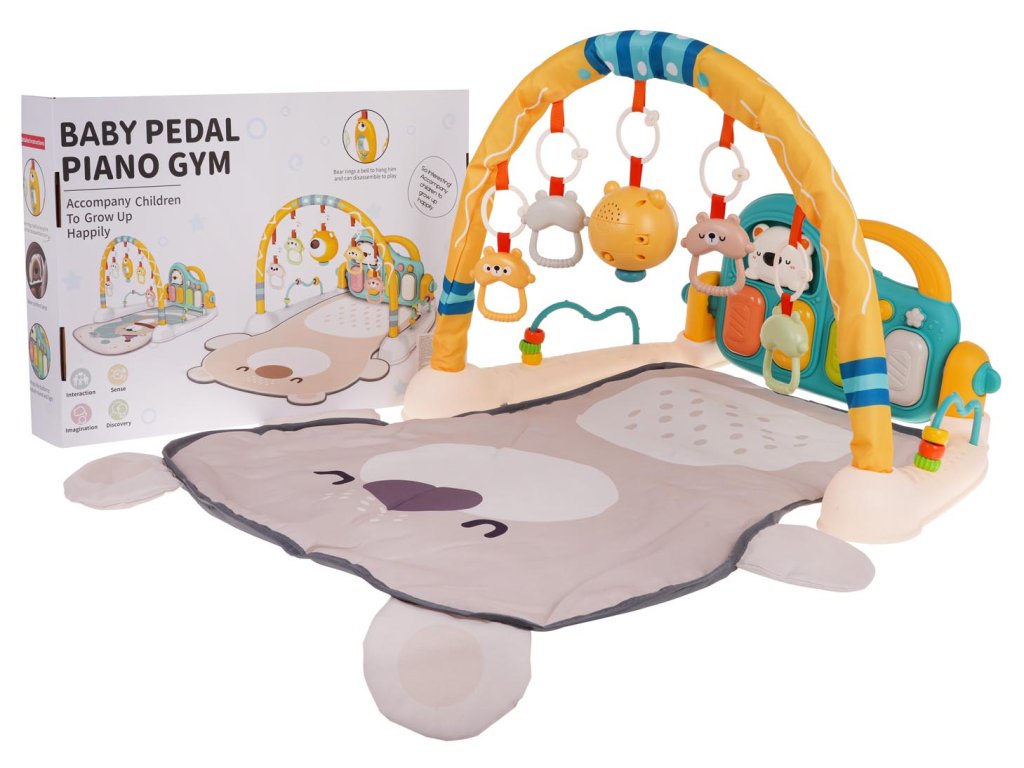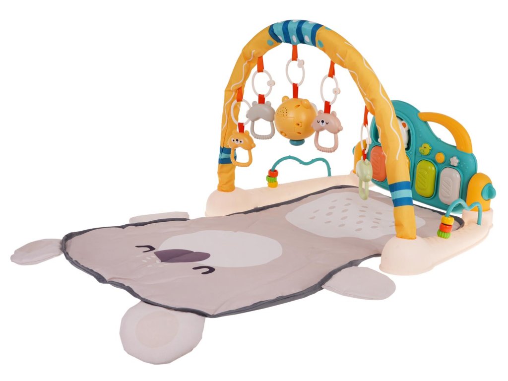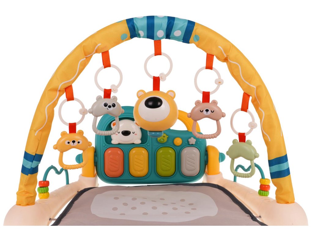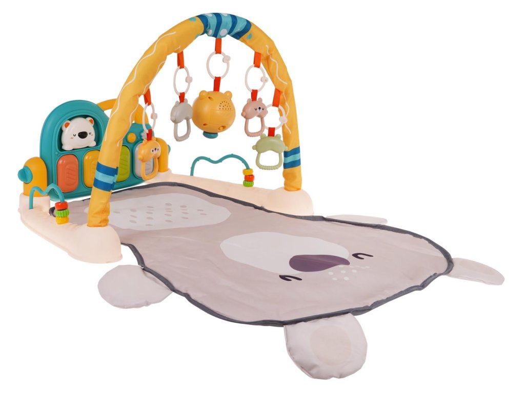 Interactive, multifunctional mat for the youngest from the first days of life. The set consists of a comfortable mat for a baby, a bar with pendants and a piano. The mat grows with the child. In the first period of life, up to the age of six months, the baby can lie on a comfortable mat, kicking the piano with its feet, and moving its hands trying to reach the pendants on the bar. Between the sixth and twelfth month, the set will be extremely helpful in learning to sit. An older child can already play the piano on its own. The piano can be very easily transformed into a music table using the adjustment buttons located on the side of the bar. We can tilt the piano in several positions, or detach it from the set and take it to different places. Additionally, the piano has a comfortable handle for carrying. The piano is equipped with four keys, each with a different melody and 2 buttons changing the functions of the piano from melody to notes. There is also an on/off switch and volume control. There are 5 pendants with bears on the bar, which also gently rattle. The middle bear also has lighting and sound functions. On the sides of the base there are beaded inserts. The piano is powered by 3 x AA 1.5 V batteries (not included), the pendant bear by 2 x AAA 1.5 V batteries.