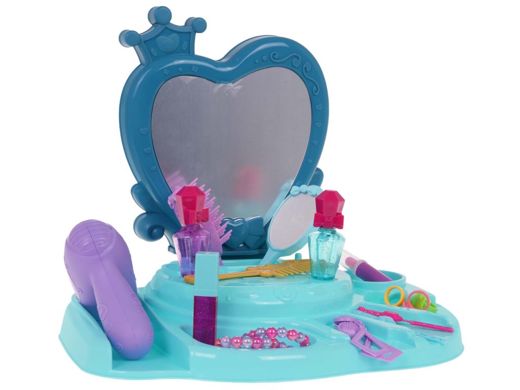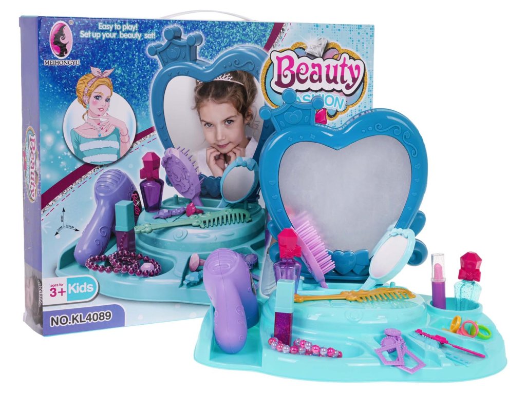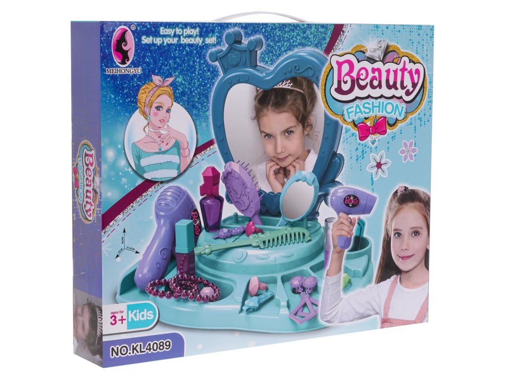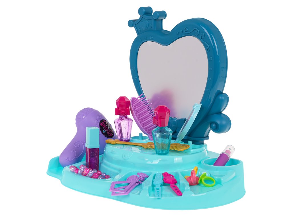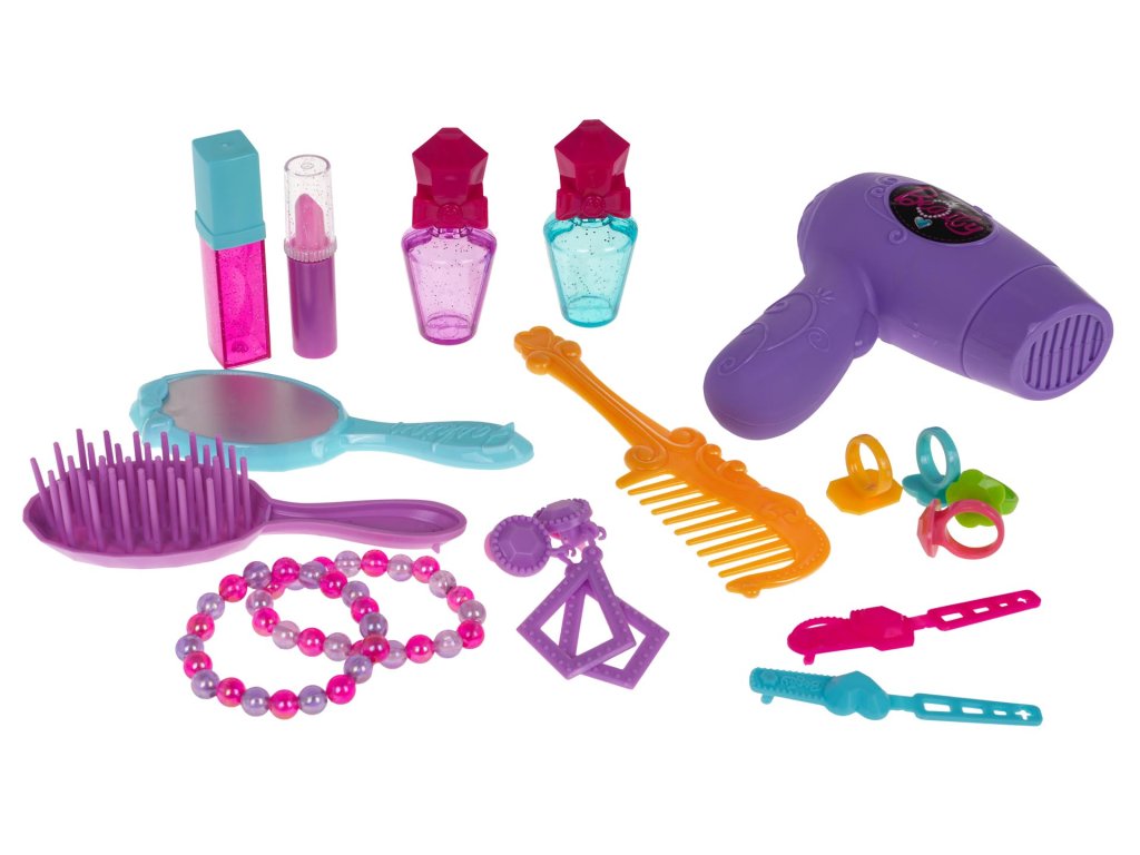- dressing table with mirror, - dryer (dummy), - comb, - hairbrush, - mirror, - fake lipstick, - 4 x ring, - 2 x perfume bottle, - earrings, - 2 x bracelet, - 2 x clip, - container. |