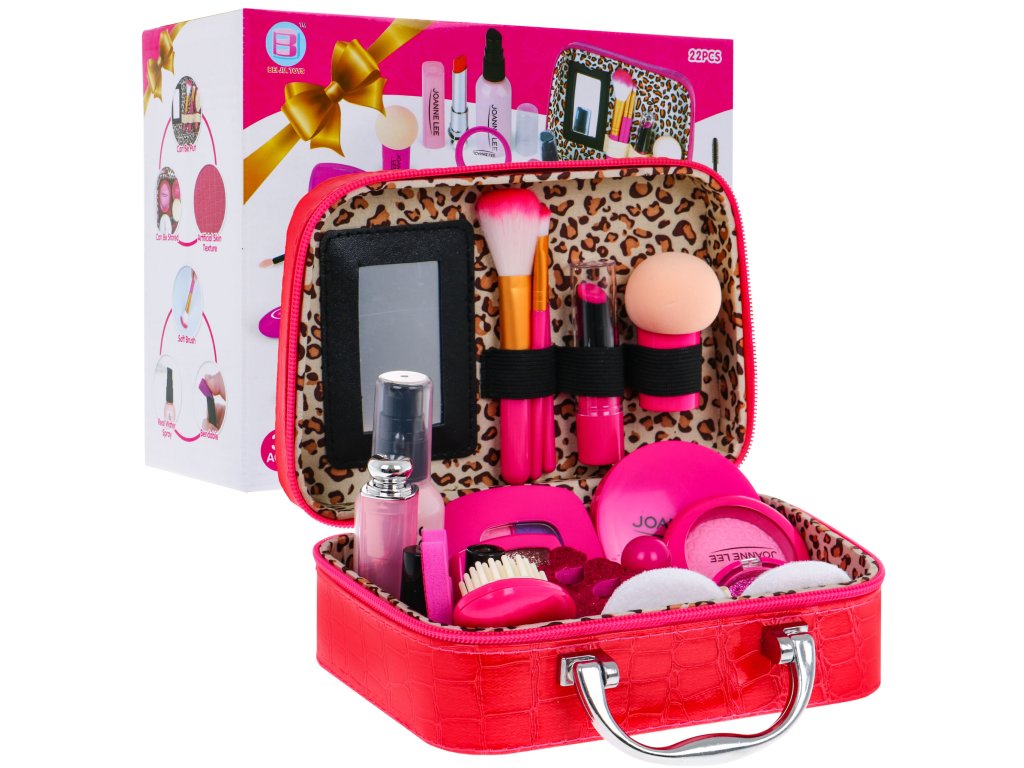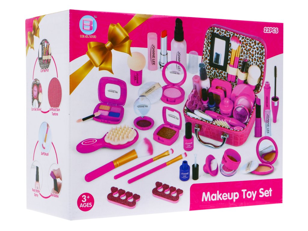 The set with a bag filled to the brim with safe make-up accessories is a toy for children from 3 years of age. The elegant and large suitcase is made of soft eco-leather. It has a comfortable handle, four feet on the bottom and an internal mirror. It is fastened with a zipper. The whole set consists of 22 elements, it includes cosmetics such as: shadows, glitters, lipsticks, nail polishes, mascara and many others. The cosmetics are dummy, but they look realistic, they won't wear out and the baby's skin will be safe. Playing with cosmetics develops creative thinking, exercises imagination, and supports concentration. | |