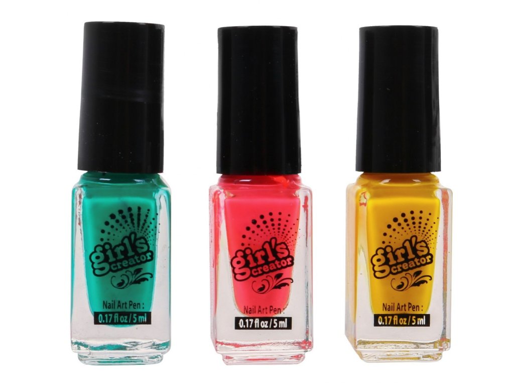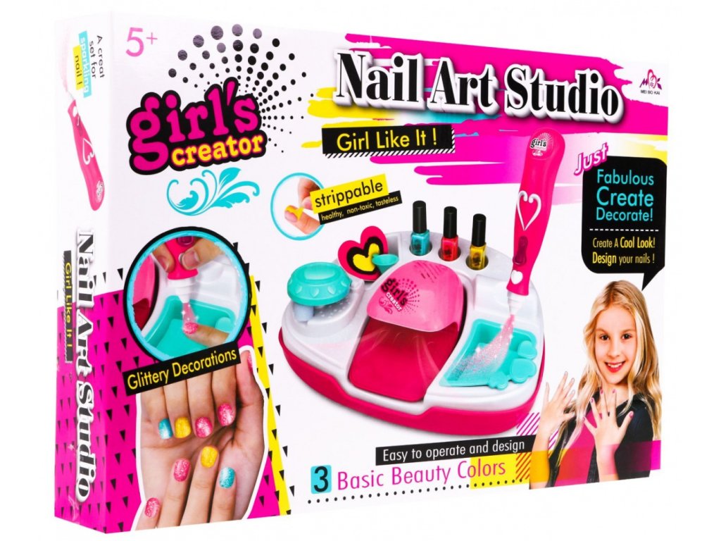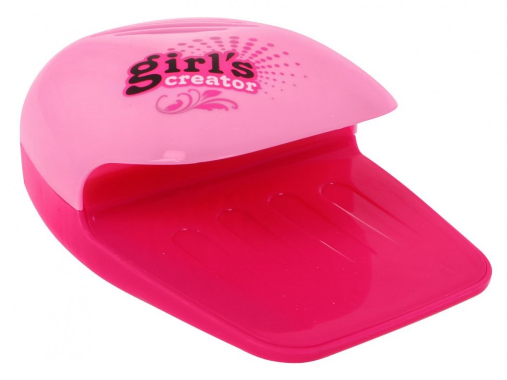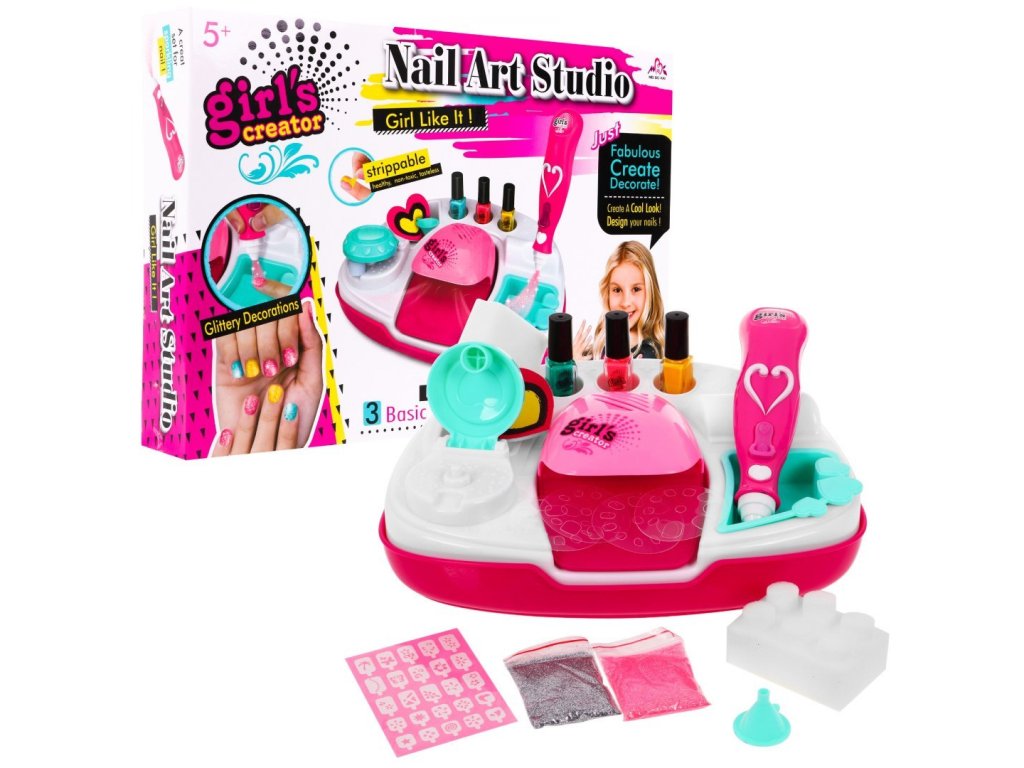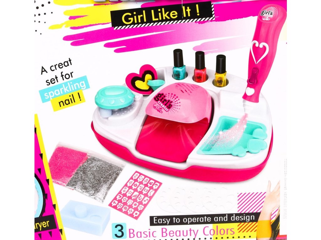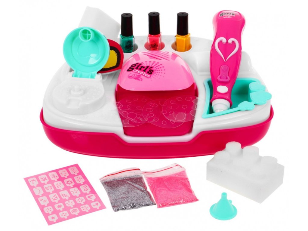 - a dressing table for painting accessories and a dryer, - battery powered nail dryer, - 3 nail polishes (green, yellow, pink), - glitter container, - glitter sprayer, battery operated, - funnel for glittering the device, - 4 circles and on them templates of various sizes and shapes of the nail, - a leaf of 25 patterned nail templates, - 2 sponges and on each, 6 removable rollers, - a nail file in the shape of a heart (about 6 cm x 5,5 cm), - 2 bags with glitter, | |