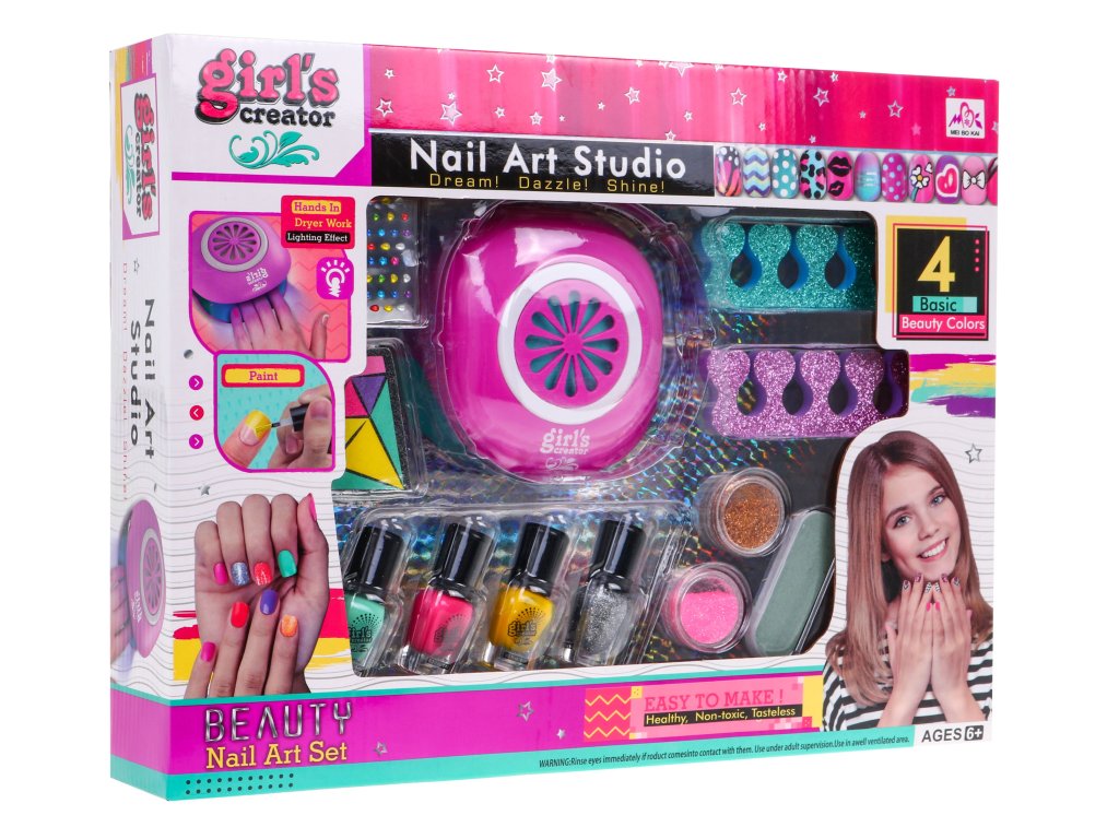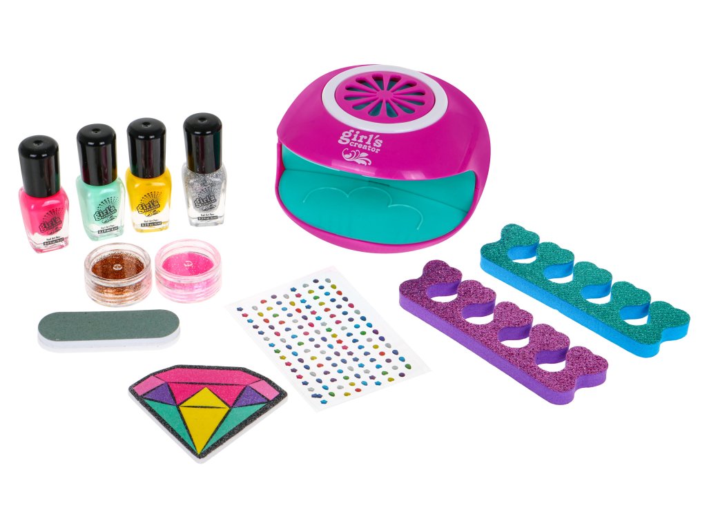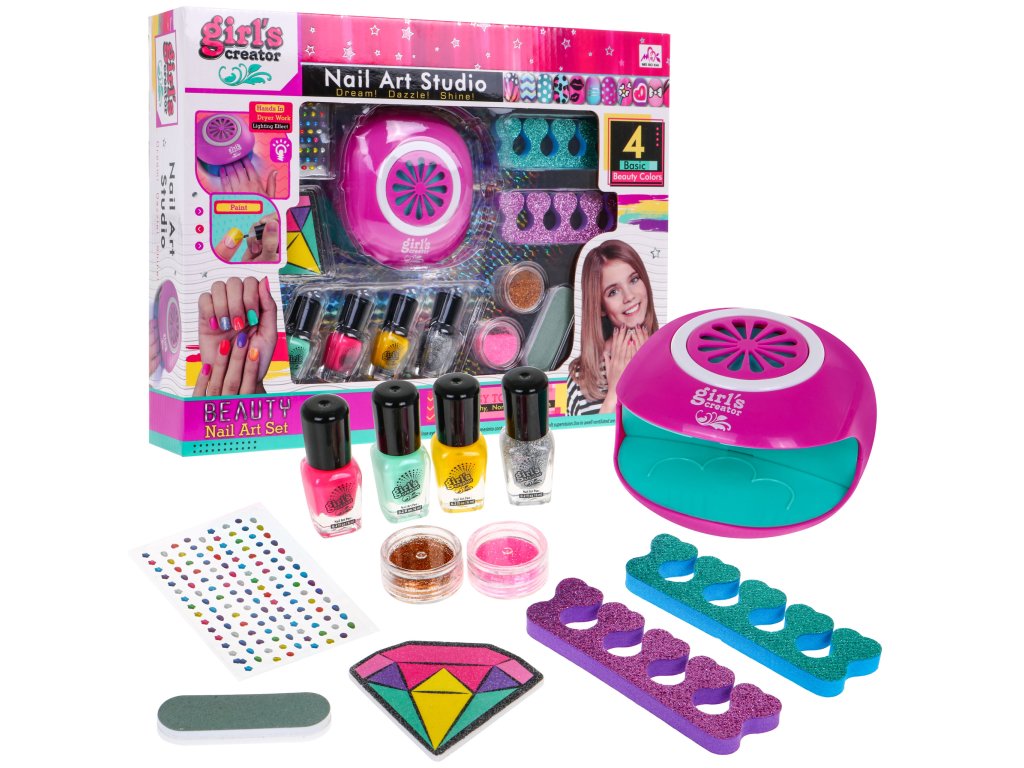 | - nail dryer, - three nail polishes, - one nail polish with glitter, - two containers with glitter, - a nail file, - nail buffer, - two finger separators, - nail jewels. |