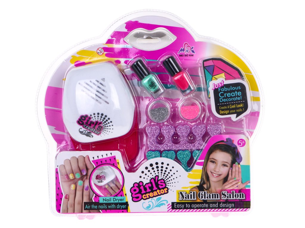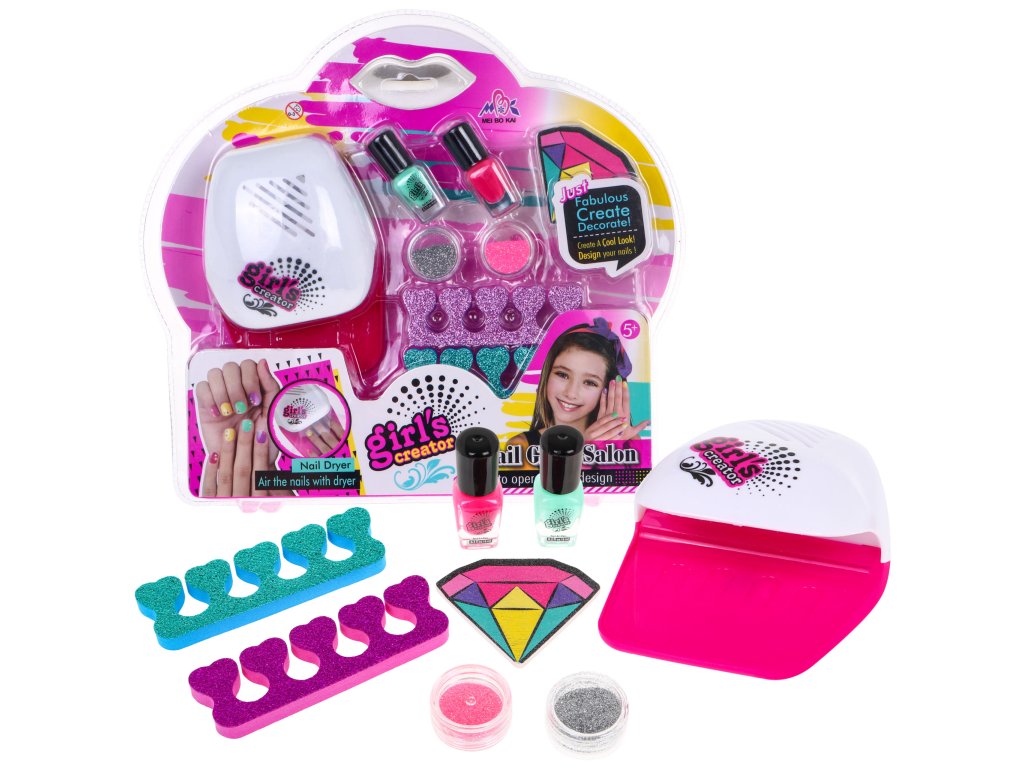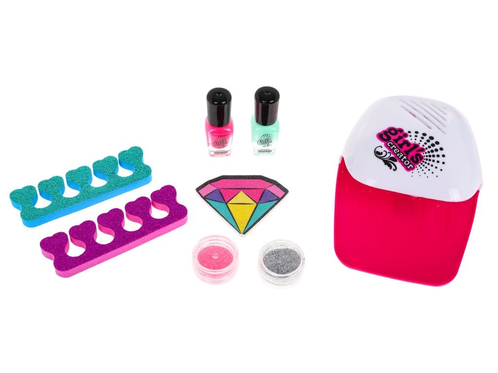 | - nail dryer, - two nail polishes, - two containers with colored glitter, - a nail file, - two finger separators. |