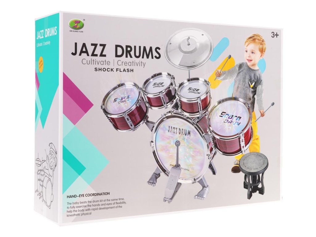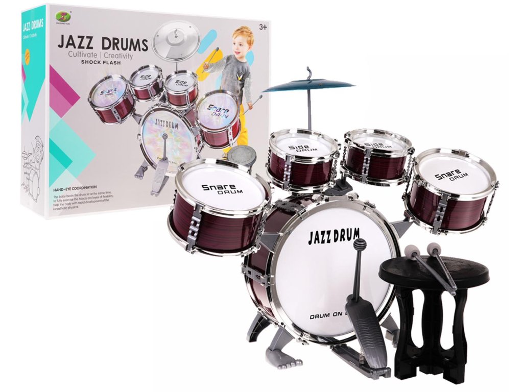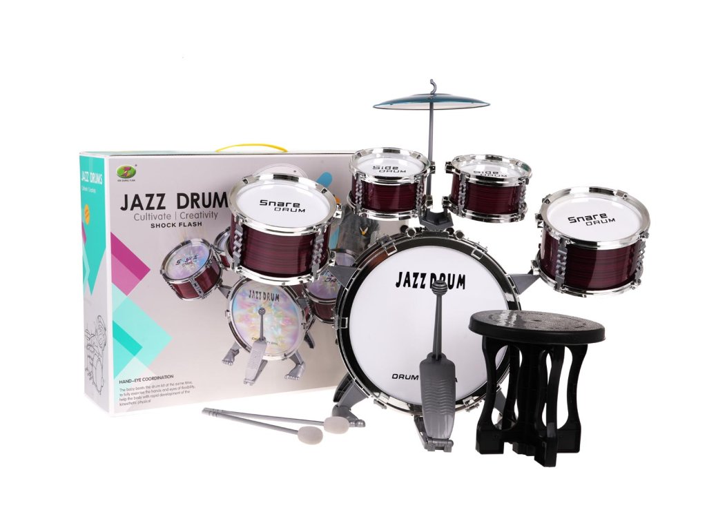 Large drum set with illuminated drums for children from 3 years of age. The drum set is made of safe, high-quality materials. It looks like a professional instrument. It is equipped with five drums, a plate, a set of sticks and a chair. An incredible attraction of the set are the illuminated drums, which will teach the child to beat the rhythm. Playing with this set develops musical skills, the sense of hearing and teaches how to distinguish sounds. The toy is powered by 9 x AG10 batteries (included).