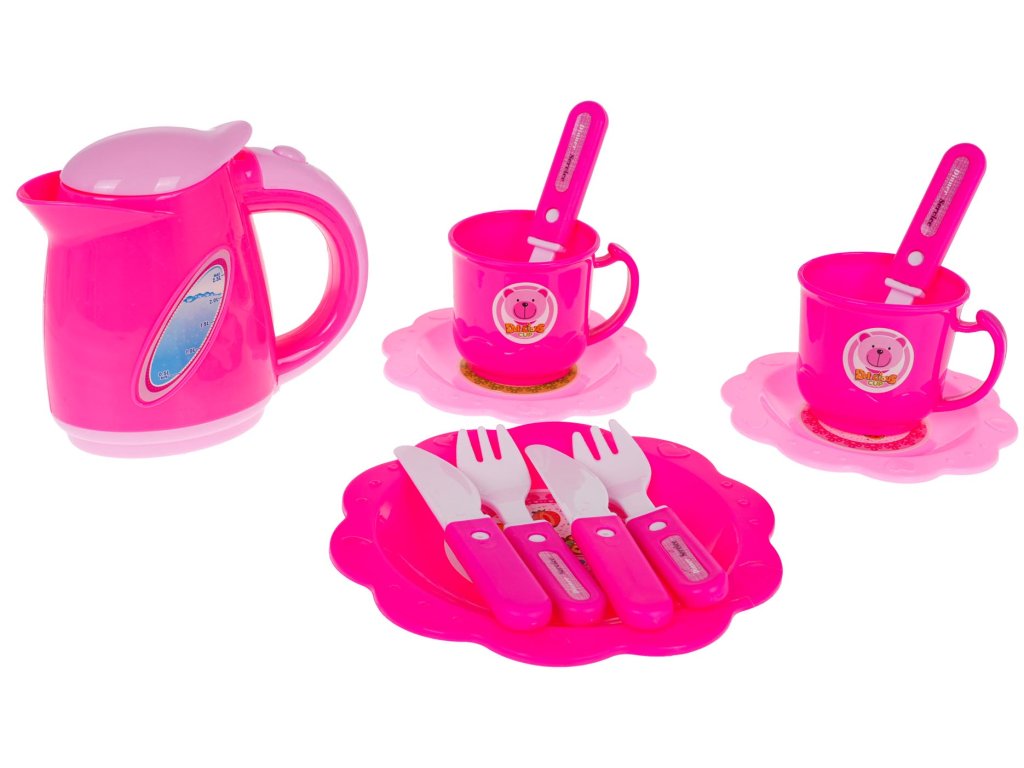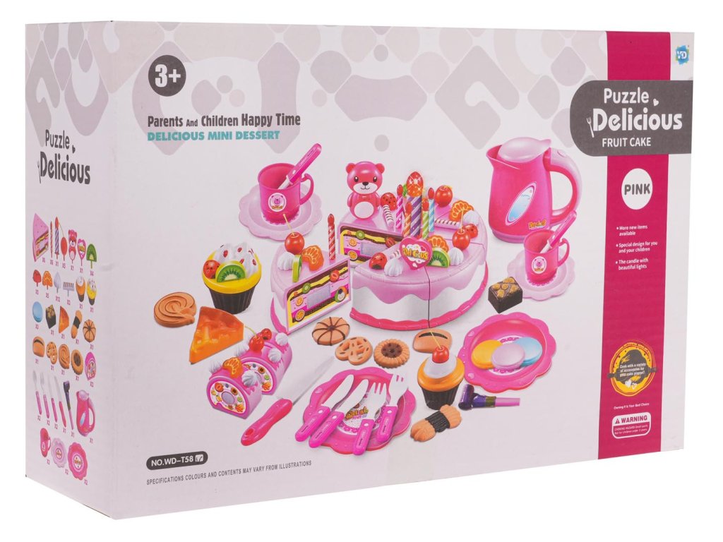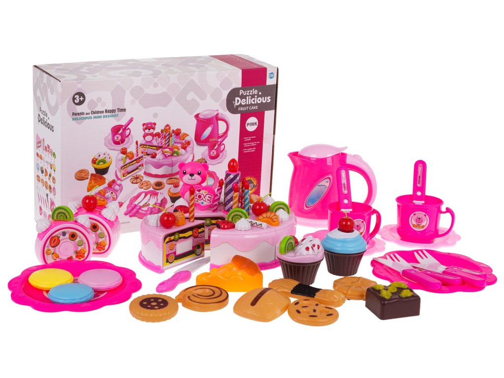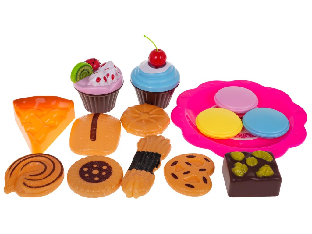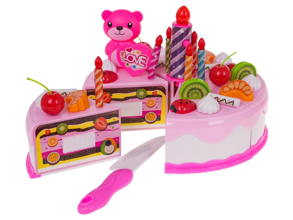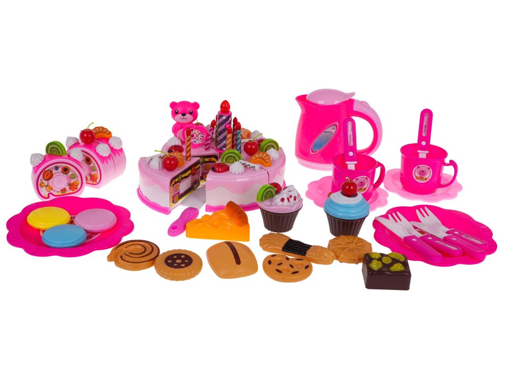 - 6 pieces of cake (total size approx. 8.5 cm x 15 cm), - 7 candles, including one larger, glowing one (approx. 7 cm x 2 cm – large candle, 4.5 x 0.5 cm – small candle), - 12 without (approx. 2 cm x 2 cm), - 5 cherries (approx. 4.5 cm x 2.5 cm), - teddy bear (approx. 6 cm x 3.5 cm), - 4 kiwis (approx. 2.5 cm x 2.5 cm), - 5 strawberries (approx. 2.5 cm x 1.5 cm), - 5 tangerines (approx. 2.5 cm x 1.5 cm), - 5 icing sticks (approx. 2.5 cm x 1.5 cm), - 2 cupcakes (approx. 5 cm x 6 cm), - 11 different cookies (different shapes, dimensions approx. 6 cm x 5 cm), - 3 pieces of roulade (total size approx. 7.5 cm x 7.5 cm x 6 cm), - 2 smaller knives (approx. 11 cm x 2 cm), - large knife (14 cm x 2.5 cm), - 2 teaspoons approx. 10 cm x 2.5 cm, - 2 forks approx. 10 cm x 2.5 cm, - 2 cups (approx. 5 cm x 7 cm), - roll approx. 7.5 cm x 6.5 cm, - 4 plates (small approx. 10 cm diameter, large approx. 13.5 cm diameter), - kettle approx. 10 cm x 11 cm x 4 cm, - whistle - decorative stickers. |