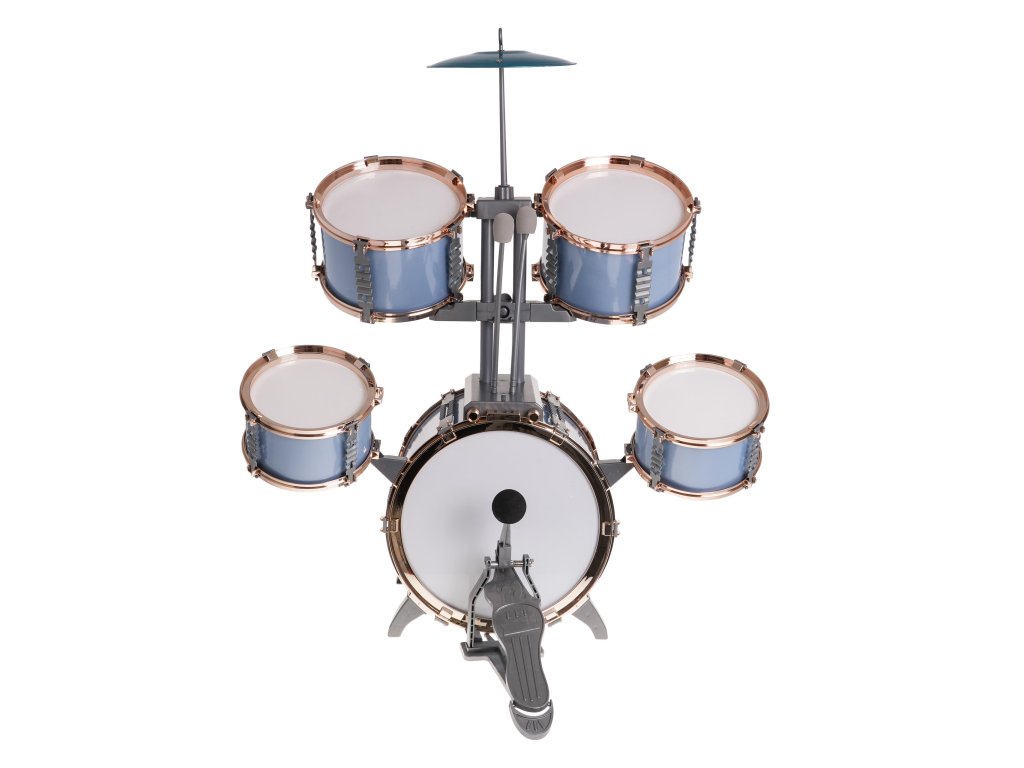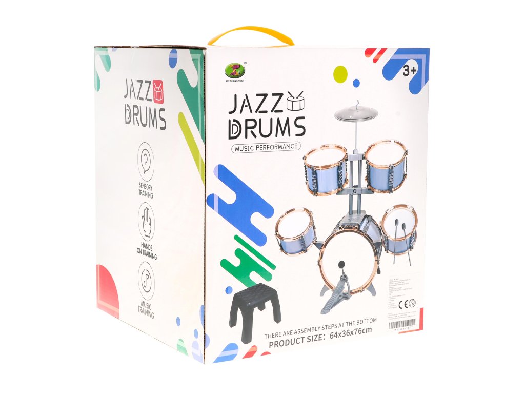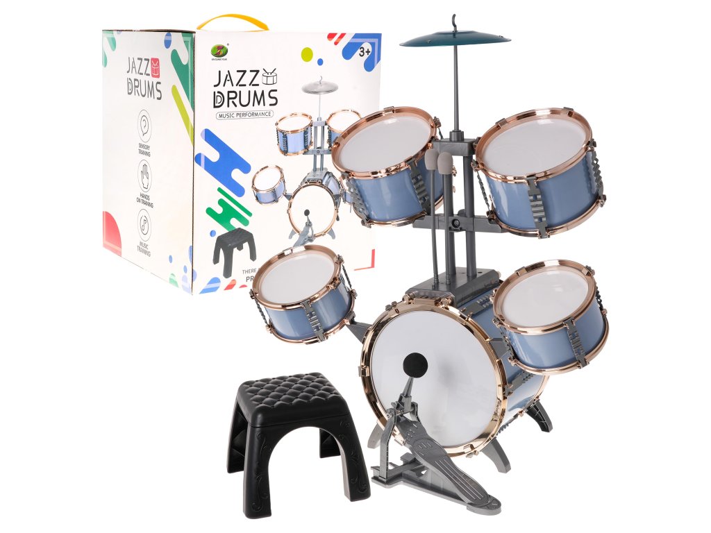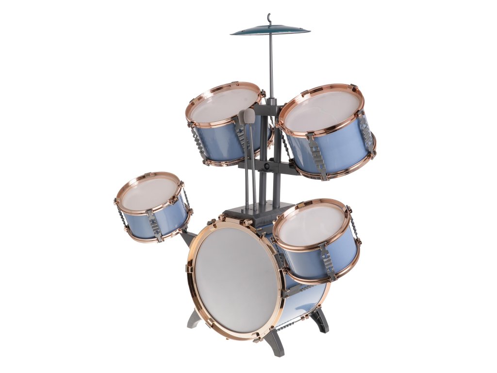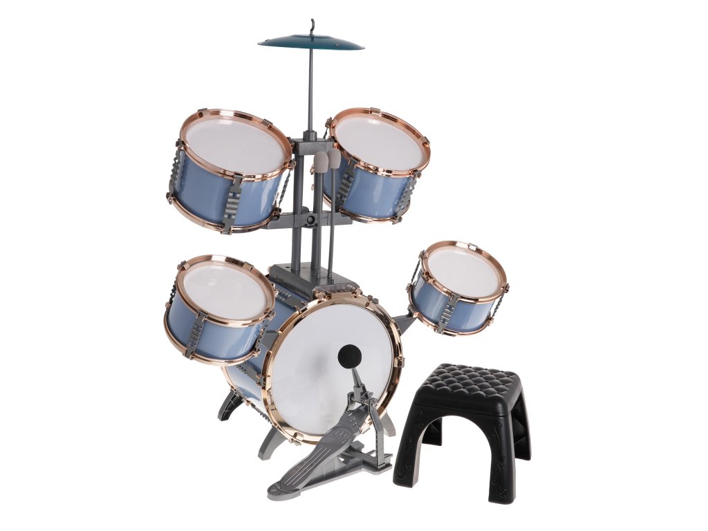 A large, blue drum set with a chair is a toy instrument for children from 3 years of age. The set includes 5 drums, a metal cymbal, 2 sticks and a chair. |