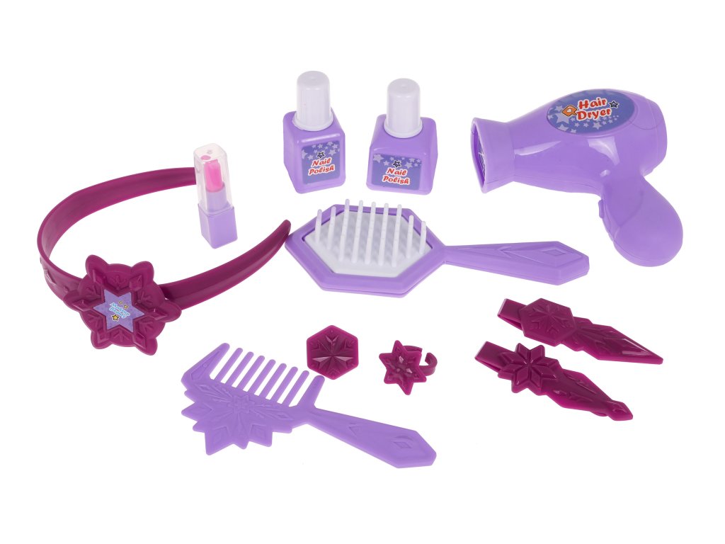 - vanity table, - hair dryer, - hair band, - 2 x hairpins, - 2 x ring, - hair comb, - hairbrush, - 2 x fake nail polish, - fake lipstick. |