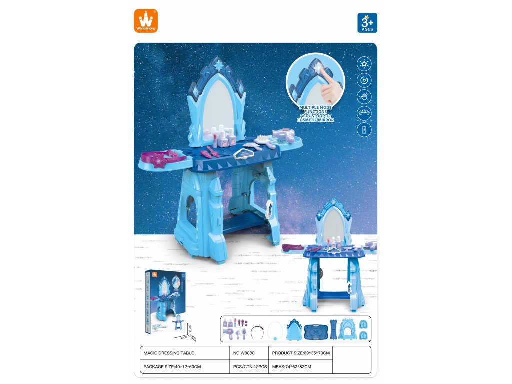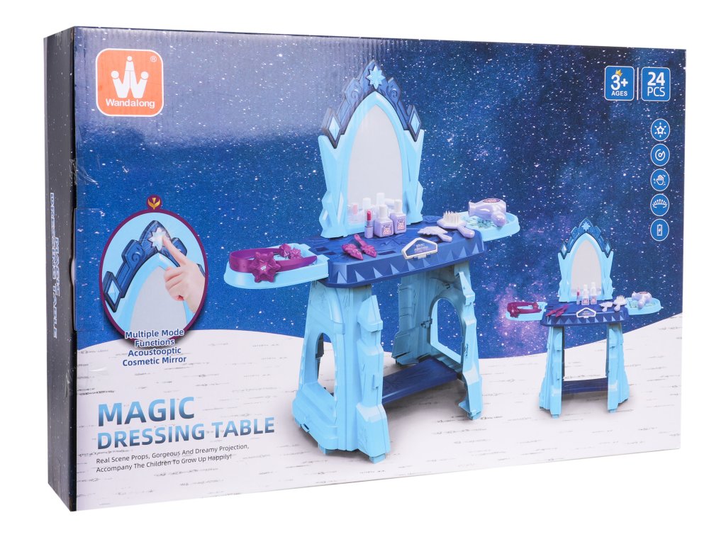 An interactive dressing table with sound and light function is intended for children from 3 years of age. The set includes a dressing table and fake cosmetics and jewelry. The dressing table has a large mirror and above it there is a star-shaped button, when pressed, sound and light effects are activated. There are recesses for cosmetics and jewelry on the countertop and on the shelves on the sides of the dressing table. The shelves on the sides can also be opened like shutters, and the shutters themselves can be placed on the side legs of the dressing table. The dressing table is powered by 2 x AAA 1.5V batteries (not included). Dressing table features: - blinking blue lights - a button with a star, two buttons on the sides of the quadrangular mirror, - sounds – two melodies, - opening side shelves like shutters, |