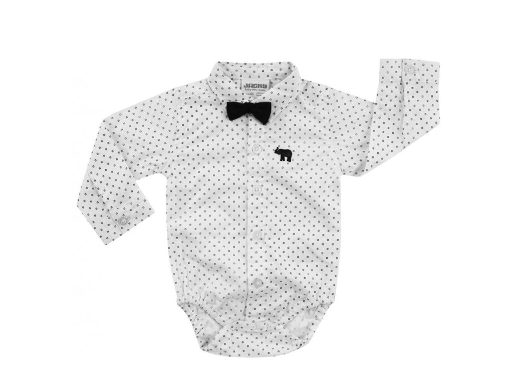 Společenské body pro chlapce s límečkem. Má odjímatelného motýlka na rozepínání. U nožiček je praktické jemné řasení, které zajišťuje komfort při nošení. S jemným vzorem puntíčku a medvídka. Z kvalitního materiálu, příjemného na nošení.