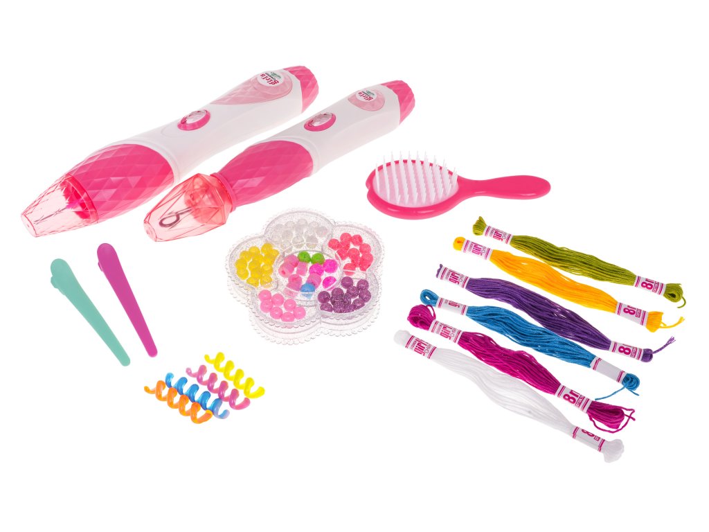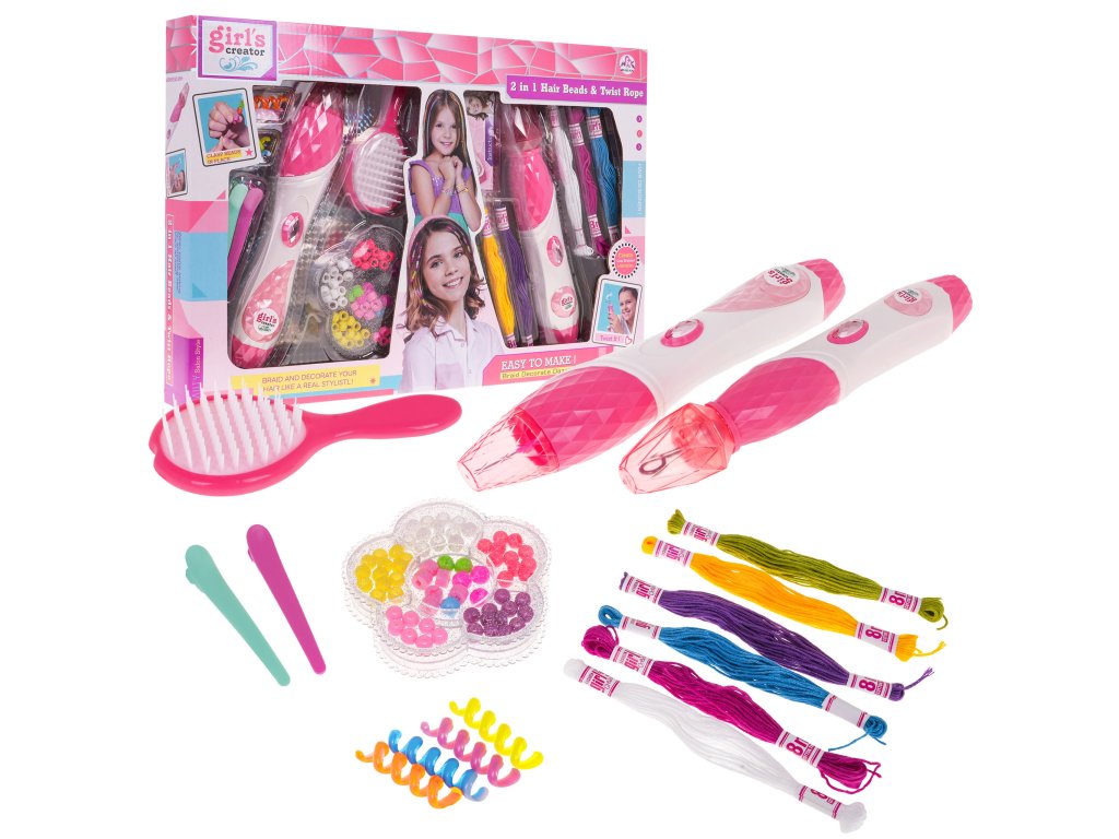 A hair set with two hair styling devices, a hairbrush, beads, thread and hairpins is a proposition for children from 5 years of age. The bead applicator does not require batteries, while the floss braid machine is powered by 2 x AA 1.5V batteries, batteries not included. To apply the bead to your hair, simply place the bead on the applicator, then pass a strand of hair through the hook in the applicator and move the diamond located in the center of the device upwards. We hold the bead and remove the applicator. Ready! If we want to braid the thread, tie the threads together, put a bead on them and then place the threads on the metal hook of the machine, dividing them into two parts. Press the button located in the center of the device and weave the strands of thread together. Then we attach the thread braids to the hair with a clip. |