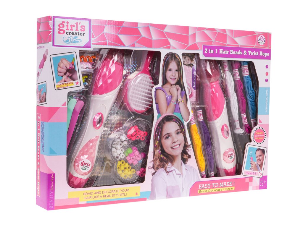 - machine for applying beads on hair, - machine for weaving thread braids, - hairbrush, - 2 x pins, - 6 x threads, 8 meters each, - bead box, - 65 colorful beads, - 4 hair springs, - 2 x user manual, separately for each device. |