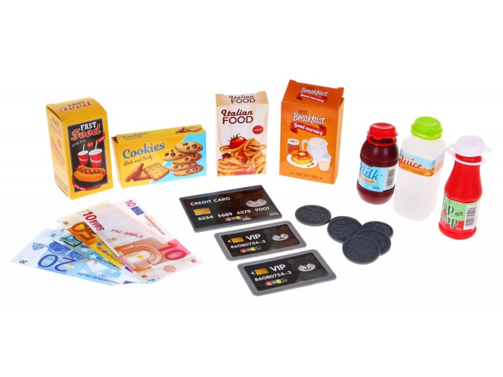 - cash register with a built-in calculator, - weight - barcode reader, - scanner, - opened drawer, - 3 x VIP card, - credit card, - a set of banknotes and coins, - dummy ketchup, juice, milk, - cardboard boxes (cookies, hod dog, pasta). | |