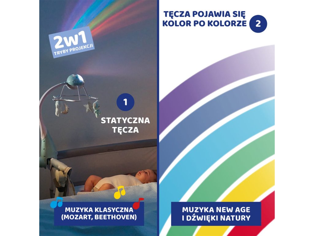 Chicco First Dream Rainbow Kolotoč 3v1 je ideálním společníkem pro vaše dítě, který nejen zpříjemní usínání, ale i podpoří jeho vývoj. Díky možnostem přeměny na různé formy zábavy roste s dítětem a nabízí dlouhotrvající hodnotu. S tímto kolotočem bude usínání příjemné a klidné, zatímco vaše dítě bude stimulováno k prozkoumávání světa kolem sebe.
