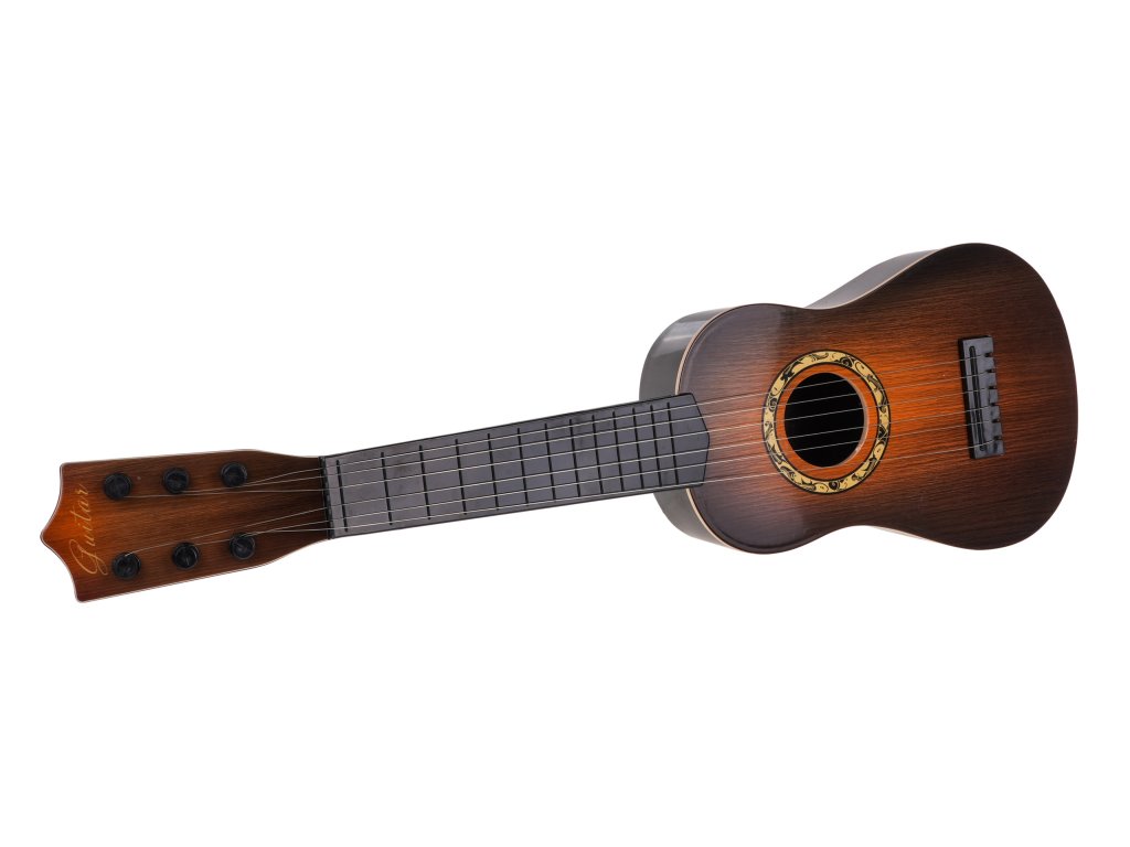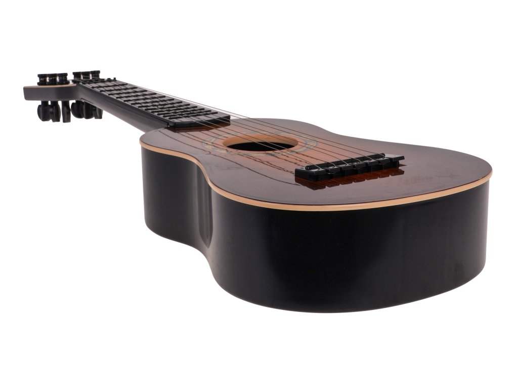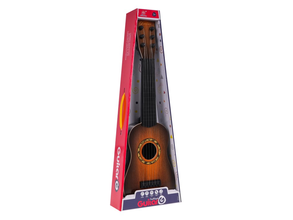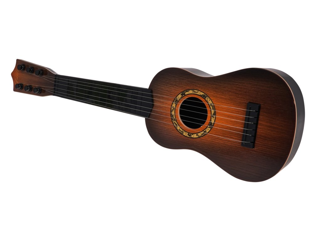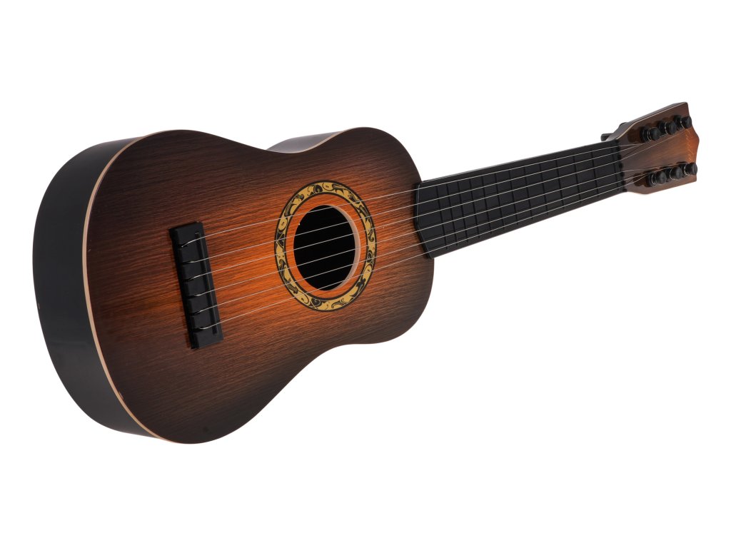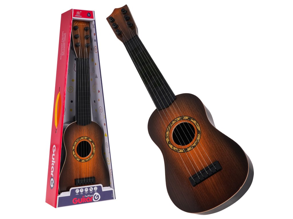 A beautifully made brown classical guitar is a proposition for little musicians from the age of 3. The guitar perfectly imitates a real instrument, it has 6 iron strings and tuning pegs on the neck, thanks to which the sound is similar to the sound of a classical guitar. The toy is made of high-quality plastic with a wood structure. |