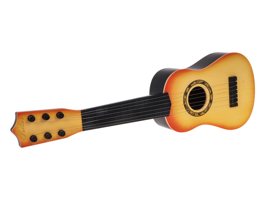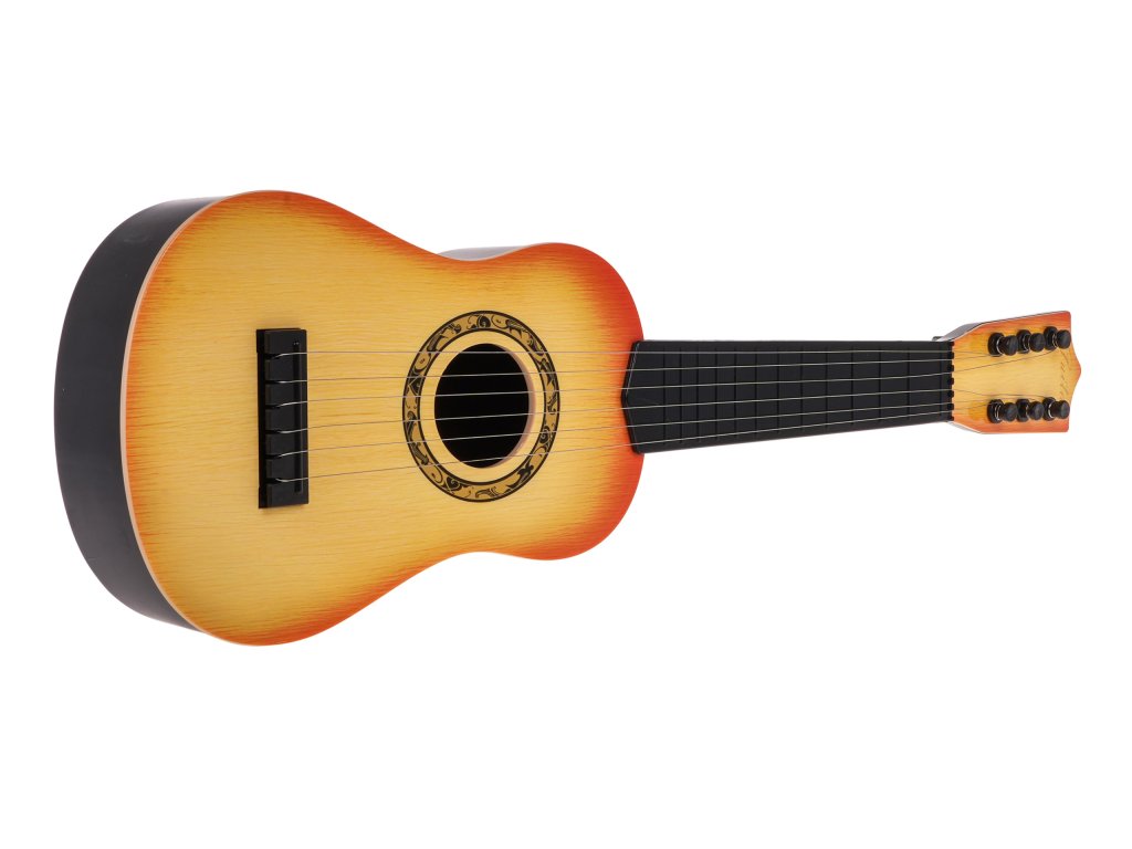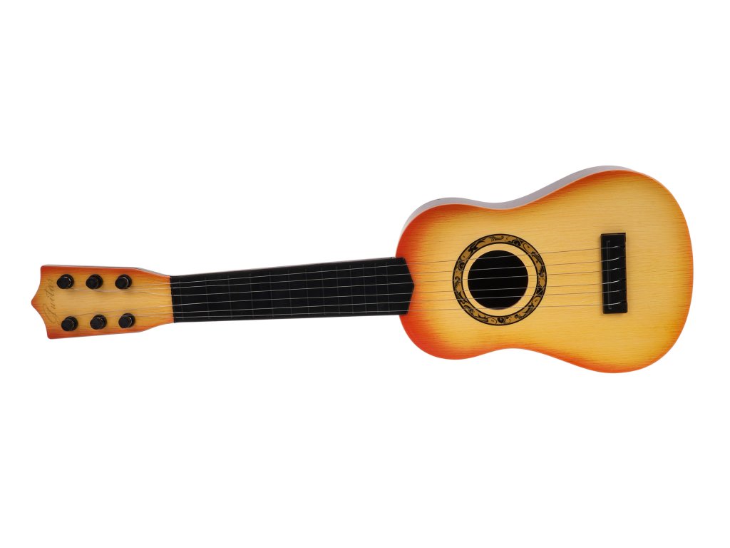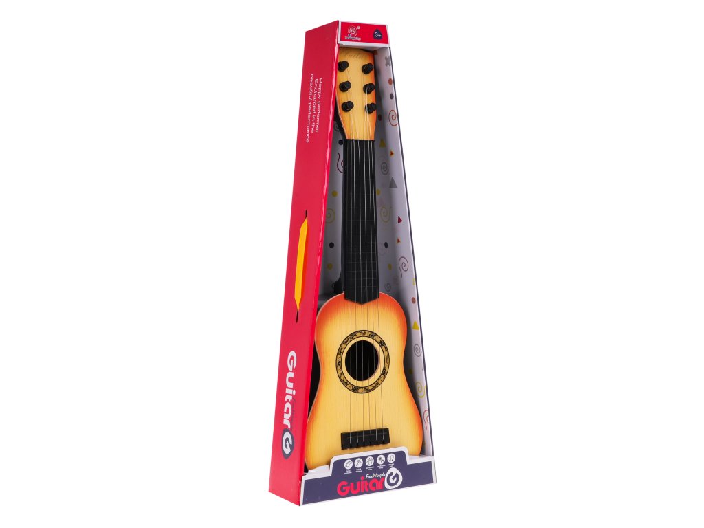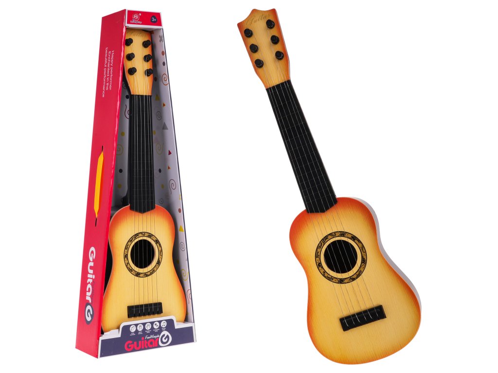 A beautifully made, light brown classical guitar is a proposition for little musicians from 3 years of age. The guitar perfectly imitates a real instrument, it has 6 iron strings and tuning pegs on the neck, thanks to which the sound is similar to the sound of a classical guitar. The toy is made of high-quality plastic with a wood structure. |