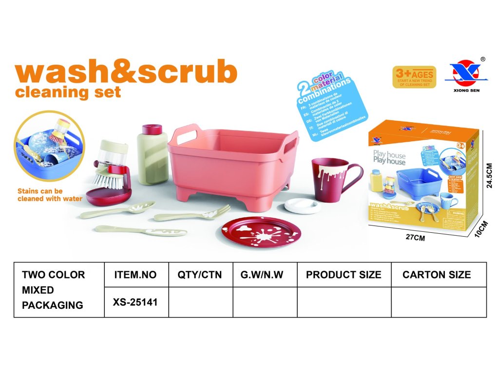 - washing bowl, - a bottle for dishwashing liquid, - dishwashing brush, - cutlery: knife, fork, spoon, - plate, - mug. |