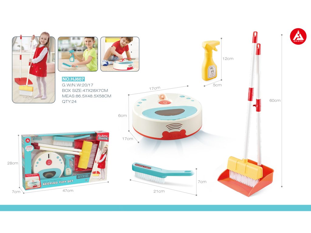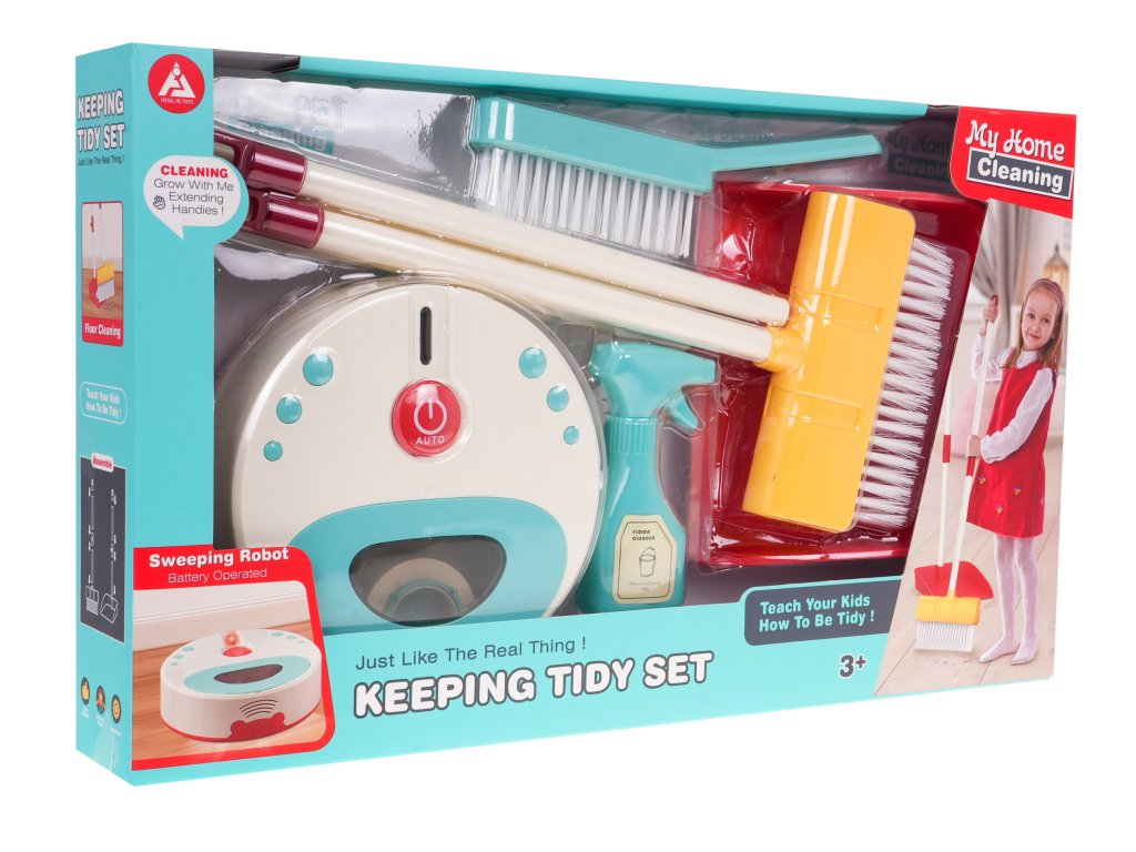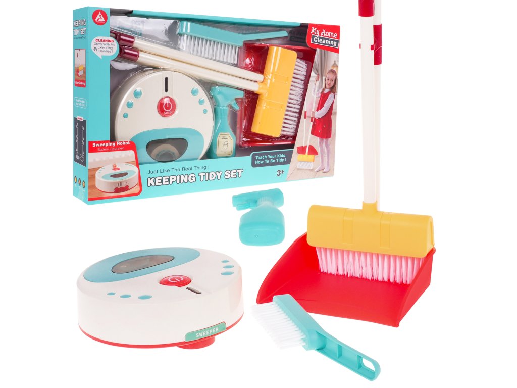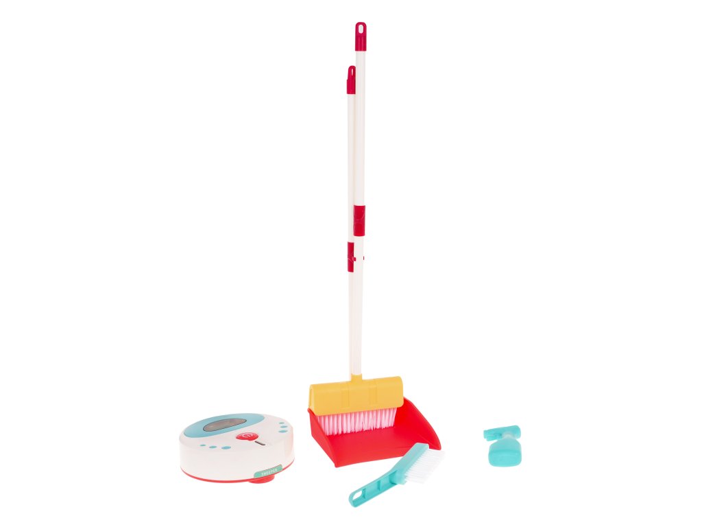 - cleaning robot, - dustpan with broom, - broom, - dummy cleaning agent. |