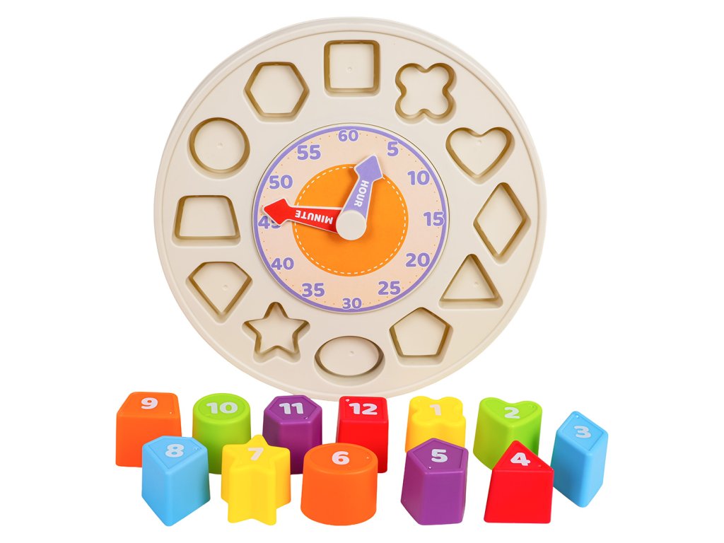 An educational clock with a shape sorter for children aged twelve months and up. Made of safe materials in vibrant colors, the clock face features movable hands and numbers from 5 to 60. On the outside of the face is a shape sorter. Toddlers can place up to 12 blocks in the variously shaped recesses. Each block is marked with a number from 1 to 12. This set will help your little one become familiar with the clock through play, learning to recognize minutes and hours, and learning about different shapes and colors.