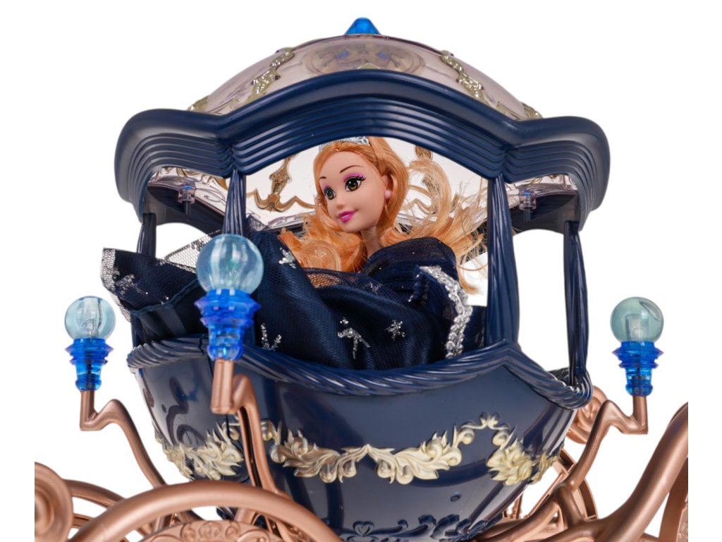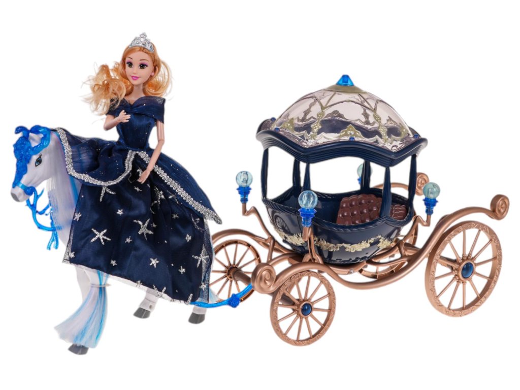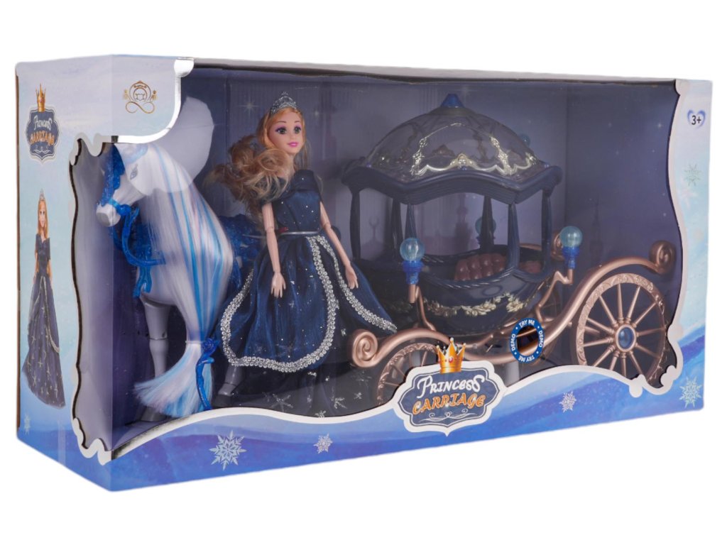 Doll, horse, carriage set with light and sound effect for children over 3 years of age. The set allows you to move into the world of magic. The horse moves forward and makes sounds like a real animal. The carriage is lit with flashing lights (blue and red). The doll has movable arms and legs, a beautiful ball gown and long hair. The horse is powered by 3 x AA 1.5 V batteries (not included). The carriage is powered by 3 x AG13 batteries (included).