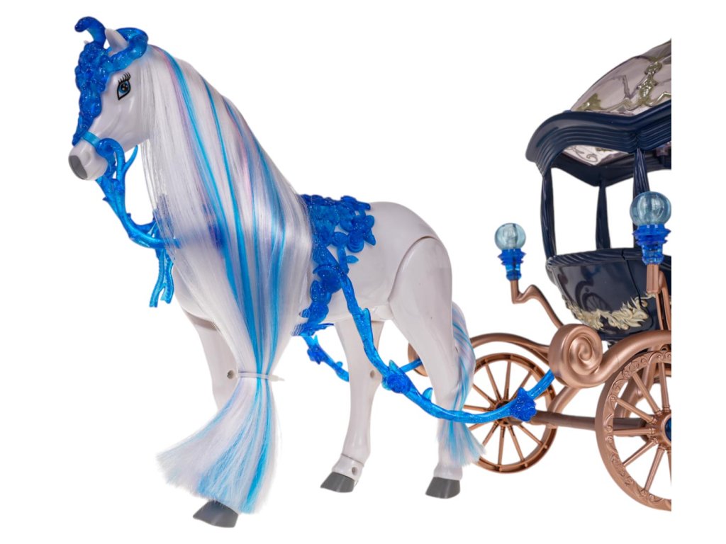 - suitable for children from 3 years of age, - the horse walks and makes sounds, - you can comb and braid the horse's mane, - you can comb the doll's hair, - the carriage has lighting, - the doll has movable arms, legs and head, - the set allows you to be transported to the world of magic. |
