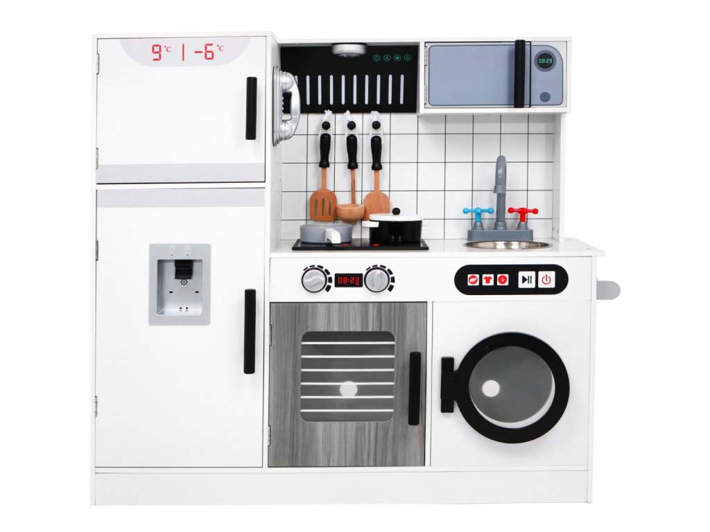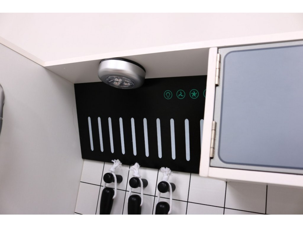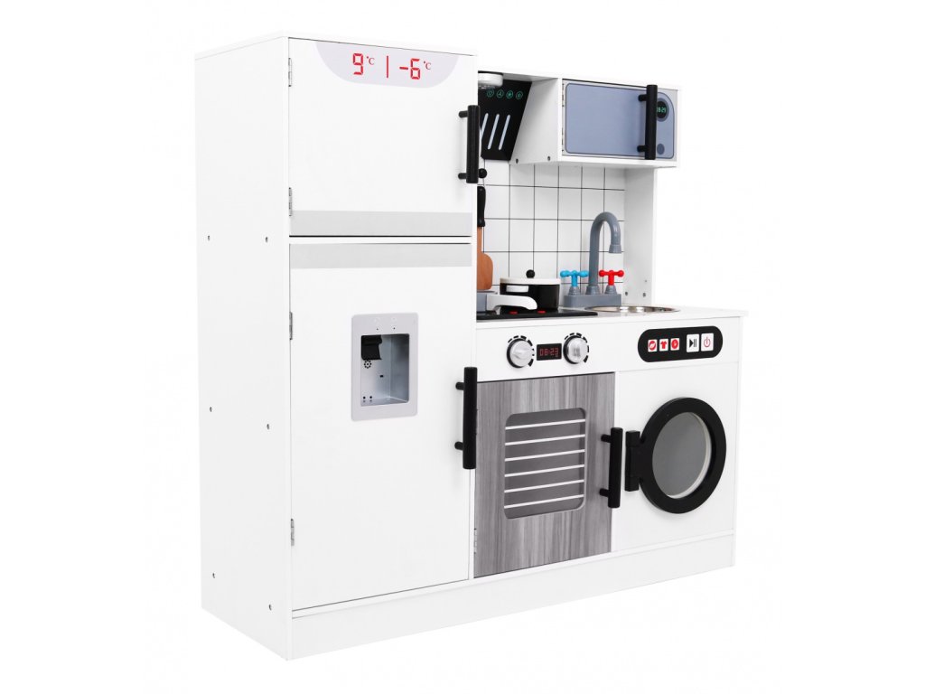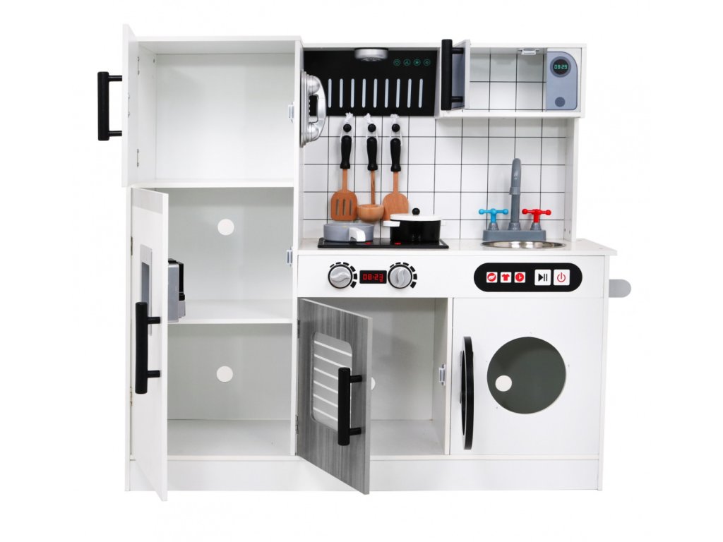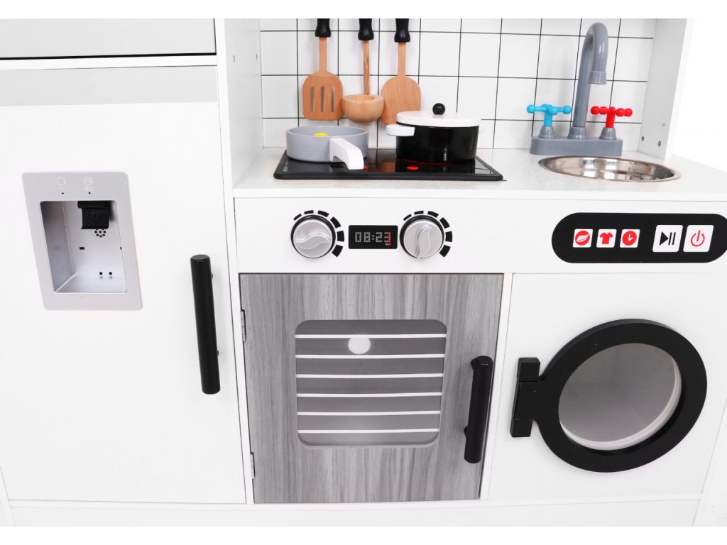 - illuminated hood, - flashing lights on the water dispenser, - illuminated, flashing heating plates, - cooking and frying noises, - sounds of "pouring water" from the dispenser, - opened fridge, - open cooker, - washing machine that can be opened, - opening microwave, - faucet with movable valves, - movable knobs in the oven. | |