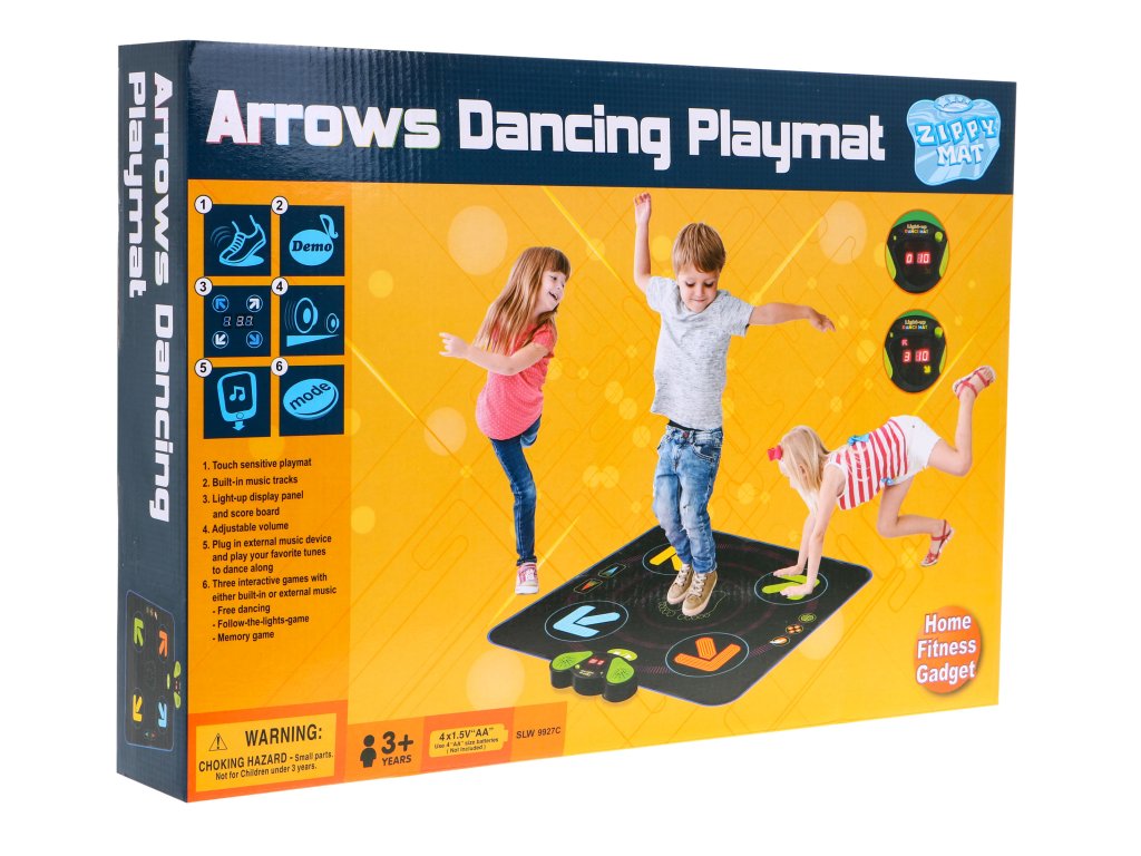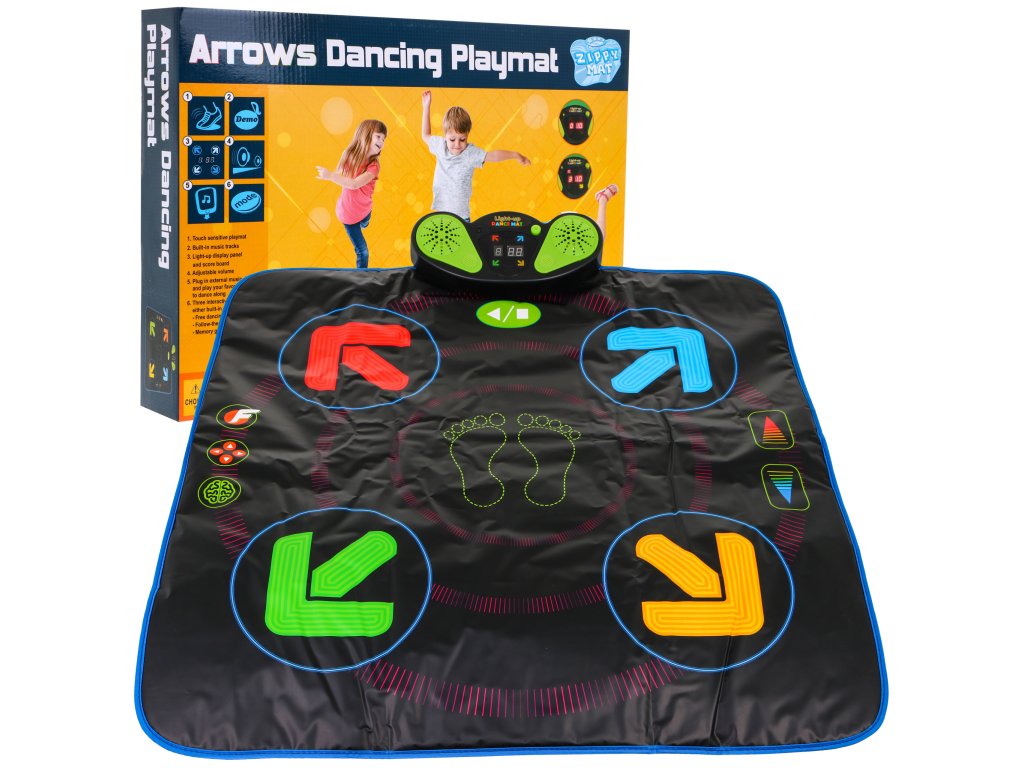 | The Best Disco interactive dance mat is a combination of dance gymnastics with great fun. Music and movement develop memory, confidence, attention and creativity. The mat is easy to fold, it does not take up much space after play. The surface of the mat is soft, durable and easy to clean, with a non-slip layer on the underside. The toy has eight built-in background music, and if the child gets bored, we can connect the phone to the mat using the MP4 cable included in the set and listen to your favorite hits. The mat has several game modes: follow the arrows, free dance and a memory game. The music panel is powered by 4 AA 4 x 1.5V batteries (not included). Free dance game mode. The player presses the arrows at his discretion, the arrows light up on the display panel. Follow the arrows mode: The player presses the arrows indicated by the display. There are eight different difficulty levels to choose from Memory game mode The player must remember the flashing arrows on the panel one by one and press the appropriate arrows on the mat in the same order as they were displayed on the panel. Use arrows to change the difficulty level. This mode has 99 difficulty levels. Mat functions: - free dancing mode, - memory game mode, - follow the arrows mode, - changing the background music, - changing the difficulty level, - volume control, - the ability to connect the phone to the mat, - backlit display panel and scoreboard. |