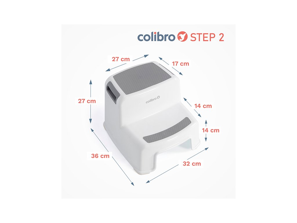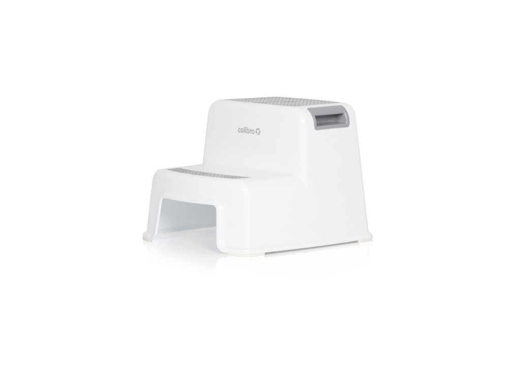 Dvouúrovňová plošina (stupeň) STEP 2 značky COLIBRO je výrobek nejvyšší kvality. Má 2 stupně, takže je vysoký a je ideální pro menší děti. Plošina STEP 2 má jednoduchý minimalistický tvar, díky kterému dokonale zapadne do výzdoby moderní koupelny. Je široký, stabilní a má pohodlná držadla pro přenášení. Jeho horní povrch a nižší stupeň mají pevně zabudovanou protiskluzovou podložku, která zajišťuje perfektní přilnavost i když je namočená. Plošina STEP 2 má široké gumové patky zabraňující klouzání po podlaze. Je vyroben z velmi odolného plastu, takže je určen pro děti do hmotnosti 30 kg.