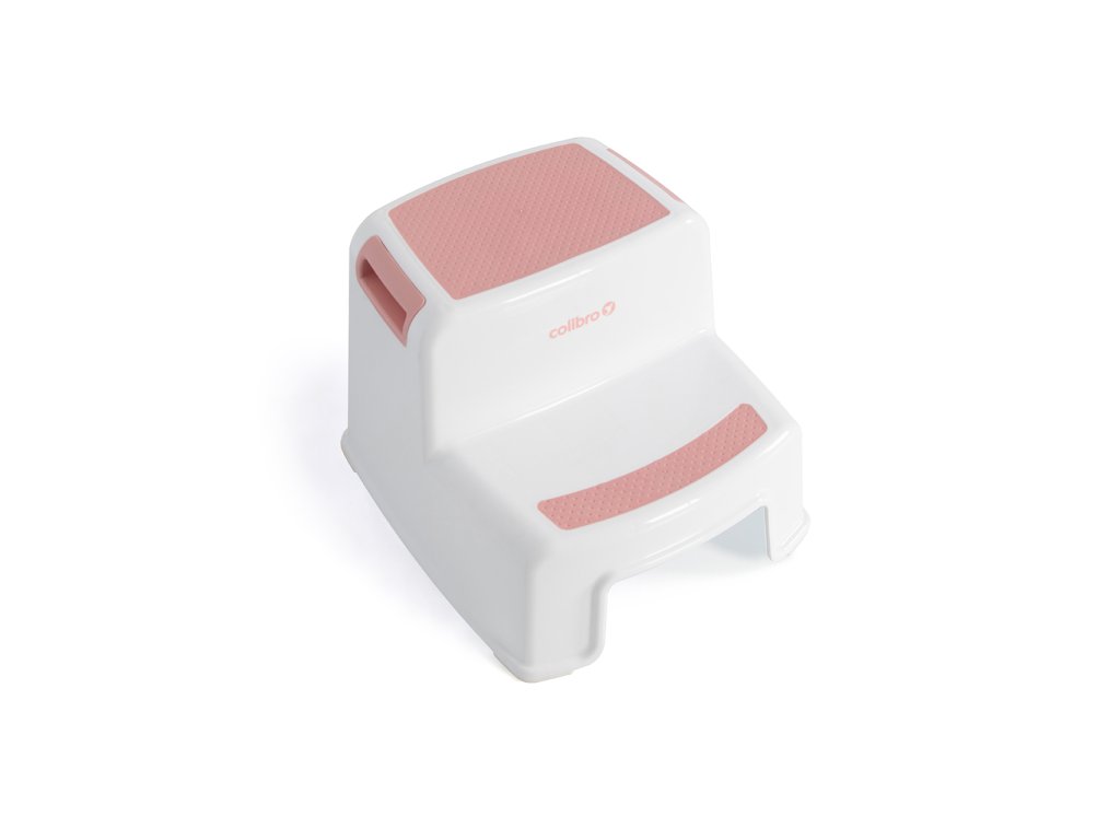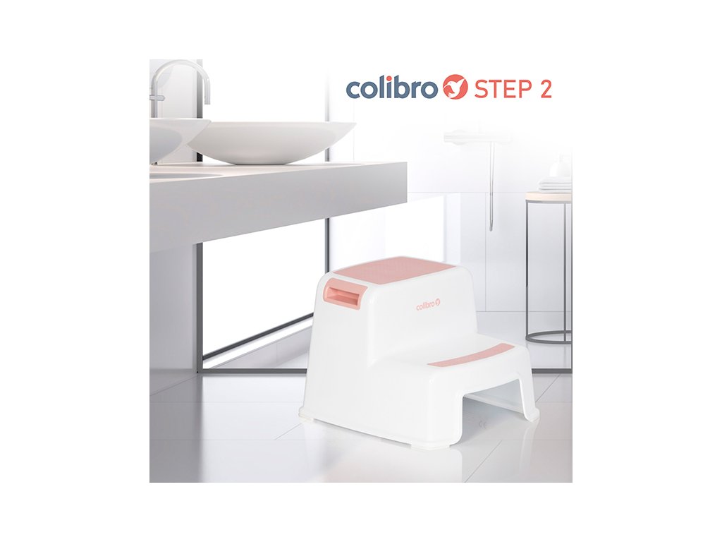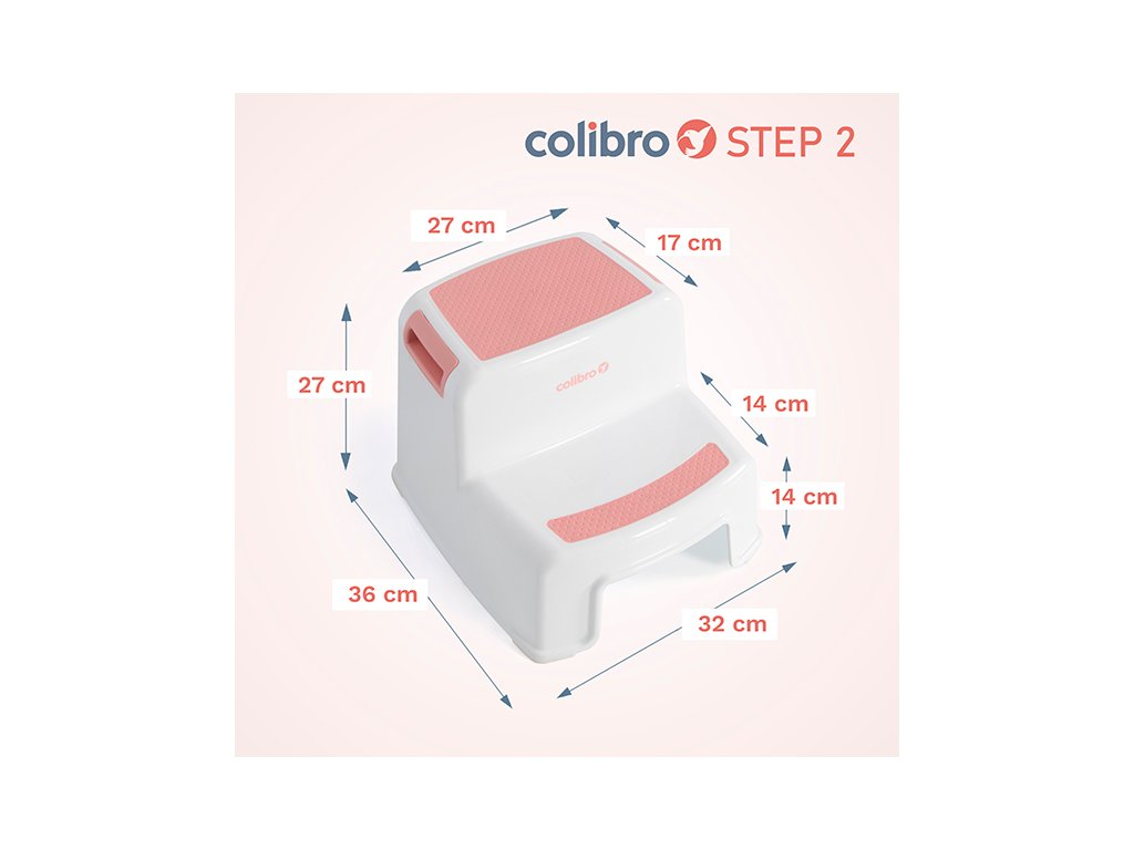 Dvouúrovňová plošina (stupeň) STEP 2 značky COLIBRO je výrobek nejvyšší kvality. Má 2 stupně, takže je vysoký a je ideální pro menší děti. Plošina STEP 2 má jednoduchý minimalistický tvar, díky kterému dokonale zapadne do výzdoby moderní koupelny. Je široký, stabilní a má pohodlná držadla pro přenášení. Jeho horní povrch a nižší stupeň mají pevně zabudovanou protiskluzovou podložku, která zajišťuje perfektní přilnavost i když je namočená. Plošina STEP 2 má široké gumové patky zabraňující klouzání po podlaze. Je vyroben z velmi odolného plastu, takže je určen pro děti do hmotnosti 30 kg.
