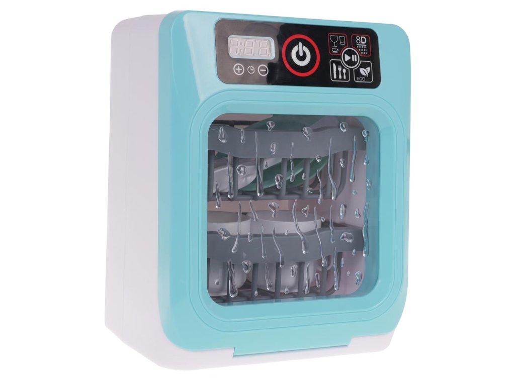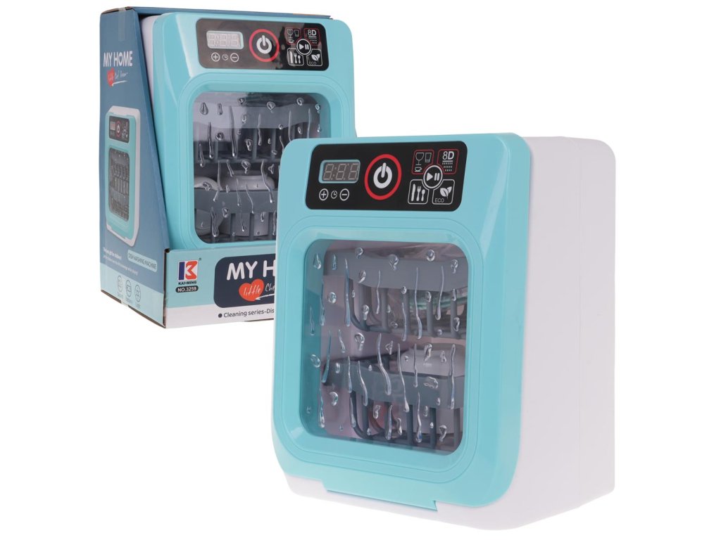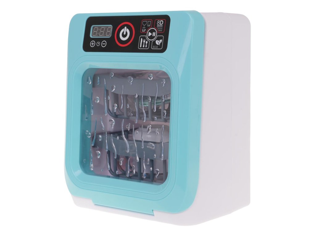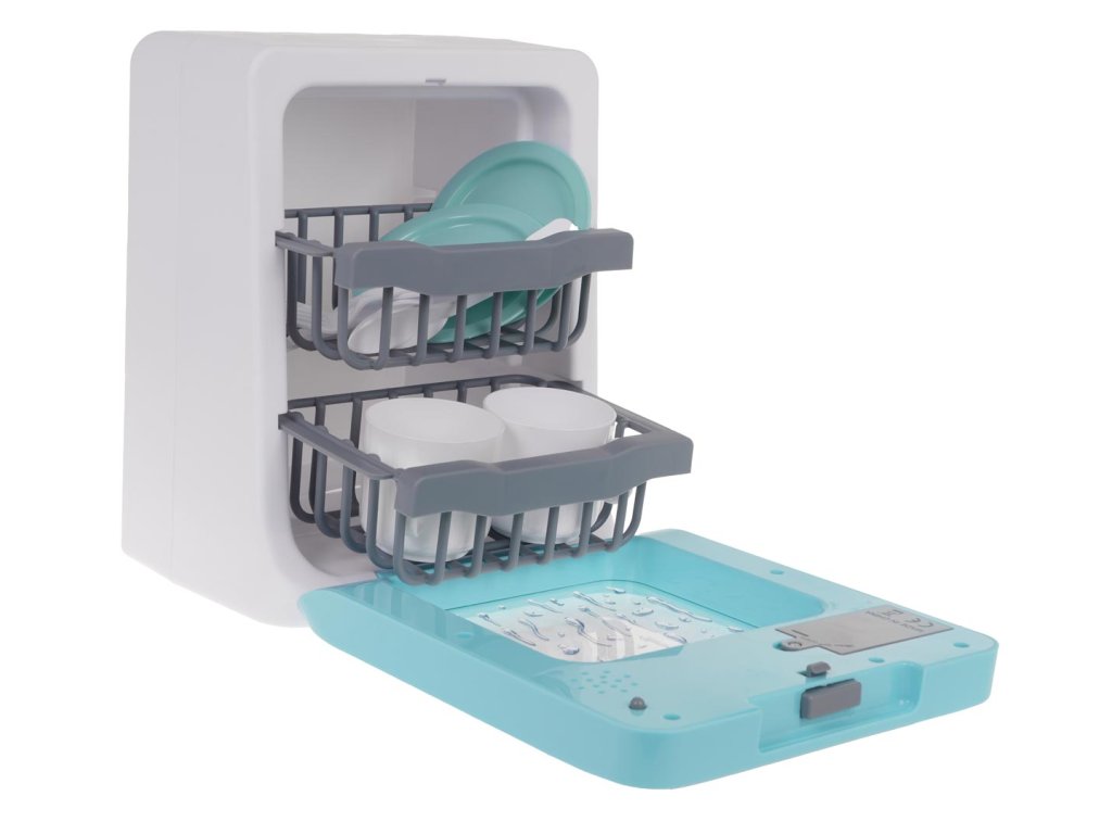 Interactive dishwasher with sound and light function for children over 3 years of age. The dishwasher has a touch panel, thanks to which you can turn it on and off and change the program. During the dishwasher operation, you can hear the sound of water, the sound of boiling and the sound of the finished work. Additionally, we can set the dishwasher's operating time. The dishwasher door is opened, you can remove the baskets from inside to more efficiently insert the dishes included in the set. The set includes dishes such as cups, plates, spoons, forks, knives. The toy is powered by 2 x AA batteries (not included).