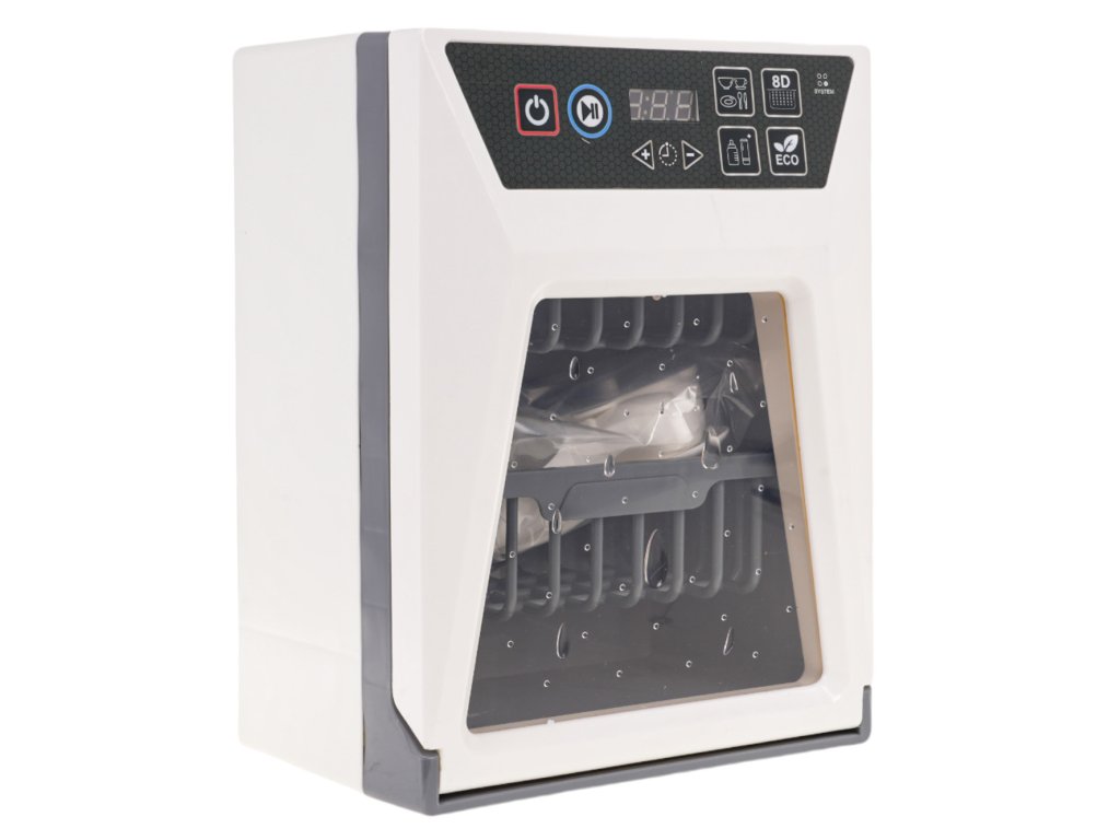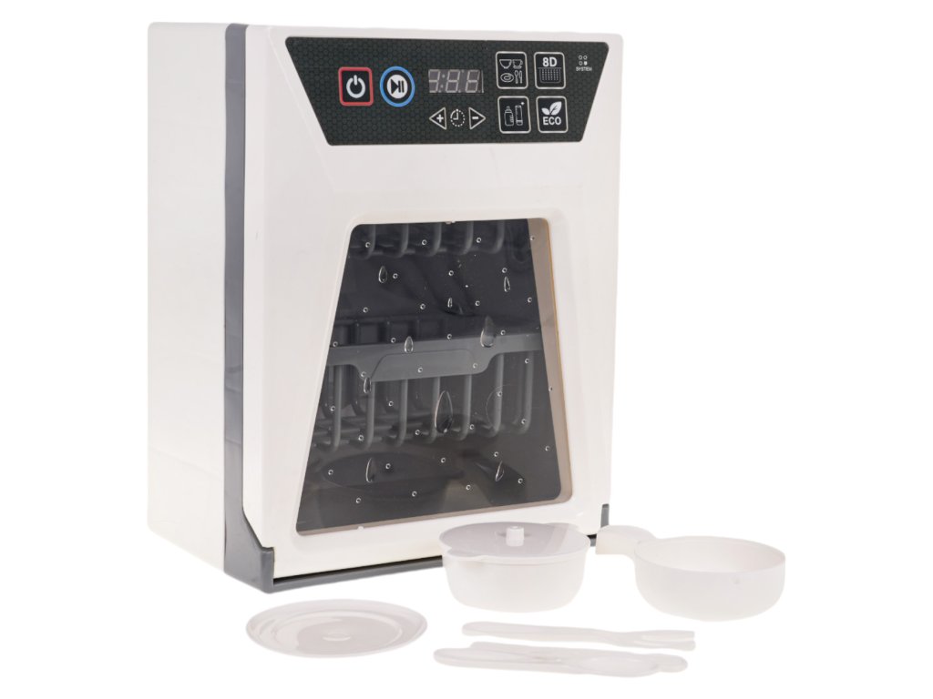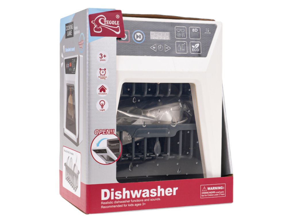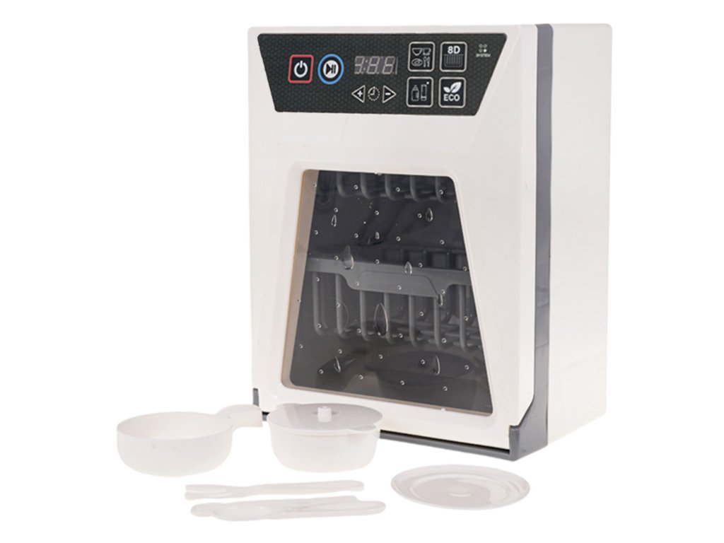 Interactive dishwasher with sound and light function for children from 3 years of age. The dishwasher looks like a real one and makes characteristic sounds of work. It is made of the best quality materials, it is safe for children. To start the dishwasher, press the red button on the touch panel and select the program, then press the play button . The dishwasher will start making sounds characteristic of the selected program and count down the time remaining until the end of the program. The dishwasher door opens, and we can remove the drawer for dishes from inside. The set includes numerous dishes and cutlery. The toy is powered by 2 x AA 1.5 V batteries (not included).