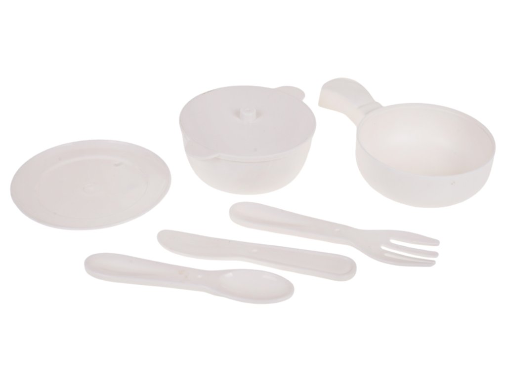 - plate, - pot with lid, - frying pan, - knife, fork, spoon. |