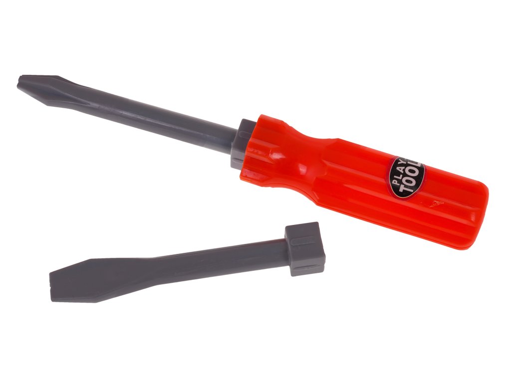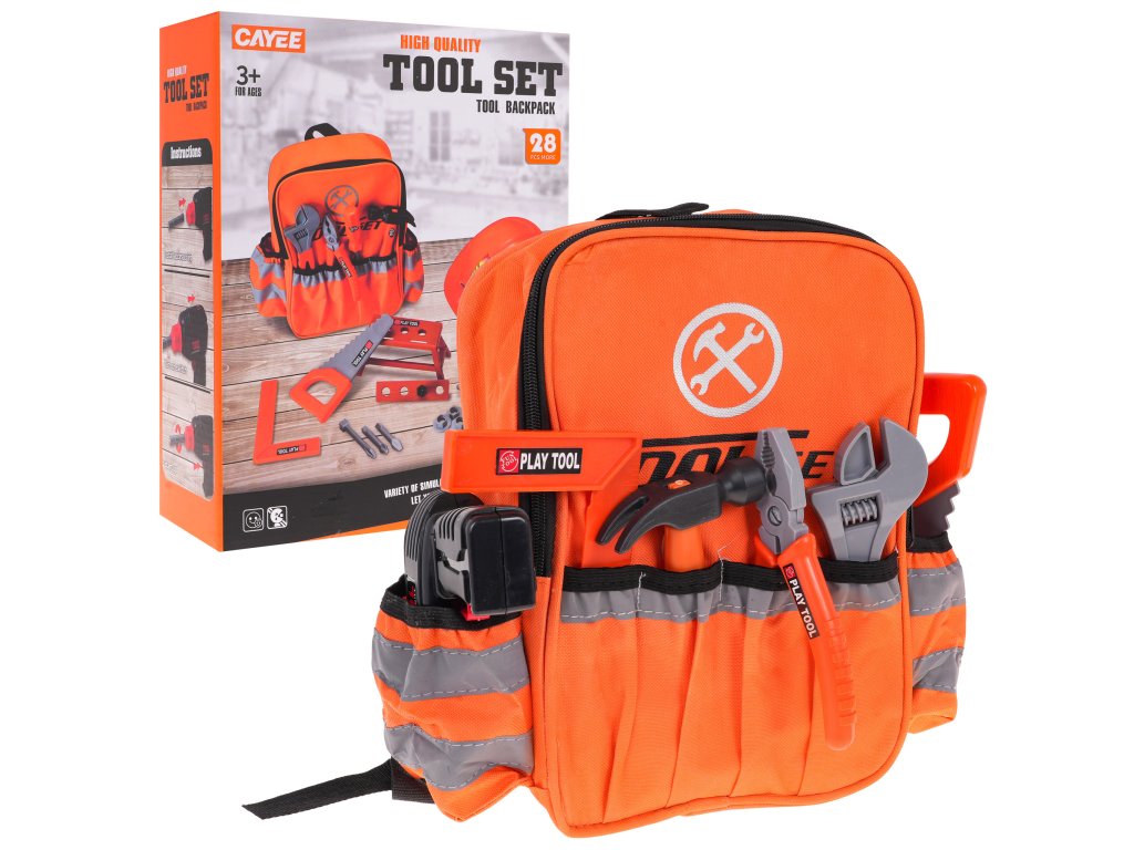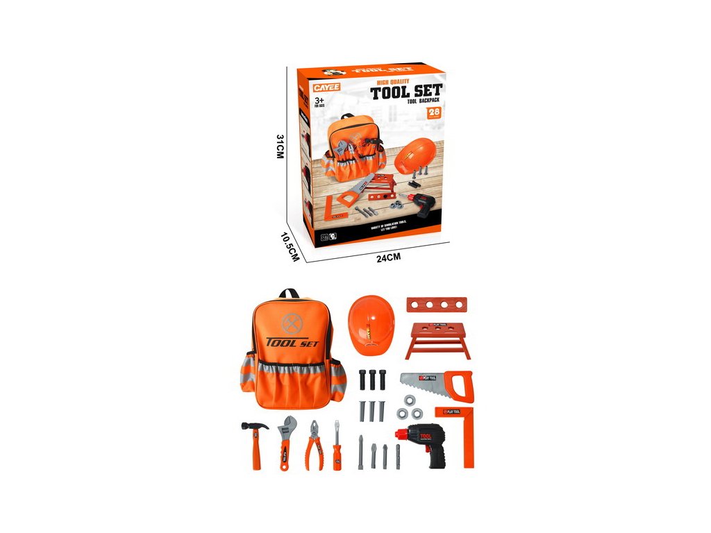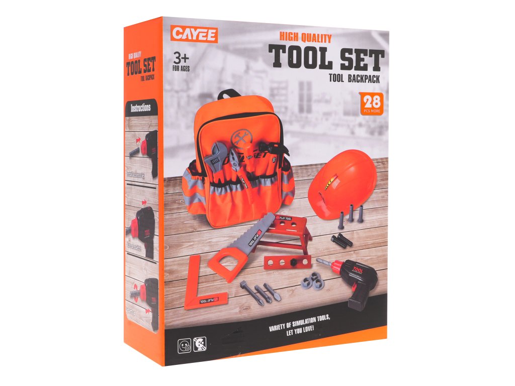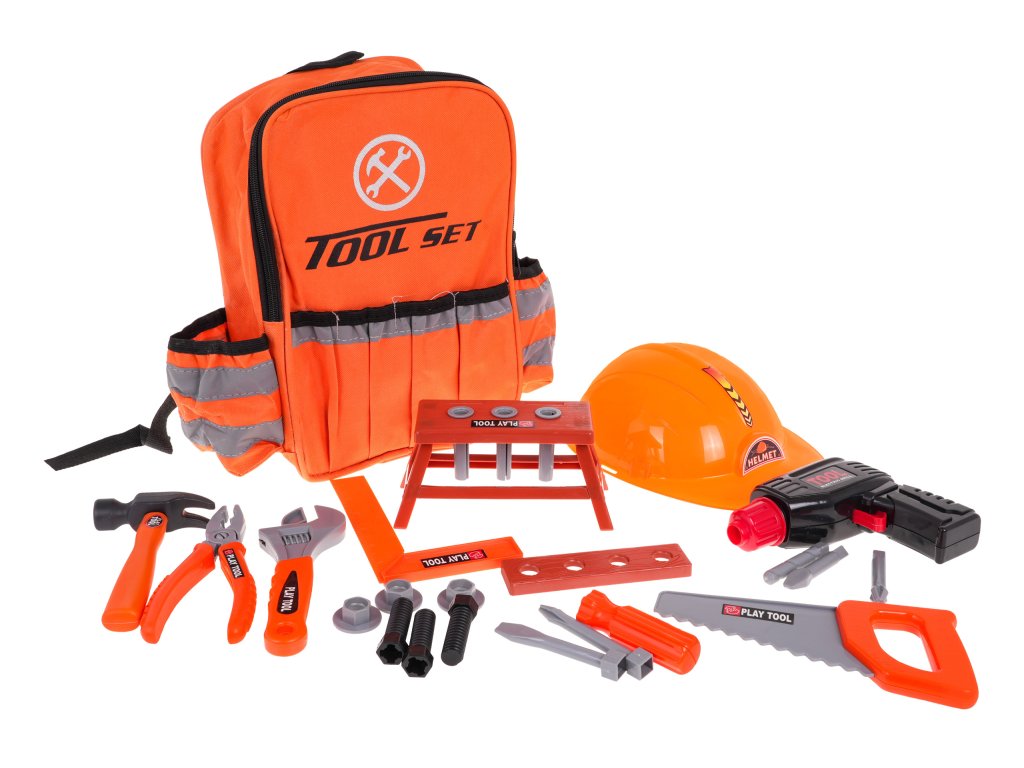 - backpack, - protective helmet, - screwdriver-drill, - hammer, - pliers, - angle, - adjustable wrench, - saw, - screwdriver socket, - replaceable screwdriver tips: flat or cross, - replaceable drill bits: flat, cross, drill, - 3 x screws, - 3 x overlays, - 3 x pin, - plastic board for screwing in screws, - table for screwing in screws. |