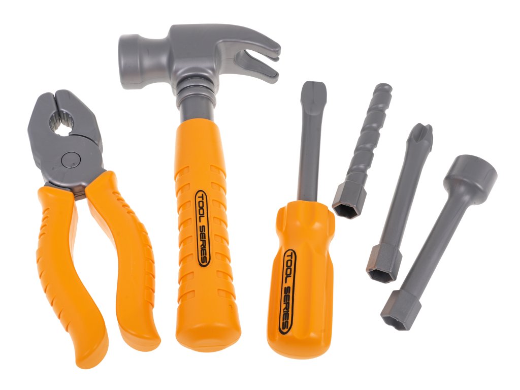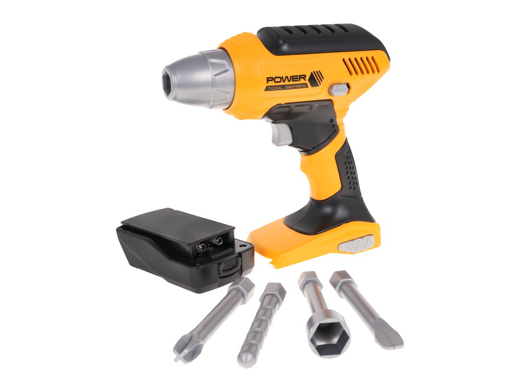 - tool bag, - interactive drill, - interchangeable screwdriver and screwdriver tips: drill, flat tip, cross tip, key tip, - battery powered by 3 x AAA 1.5 V batteries (batteries not included), - screwdriver socket, - angle measure, - box wrench, - wrench, - pliers, - hammer, - 2 smaller elements for screwing in screws, - larger element for screwing in screws, - 3 x screw, - 3 x seals |