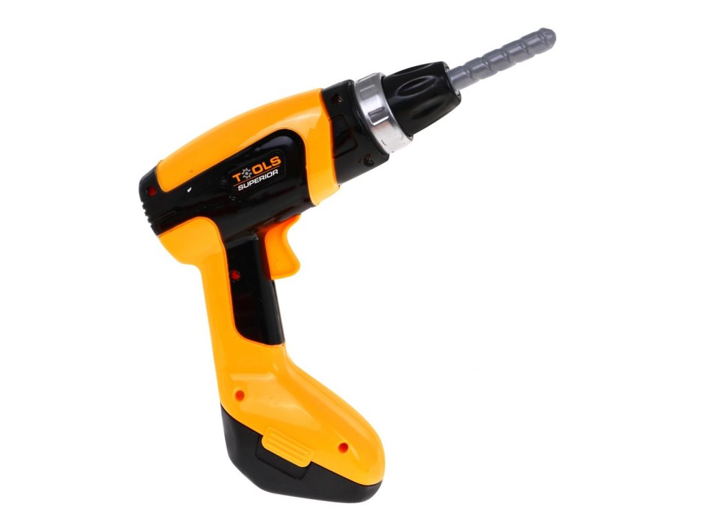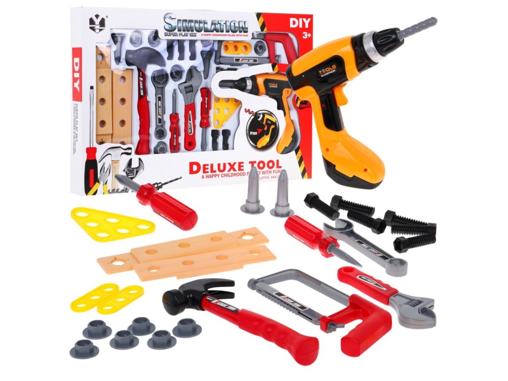 | A set of tools for children from 3 years of age.The set contains 26 elements, everything that is necessary for a small DIY enthusiast: pins, screws, screwdriver, wrenches, hammer, hacksaw and, above all, a drill / driver which is powered by 2 x AA batteries (not included).The tool makes a characteristic noise when screwing in or out. |