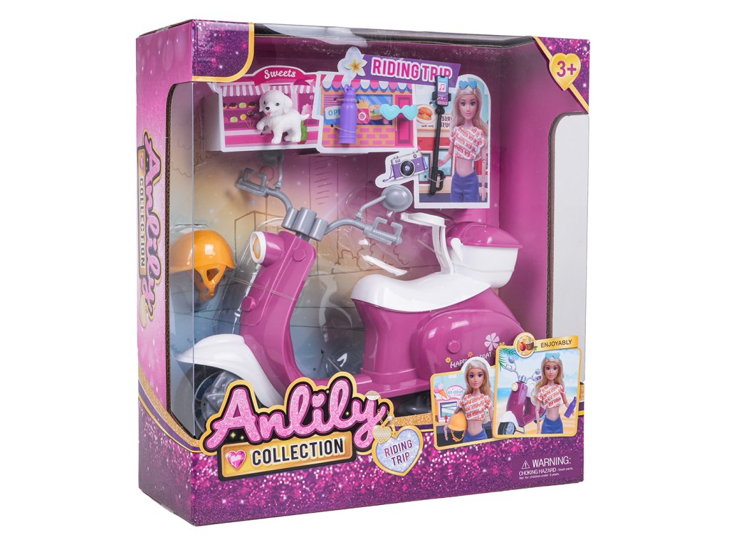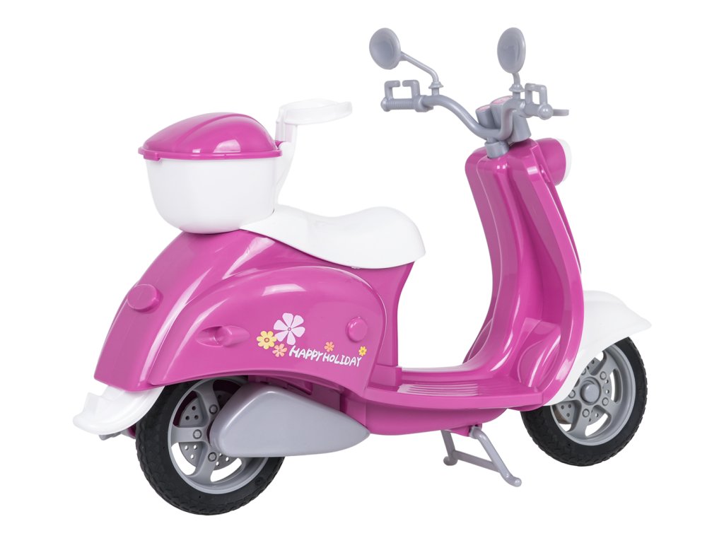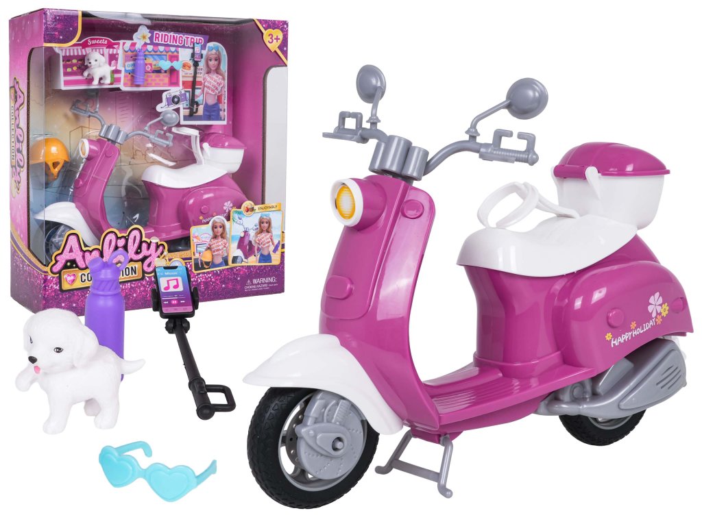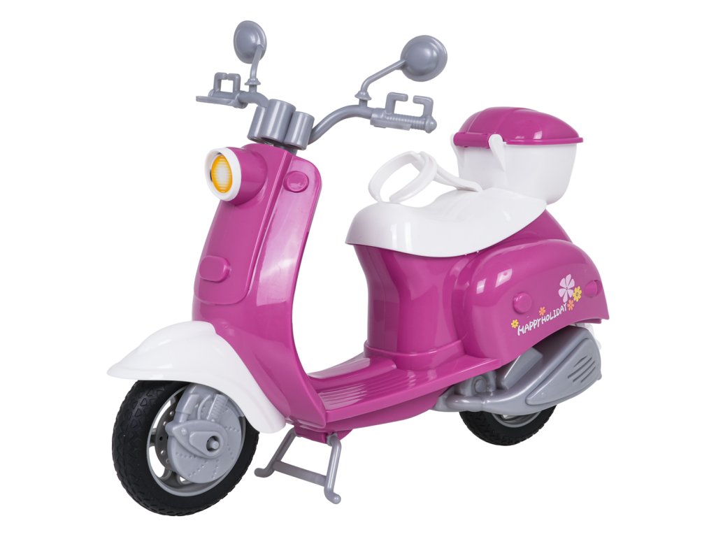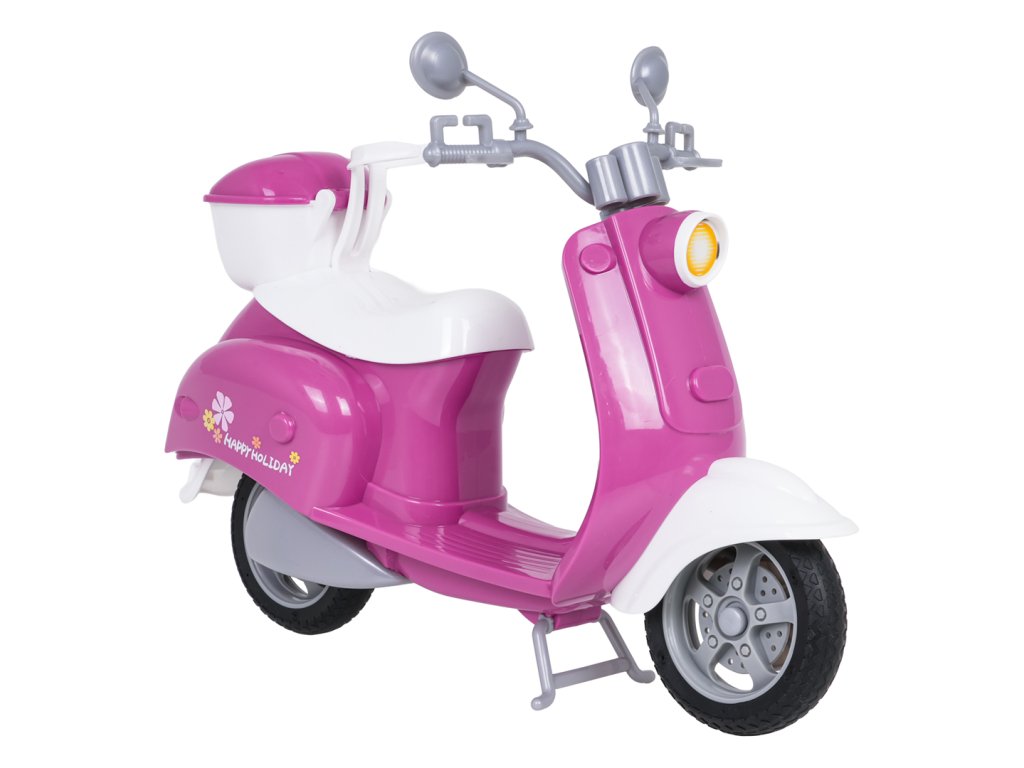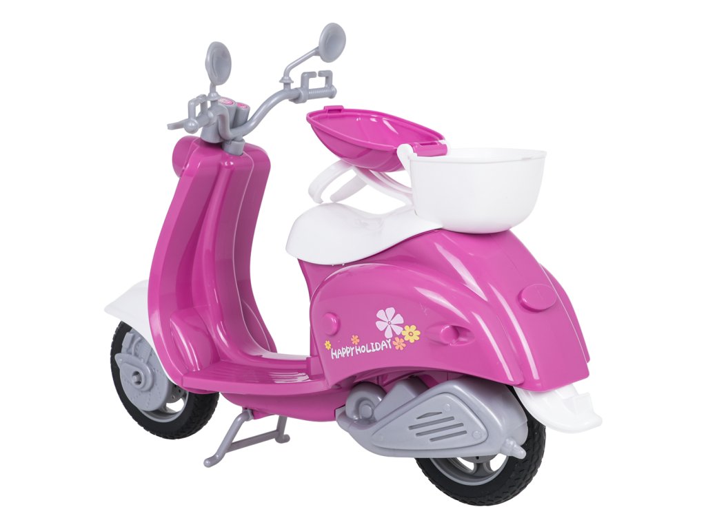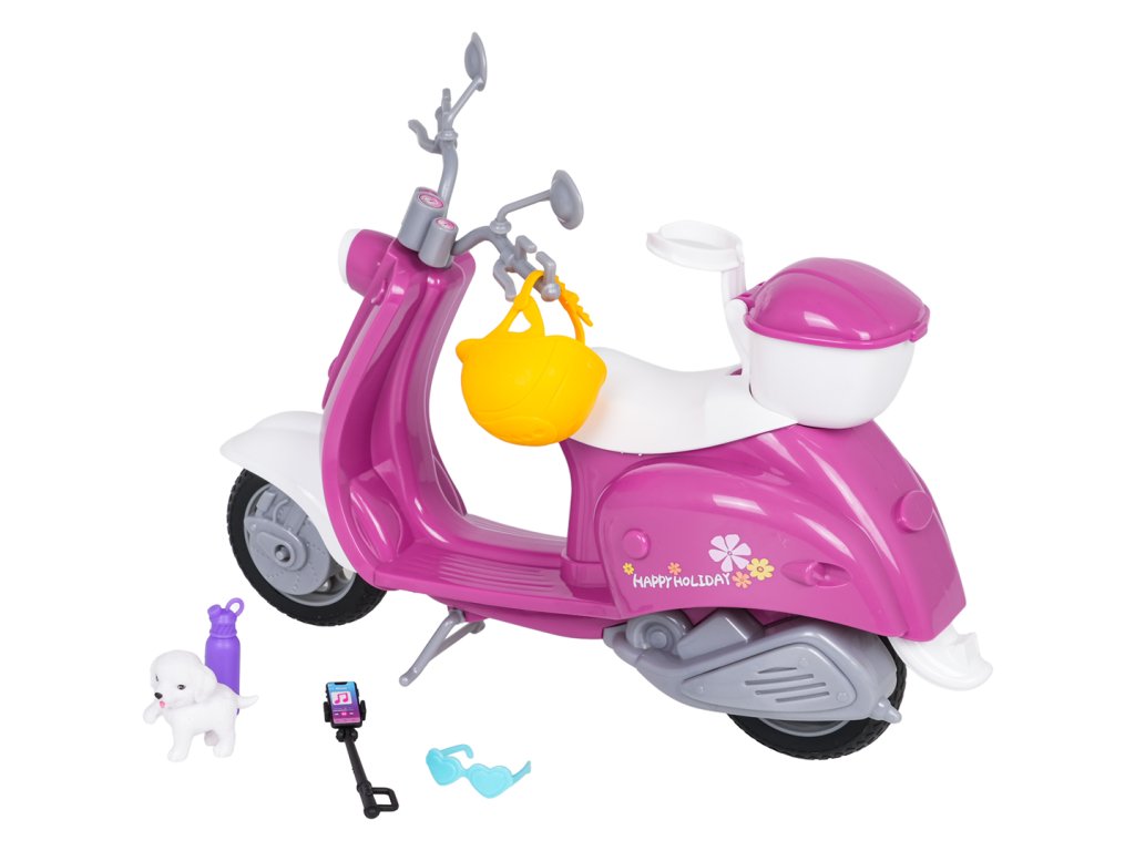 A doll scooter with accessories for children aged three and over. Made of the highest quality materials and vibrant colors, the set is eye-catching and encourages play. The pink and white scooter has a basket on the back for carrying various items, and the set includes a helmet, goggles, a phone holder, a water bottle, and a dog. Features: - set suitable for children over three years of age, - made of the best quality materials in vivid colors, - rubber wheels on the scooter, gripping the ground well, - perfect gift set. |