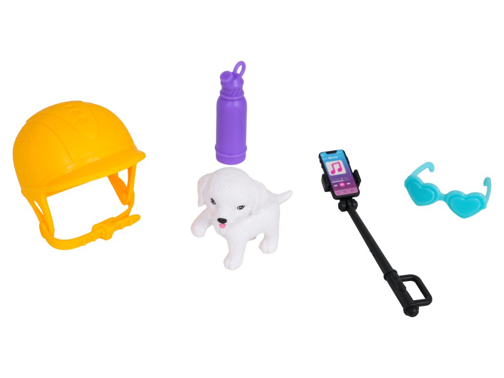 - scooter, - helmet, - glasses, - water bottle, - phone holder with a dummy phone, - dog. |