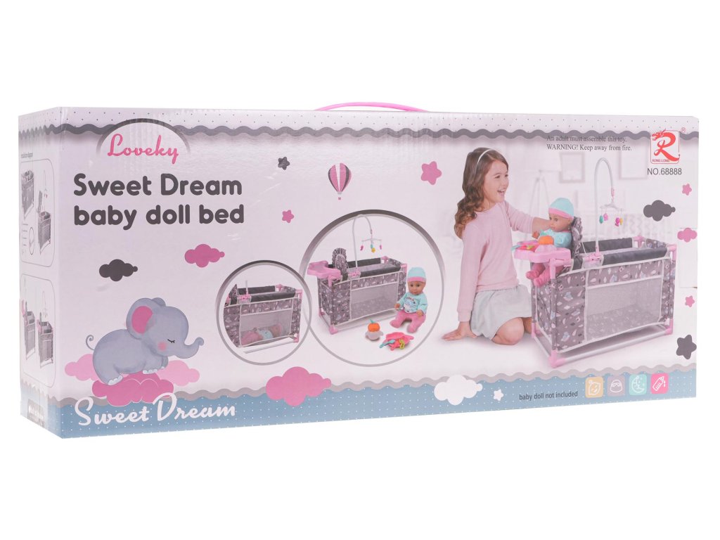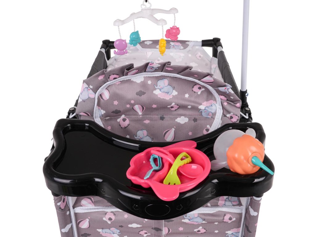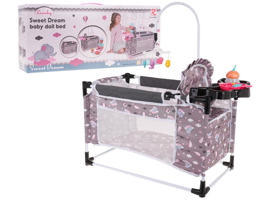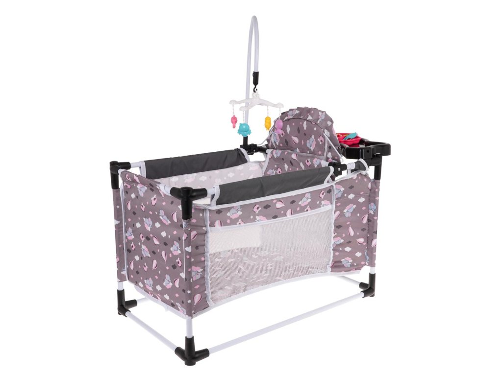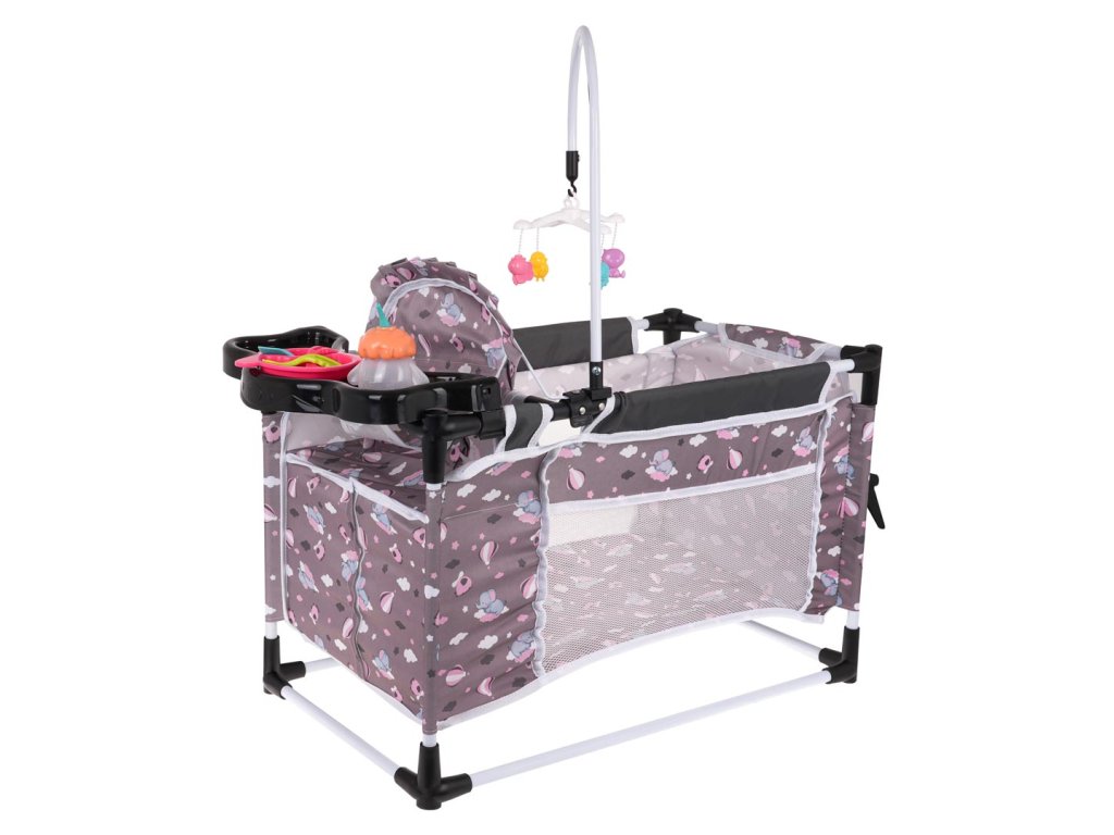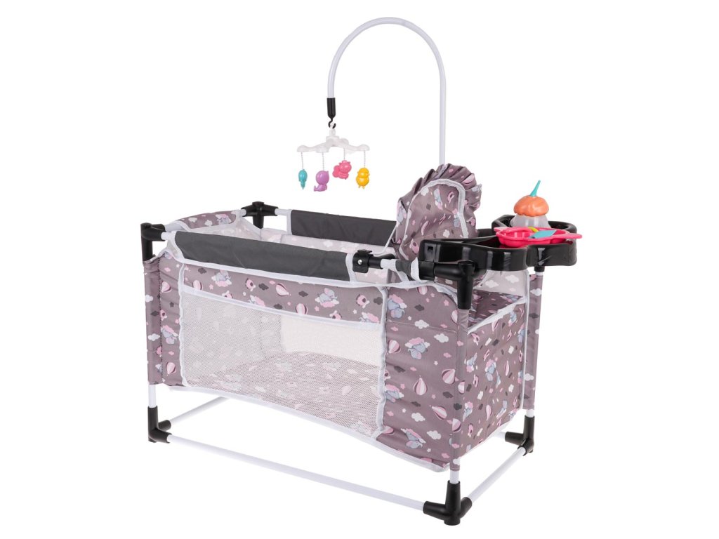 A doll bed with accessories for children from 3 years of age. The set includes a doll bed with a carousel, a high chair and accessories. Each element of the set looks like real baby equipment. Vivid colors attract the child's attention and encourage play. The bed will accommodate a doll with a maximum length of approx. 35 cm.
