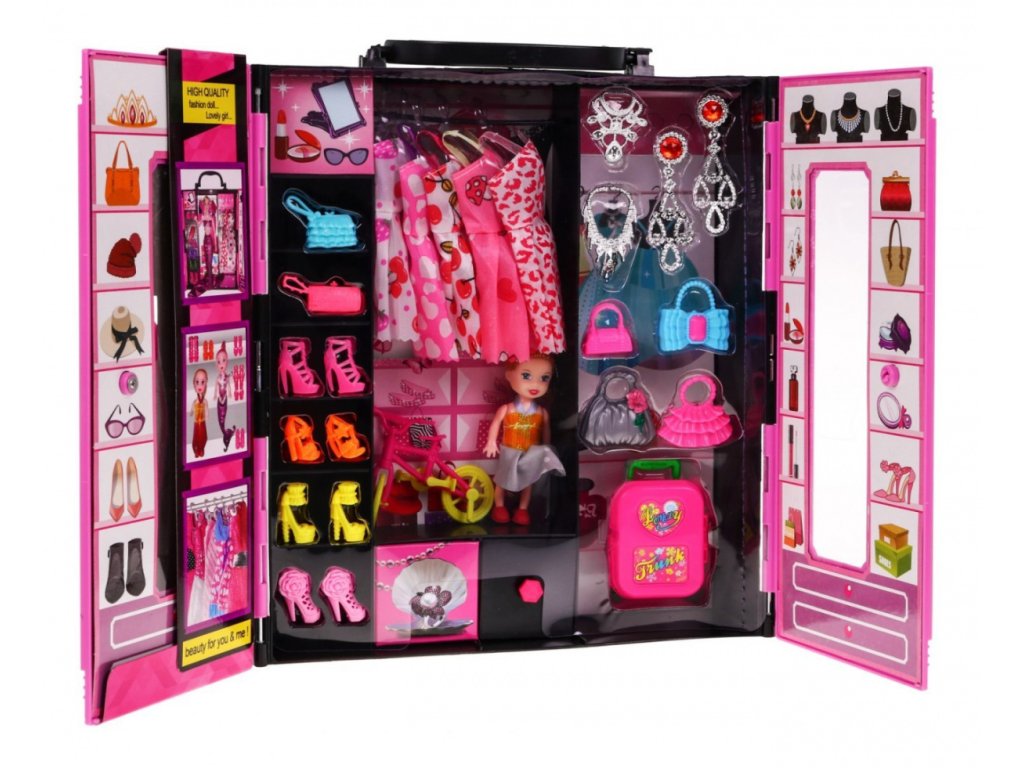 - cabinet around 29 cm x 31 cm x 7 cm, - a doll in a beautiful ball gown about 30 cm x 17 cm, - 6x bag approx. 4 cm x 4 cm larger and approx. 2.5 cm x 2.5 cm smaller, - 4 x shoes approx. 3 cm x 2.5 cm, - opening suitcase approx. 8 cm x 5.5 cm, - a container for small items about 5.5 cm x 5.5 cm, - bicycle about 9 cm x 7 cm, - a small doll about 10 cm x 4 cm, - 5 x dress approx. 14 cm x 6 cm, - 2 x necklace approx. 5 cm x 3 cm, - 2 x earring approx. 8 cm x 2.5 cm | |