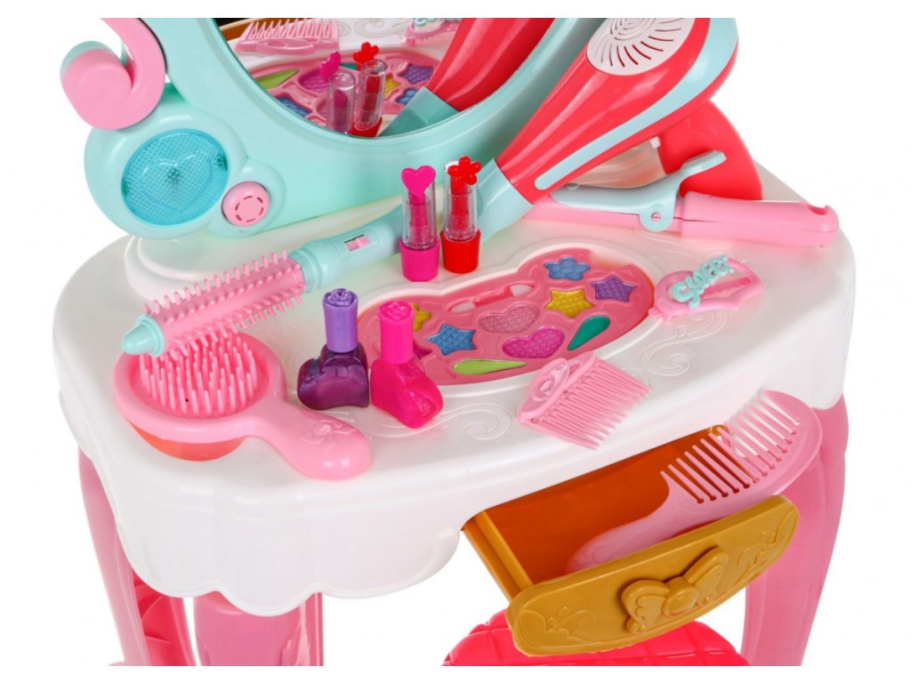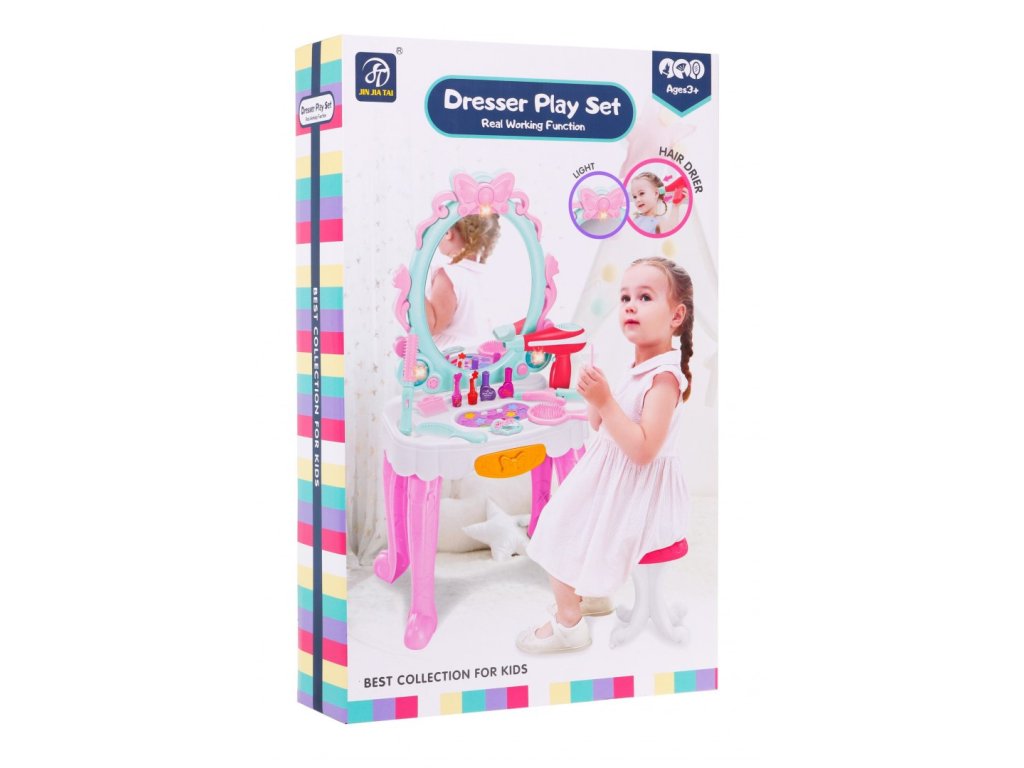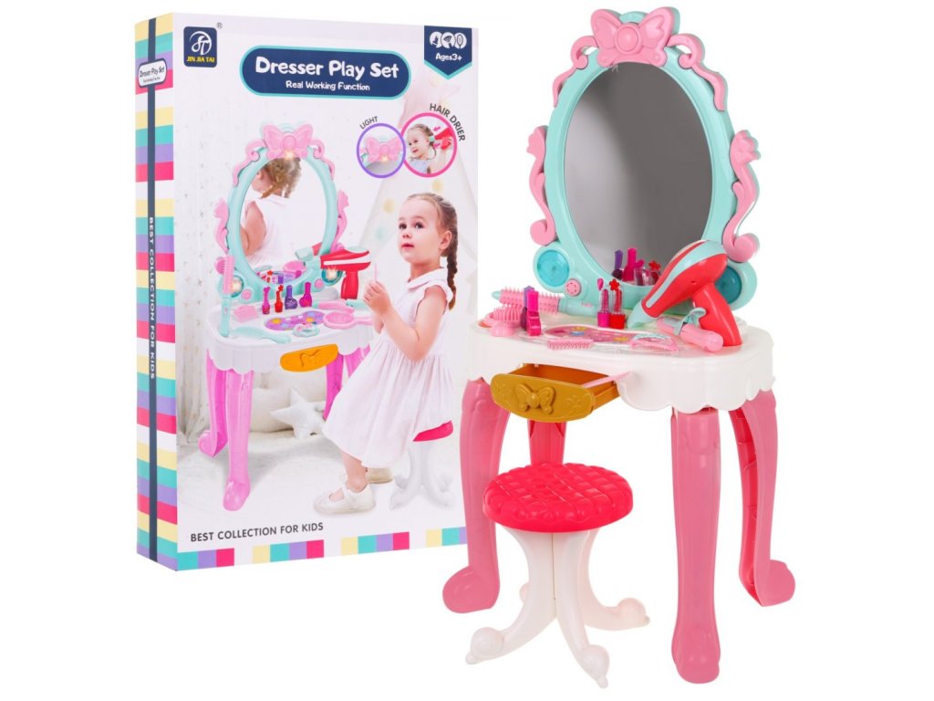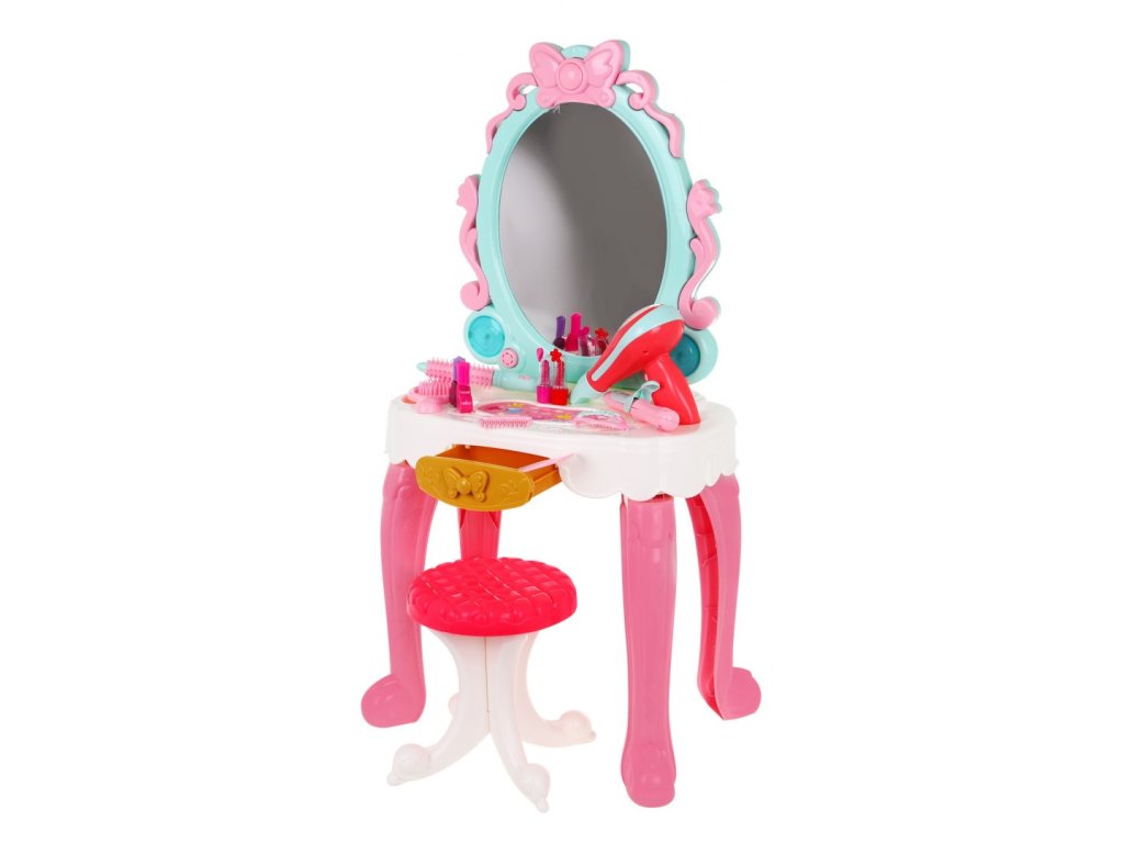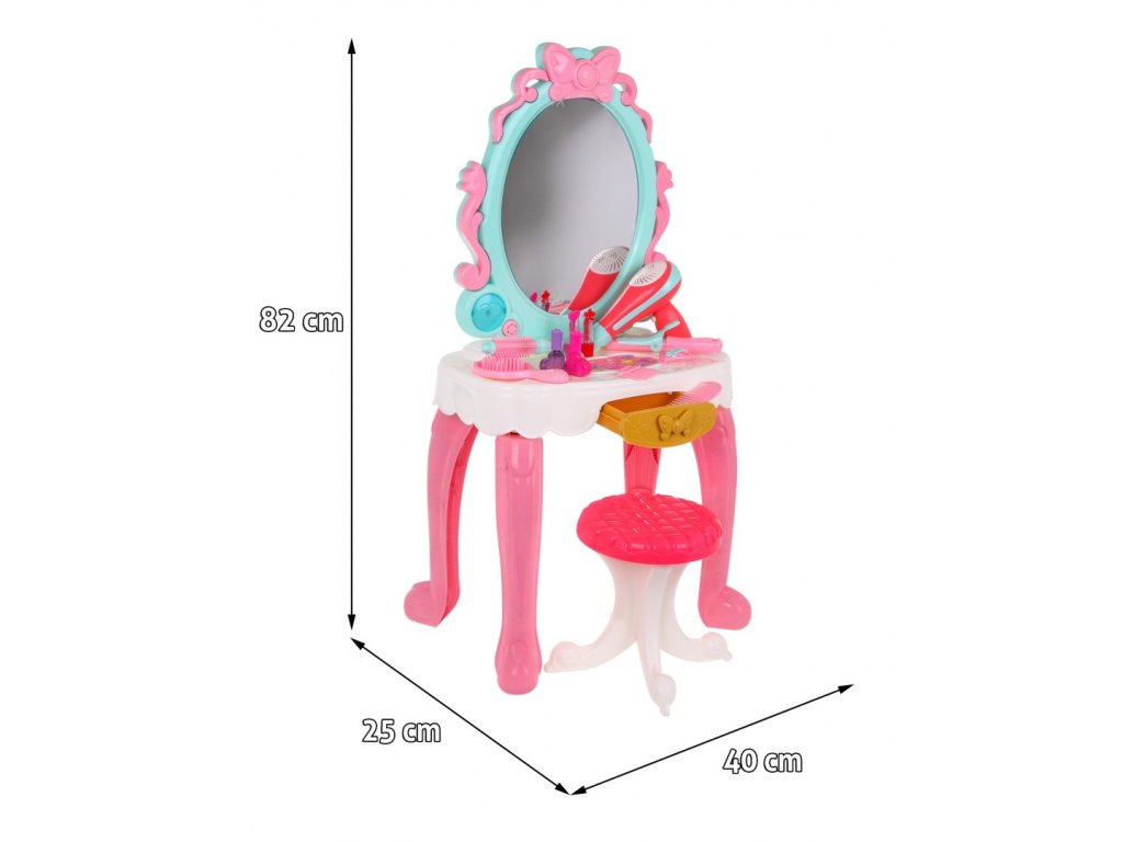 | A richly equipped set of dressing table with accessories and a stool is a proposal for little princesses from the age of 3. The toy has sound and light effects. It is powered by 5 x AA batteries - not included. Kit Features: - lighting at the top and sides of the dressing table, - three background music, - blow dryer, - an opening drawer in the dressing table. |