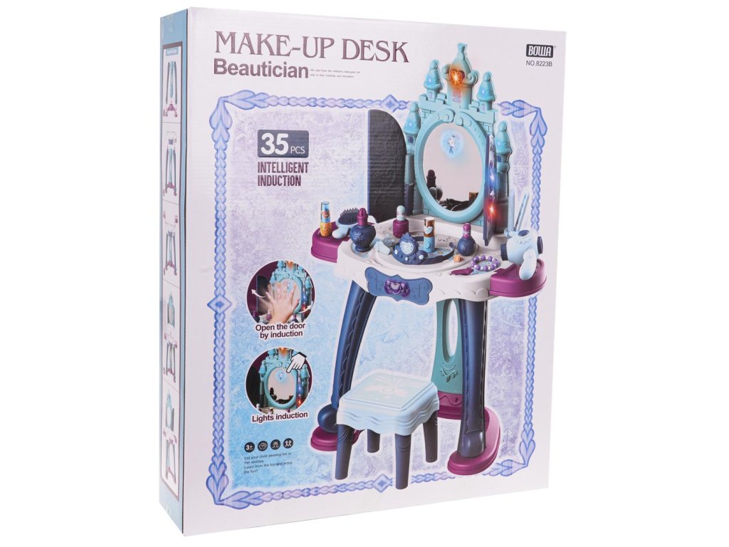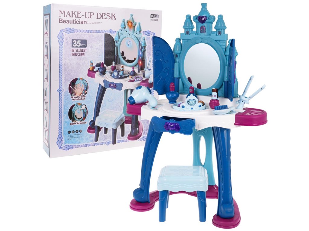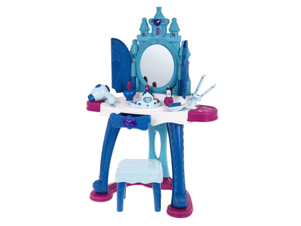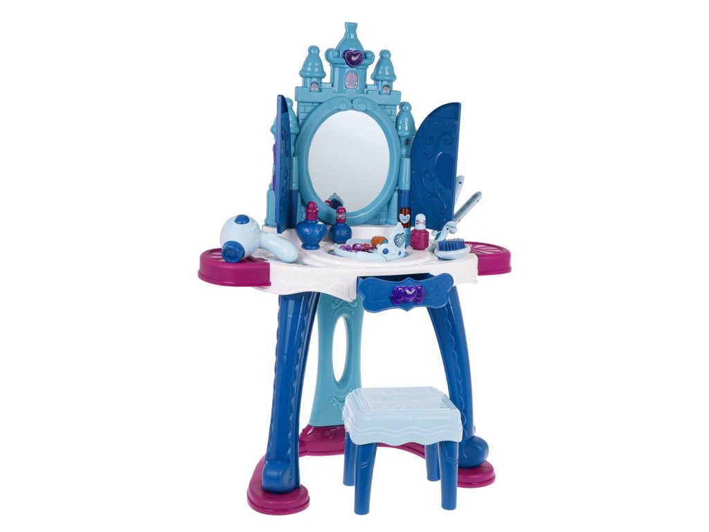 Richly equipped interactive dressing table with light and sound function for children from 3 years of age. The toy is made of the best quality plastic in vivid colors. The dressing table is equipped with a large top, drawer, shelves and a large opening mirror, which has sound effects such as cheerful melodies, and light effects. There is a sensor above the mirror that opens and closes the magic gates to the mirror. Princess figures are displayed on the dressing table mirror. The dressing table comes with a stool and lots of accessories for painting. The dressing table is powered by 3 x AA 1.5 V batteries (batteries not included).